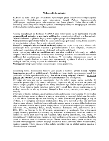 Wskazówki dla autorów KULON od roku 2006 jest rocznikiem wydawanym przez Mazowiecko-Świętokrzyskie Towarzystwo Ornitologiczne oraz Mazowiecki Zespół Parków Krajobrazowych, publikującym oryginalne prace dokumentujące stan fauny głównie Niziny Mazowieckiej i Podlaskiej oraz Krainy Gór Świętokrzyskich. Publikujemy teksty w następujących działach: artykuły, krótkie notatki, sprawozdania, recenzje. Autorzy nadsyłanych do Redakcji KULONA prac zobowiązani są do ujawnienia wkładu poszczególnych autorów w powstanie publikacji, z podaniem ich afiliacji oraz kontrybucji. Odpowiedzialność ta głównie dotyczy autora zgłaszającego tekst do opublikowania. Niedopuszczalne jest dopisywanie do składu autorskiego publikacji osoby, której udział w jej powstaniu jest znikomy lub w ogóle nie miał miejsca. Wszystkie przypadki nierzetelności naukowej wykryte na etapie oceny pracy, lub w czasie późniejszym będą ujawniane włącznie z powiadomieniem o tym instytucji, towarzystw naukowych zatrudniających autorów lub innych podmiotów zależnych. Autor zgłaszający tekst do opublikowania powinien zamieścić informację nt. wkładu instytucji naukowo-badawczej, stowarzyszenia lub innego podmiotu oraz źródle finansowania publikacji lub poinformować o tym Redakcję. W przypadku sfinansowania pracy na wszystkich etapach (badania terenowe oraz opracowanie wyników i tekstu) wyłącznie z własnych środków, należy to podać do wiadomości Redakcji. Wersją pierwotną wydawanego czasopisma jest wersja papierowa. Zasadniczą formą dostarczania tekstów jest poczta e-mailowa (prace należy wysyłać bezpośrednio na adres: [email protected]). Redakcja przyjmuje także maszynopisy, jednak ich przesłanie opóźnia wydrukowanie pracy. Do tekstu należy załączyć Abstrakt w języku polskim (do 200 słów), który powinien zwięźle informować o treści pracy. Używając pierwszy raz nazwy organizmów żywych należy podać nazwę łacińską. W przypadku powtarzającej się nazwy rodzajowej, dopuszcza się jej skracanie do pierwszej litery z kropką jedynie w przypadkach, kiedy znaczenie tego skrótu będzie jednoznaczne. Gdyby Autor podawał także nazwisko autora, który opisał dany takson pamiętajmy, że w zoologii nazwiska te nie są skracane. Wszystkie inne wyrazy obcojęzyczne należy pisać kursywą. Cytowanie w tekście polega na podawaniu nazwiska autora oraz roku wydania. W przypadku kilku prac jednego autora wydanych w jednym roku należy je oznaczyć dodatkowo literami a, b, c itd. Prace cytowane łącznie oddziela się od siebie przecinkami, porządkując je wg lat wydania, a w następnej kolejności alfabetycznie. Przy dwu autorach podaje się nazwiska obydwu, przy większej liczbie tylko nazwisko pierwszego autora oraz et al. Gdy dwaj autorzy mają to samo nazwisko, należy podać inicjały imion. Przykładowa kolejność jest następująca: Żukowski 1990, Adamczyk 1993a, 1993b, Maliniak i Szmaciak 1994, Zemborzycki et al. 1993, 1994, A. Nowak in litt. Cytowania umieszczamy w nawiasach. Spis cytowanych pozycji literatury powinien być ułożony wg kolejności alfabetycznej. Musi on zawierać w kolejności: autora (lub autorów), rok wydania, tytuł, nazwę czasopisma, tom, strony. W przypadku, gdy w jednym tomie numeracja stron każdego zeszytu rozpoczyna się od 1, należy podać po numerze tomu także numer zeszytu. Nazwę czasopisma należy podać skrótowo, wg wykazu obowiązujących skrótów. Pozycje książkowe muszą zawierać nazwę wydawnictwa, miejsce wydania. Teksty pisane cyrylicą należy transliterować na alfabet łaciński zgodnie z obowiązującymi normami. Autorzy tekstów są zobowiązani do wykonania ewentualnych poprawek po recenzji i opracowaniu redakcyjnym oraz poprawienia jednej korekty drukarskiej. Informacje dotyczące gatunków weryfikowanych przez Komisję Faunistyczną Sekcji Ornitologicznej PTZool. muszą uzyskać jej akceptację (należy zamieścić w tekście tę informację). Jako formę wynagrodzenia za włożoną pracę i przyjemność opublikowania tekstu w KULONIE autor otrzymuje plik pdf. W przypadku, gdy praca posiada kilku autorów, plik pdf. otrzymuje jedynie pierwszy z nich. Nazewnictwo ptaków i układ systematyczny wg aktualnie obowiązującego na stronie Komisji Faunistycznej (http://www.komisjafaunistyczna.pl). Tabele powinny być umieszczone w tekście, w miejscu proponowanym przez autora oraz przesłane w oddzielnych plikach. Grubość linii tabeli powinna wynosić 1 pkt., kolor linii – czarny, szerokość tabeli maksymalnie 13 cm. Powołując się na nie w tekście należy stosować skrót "tab.". Ryciny zaopatrzone w podpisy powinny być dostarczane w wersji nadającej się do druku, najlepiej w postaci dobrej jakości odbitki ksero lub zapisane w oddzielnych plikach. Autor rycin powinien uwzględnić, że będą one zmniejszane o około 50%. Ryciny wykonane w CorellDraw, Excel itp. należy drukować na drukarkach laserowych. Ryciny czarno-białe powinny być zapisane jako grafika czarno-biała z rozszerzeniem JPG. Wykresy powinny być wykonane w Excelu i zapisane w oddzielnych plikach lub arkuszach. W przypadku konieczności wykorzystania ryciny pochodzącej z innej publikacji Autor jest zobowiązany do uzyskania zgody pierwotnego autora i wydawcy. Powołując się na ryciny w tekście należy stosować skrót "ryc.". Podpisy do rycin należy załączyć w oddzielnym pliku. Szczegółowe wytyczne dotyczące sposobu formatowania tekstów: Artykuł w dziale głównym powinien być przygotowany wg następujących zasad (w cudzysłowiu podano rozmiar czcionki). 1. imię i nazwisko/nazwiska autorów Napisane kursywą „12” 2. Tytuł pracy NAPISANY DUŻYMI LITERAMI I BOLDEM, NAZWA ŁACIŃSKA W TYTULE POWINNA BYĆ NAPISANA BOLDEM I KURSYWĄ”12” 3. Abstrakt ma zaczynać się od pełnego Imienia i nazwiska napisanego boldem, Tytułu pracy napisanego boldem, wszystko „10”, mile widziany jest Abstract p