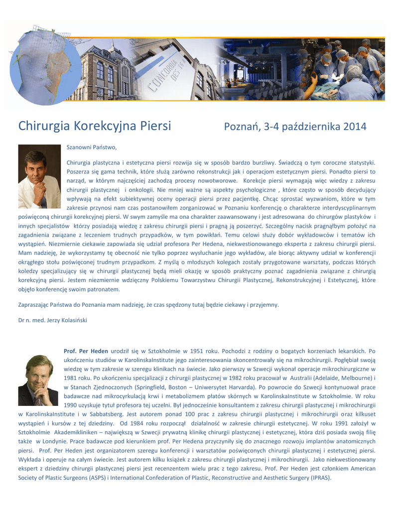 Chirurgia Korekcyjna Piersi Poznań, 3-4 października 2014 Szanowni Państwo, Chirurgia plastyczna i estetyczna piersi rozwija się w sposób bardzo burzliwy. Świadczą o tym coroczne statystyki. Poszerza się gama technik, które służą zarówno rekonstrukcji jak i operacjom estetycznym piersi. Ponadto piersi to narząd, w którym najczęściej zachodzą procesy nowotworowe. Korekcje piersi wymagają więc wiedzy z zakresu chirurgii plastycznej i onkologii. Nie mniej ważne są aspekty psychologiczne , które często w sposób decydujący wpływają na efekt subiektywnej oceny operacji piersi przez pacjentkę. Chcąc sprostać wyzwaniom, które w tym zakresie przynosi nam czas postanowiłem zorganizować w Poznaniu konferencję o charakterze interdyscyplinarnym poświęconą chirurgii korekcyjnej piersi. W swym zamyśle ma ona charakter zaawansowany i jest adresowana do chirurgów plastyków i innych specjalistów którzy posiadają wiedzę z zakresu chirurgii piersi i pragną ją poszerzyć. Szczególny nacisk pragnąłbym położyć na zagadnienia związane z leczeniem trudnych przypadków, w tym powikłań. Temu celowi służy dobór wykładowców i tematów ich wystąpień. Niezmiernie ciekawie zapowiada się udział profesora Per Hedena, niekwestionowanego eksperta z zakresu chirurgii piersi. Mam nadzieję, że wykorzystamy tę obecność nie tylko poprzez wysłuchanie jego wykładów, ale biorąc aktywny udział w konferencji okrągłego stołu poświęconej trudnym przypadkom. Z myślą o młodszych kolegach zostały przygotowane warsztaty, podczas których koledzy specjalizujący się w chirurgii plastycznej będą mieli okazję w sposób praktyczny poznać zagadnienia związane z chirurgią korekcyjną piersi. Jestem niezmiernie wdzięczny Polskiemu Towarzystwu Chirurgii Plastycznej, Rekonstrukcyjnej i Estetycznej, które objęło konferencję swoim patronatem. Zapraszając Państwa do Poznania mam nadzieję, że czas spędzony tutaj będzie ciekawy i przyjemny. Dr n. med. Jerzy Kolasiński Prof. Per Heden urodził się w Sztokholmie w 1951 roku. Pochodzi z rodziny o bogatych korzeniach lekarskich. Po ukończeniu studiów w KarolinskaInstitute jego zainteresowania skoncentrowały się na mikrochirurgii. Pogłębiał swoją wiedzę w tym zakresie w szeregu klinikach na świecie. Jako pierwszy w Szwecji wykonał operacje mikrochirurgiczne w 1981 roku. Po ukończeniu specjalizacji z chirurgii plastycznej w 1982 roku pracował w Australii (Adelaide, Melbourne) i w Stanach Zjednoczonych (Springfield, Boston – Uniwersytet Harvarda). Po powrocie do Szwecji kontynuował prace badawcze nad mikrocyrkulacją krwi i metabolizmem płatów skórnych w KarolinskaInstitute w Sztokholmie. W roku 1990 uzyskuje tytuł profesora tej uczelni. Był jednocześnie konsultantem z zakresu chirurgii plastycznej i mikrochirurgii w KarolinskaInstitute i w Sabbatsberg. Jest autorem ponad 100 prac z zakresu chirurgii plastycznej i mikrochirurgii oraz kilkuset wystąpień i kursów z tej dziedziny. Od 1984 roku rozpoczął działalność w zakresie chirurgii estetycznej. W roku 1991 założył w Sztokholmie Akademikliniken – największą w Szwecji prywatną klinikę chirurgii plastycznej i estetycznej, która dziś posiada swoją filię także w Londynie. Prace badawcze pod kierunkiem prof. Per Hedena przyczyniły się do znacznego rozwoju implantów anatomicznych piersi. Prof. Per Heden jest organizatorem szeregu konferencji i warsztatów poświęconych chirurgii plastycznej i estetycznej piersi. Wykłada i operuje na całym świecie. Jest autorem kilku książek z zakresu chirurgii plastycznej i mikrochirurgii. Jako niekwestionowany ekspert z dziedziny chirurgii plastycznej piersi jest recenzentem wielu prac z tego zakresu. Prof. Per Heden jest członkiem American Society of Plastic Surgeons (ASPS) i International Confederation of Plastic, Reconstructive and Aesthetic Surgery (IPRAS). Planowany program: W dniu 3 października 2014 - warsztaty z zakresu chirurgii korekcyjnej piersi Poziom: podstawowy Uczestnicy: chirurdzy specjalizujący się w chirurgii plastycznej i w chirurgii onkologicznej Miejsce: Klinika Kolasiński, 62-020 Swarzędz, ul. Staszica 20A, tel. 61 8187550, www.klinikakolasinski.pl Język wykładowy: polski W godzinach przedpołudniowych przewidziana jest seria wykładów dydaktycznych obejmujących następujące zagadnienia: anatomia i fizjologia gruczołu piersiowego – Dr hab. n. med. Henryk Witmanowski wskazania do chirurgicznych korekcji piersi – Dr hab. n. med. Jerzy Jankau zabiegi rekonstrukcyjne piersi – Dr n. med. Sławomir Cieśla charakterystyka różnych rodzajów implantów piersiowych – Dr n. med. Małgorzata Kolenda zabiegi powiększania piersi przy użyciu implantów piersiowych – Dr n. med. Jerzy Kolasiński zabiegi powiększania piersi przeszczepem tkanki tłuszczowej – Dr hab. n. med. Bartłomiej Noszczyk zabiegi podniesienia i redukcji piersi – Dr n. med. Jerzy Kolasiński W godzinach popołudniowych przewidziane są zajęcia praktyczne dotyczące doboru implantów piersiowych oraz operacje pokazowe. Wieczór w klubie. W dniu 4 października 2014 - obrady plenarne Poziom: zaawansowany Miejsce: Concordia Design, 60-813 Poznań, ul. Zwierzyniecka 3 Uczestnicy: Lekarze specjaliści chirurgii plastycznej i chirurgii onkologicznej, oraz lekarze specjalizujący się w tych dziedzinach Język wykładowy: polski i angielski (przewidziane jest tłumaczenie symultaniczne) Wstępny program: Najczęstsze przyczyny korekcji piersi - Dr hab. n. med. Jerzy Jankau Profil psychologiczny pacjentek korygujących piersi – mgr. Dominika Kolasińska-Szkutnik Bezpieczeństwo onkologiczne estetycznych zabiegów korekcyjnych piersi – Dr hab. n. med. Dawid Murawa Zasady wyboru implantów piersiowych – Prof. Per Heden Alternatywne metody powiększania piersi – Dr hab. n. med. Bartłomiej Noszczyk Jednoczasowe podniesienie i powiększenie piersi – zalety i pułapki 