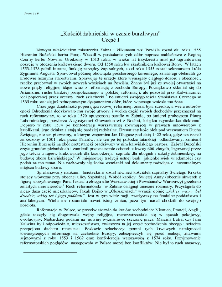 Strona 1 z 9 „Kościół żabnieński w czasie burzliwym” Część I Nowym właścicielem miasteczka Żabna i kilkunastu wsi Powiśla został ok. roku 1555 Hieronim Bużeński herbu Poraj. Wszedł w posiadanie tych dóbr poprzez małżeństwo z Reginą Czerny herbu Nowina. Urodzony w 1513 roku, w wieku lat trzydziestu miał już ugruntowaną pozycję w otoczeniu królewskiego dworu. Od 1550 roku był skarbnikiem królowej Bony. W latach 1553-1578 pełnił intratną funkcję zarządcy żup solnych, a od roku 1555 został sekretarzem króla Zygmunta Augusta. Sprawował później obowiązki podskarbiego koronnego, za zasługi obdarzali go królowie licznymi starostwami. Sprawując te urzędy które wymagały ciągłego dozoru i obecności, rzadko przebywał w swoich nowych włościach na Powiślu. Znany był już ze swojej otwartości na nowe prądy religijne, idące wraz z reformacją z zachodu Europy. Początkowo skłaniał się do Arianizmu, ruchu bardziej prospołecznego w polskiej reformacji, ale pozostał przy Kalwinizmie, idei popieranej przez szerszy ruch szlachecki.1 Po śmierci swojego teścia Stanisława Czernego w 1569 roku stał się już pełnoprawnym dysponentem dóbr, które w posagu wniosła mu żona. Choć jego działalność popierająca rozwój reformacji znana była szeroko, a wielu autorów epoki Odrodzenia dedykowało mu swoje utwory, i wielką część swoich dochodów przeznaczał na ruch reformacyjny, to w roku 1570 opuszczoną parafię w Żabnie, po śmierci proboszcza Piotra Lubomirskiego, powierza Augustynowi Głowaciusowi z Bochni, księdzu rzymsko-katolickiemu2 Dopiero w roku 1574 po konfederacji warszawskiej zrównującej w prawach innowierców z katolikami, jego działania stają się bardziej radykalne. Drewniany kościółek pod wezwaniem Ducha Świętego, nie ten pierwotny, o którym wspomina Jan Długosz pod datą 1422 roku, gdyż ten został zniszczony w 1501 roku przez Tatarów, ale ten po tej pożodze tatarskiej odbudowany, zamienił Hieronim Bużeński na zbór protestancki osadziwszy w nim kalwińskiego pastora. Zabrał Bużeński część gruntów plebańskich i zamienił przeznaczenie odsetek z kwoty 600 złotych, legowanej przez jego teścia u rajców krakowskich dla kaznodzieji, szpitala dla ubogich i szkoły żabnieńskiej, na budowę zboru kalwińskiego.3 W miejscowej tradycji ustnej brak jakichkolwiek wiadomości czy podań na ten temat. Nie zachowały się żadne wzmianki ani dokumenty mówiące o ewentualnym miejscu budowy zboru. Sprofanowany naukami heretyckimi został również kościółek szpitalny Świętego Krzyża stojący wówczas przy obecnej ulicy Szpitalnej. Wokół kaplicy Świętej Anny (obecnie skwerek z figurą ukrzyżowanego Pana Jezusa u zbiegu ulic Warszawskiej i Powstańców Warszawy) grzebano zmarłych innowierców.4 Ruch reformatorski w Żabnie osiągnął znaczne rozmiary. Przystąpiła do niego duża część mieszkańców. Jakub Bojko w „Okruszynach” wyraził opinię „Jakiej wiary był dziedzic, takiej też i jego poddani”. Jest w tym wiele racji, zważywszy na feudalne poddaństwo i analfabetyzm. Wielu nie rozumiało nawet istoty zmian, poza tym nadal chodzili do swojego kościoła. Reformacja w Polsce, w przeciwieństwie do krajów zachodnich: Niemiec, Francji, Anglii, gdzie toczyły się długotrwałe wojny religijne, rozprzestrzeniała się w sposób pokojowy, ewolucyjny. Najbardziej podatni na nowiny wyznaniowe szerzone przez Marcina Lutra, czy Jana Kalwina byli odpowiednio, mieszczaństwo, zwłaszcza ta jej część pochodzenia obcego i szlachta przepojona duchem renesansu. Posłowie szlacheccy, pomni tych krwawych namiętności towarzyszących reformacji na zachodzie Europy, zabezpieczyli się przed reakcją ustawami sejmowymi z roku 1553 i 1562 oraz konfederacją warszawską z 1574 roku. Przyjmowanie reformatorskich poglądów następowało w Polsce raczej bez konfliktów. Nie był to ruch masowy, Strona 2 z 9 mała część społeczeństwa uległa ich wpływom, tworząc ośrodki oddziałujące lokalnie. Król Zygmunt August nigdy nie był doktrynerski w sprawach wiary, co czyniło klimat przychylny dla nowinek wyznaniowych, często przez innowierców haniebnie wykorzystywanych. Więcej emocji i wzburzenia tłumów wywoływała kontrreformacja. Historia podaje przykłady niszczenia zborów, napadów na domy pastorów i tumultów podczas protestanckich ceremonii pogrzebowych. Te wystąpienia przeważnie swawolnej młodzieży mieszczańskiej i studentów uczelni były incydentalne, często po wykryciu sprawców surowo karane. Trwał zbór kalwiński w Żabnie. Zygmunt Ruta podaje nawet przypuszczenie, że istniała szkoła przy zborze. W najbliższej okolicy, również w Otfinowie właściciel większej posesji Tarło był protestanckiego wyznania i po śmierci w kaplicy został pochowany. Nie doszło tam do założenia zboru, a miejscowa ludność nie była przez dziedzica do nowego wyznania agitowana, zresztą doły plebejskie wiernie trwały przy wyznaniu swych ojców. Hieronim Bużeński swoich dwóch synów wychował w duchu reformacji. Starszy Paweł zmarł już w roku 1575 w Wiedniu mając lat dziewiętnaście, gdzie zbolały ojciec mu pomnik nagrobny wystawił. Adam Boniecki w „Herbarzu Polskim” podaje, że przed śmiercią wyzbył się heretyckich błędów. Drugi syn Piotr ożenił się w roku 1579 z Konstancją Myszkowską herbu Jastrzębiec. Ksiądz Florian Jaroszewicz w swoim dziele „Matka Świętych Polska” tak przedstawia Konstancję „Wychowana pilnie w zbytniej aż karności…ćwiczyła się usilnie w czytaniu Pisma Świętego, które prawie na pamięć umiała i zażywała go subtelnie na utwierdzenie heretyckich błędów i fałszów. Miała przyrodzoną miłość bliźniego, bo krzywdy i szkody sobie czynione chętnie odpuszczała, ubogich w potrzebach ratowała. Mając lat siedemnaście dana była w małżeństwo panu Bużeńskiemu staroście dobczyńskiemu jako urodze