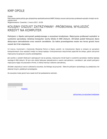 KMP OPOLE Źródło: http://www.opole.policja.gov.pl/opo/kmp-opole/aktualnosci/4697,Kolejny-oszust-zatrzymany-probowal-wyludzic-kredyt-na-ko mputer.html Wygenerowano: Czwartek, 2 marca 2017, 10:59 KOLEJNY OSZUST ZATRZYMANY -PRÓBOWAŁ WYŁUDZIĆ KREDYT NA KOMPUTER Policjanci z Opola zatrzymali podejrzanego o oszustwo kredytowe. Mężczyzna próbował wyłudzić w systemie sprzedaży ratalnej komputer warty blisko 6 000 złotych. 28-latek podał fałszywe dane dotyczące zatrudnienia oraz swoich zarobków. Za takie przestępstwo może mu teraz grozić kara nawet do 8 lat więzienia. 12 marca, kryminalni z Komendy Miejskiej Policji w Opolu ustalili, że mieszkaniec Opola w sklepie ze sprzętem komputerowym chce wyłudzić kredyt na zakup laptopa. Funkcjonariusze natychmiast pojechali do sklepu, gdzie zatrzymali mężczyznę na gorącym uczynku przestępstwa. Jak wynika z ustaleń śledczych zajmujących się tą sprawą, mężczyzna chciał kupić w systemie sprzedaży ratalnej laptopa wartego 6 000 złotych. W tym celu złożył fałszywe oświadczenie o swoim zatrudnieniu i zarobkach. Jak ustalili policjanci mężczyzna nigdy nie pracował w firmie, w której miał być rzekomo zatrudniony. 28-latek usłyszał już zarzut usiłowania oszustwa, do którego się przyznał. Obecnie policjanci sprawdzają czy podejrzany nie dokonał innych, podobnych przestępstw. Za oszustwo może grozić kara nawet do 8 lat pozbawienia wolności. Ocena: 0/5 (0) Tweetnij zatrzymany za oszustwo kredytowe