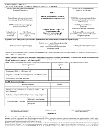MINISTERSTWO ZDROWIA CENTRUM SYSTEMÓW INFORMACYJNYCH OCHRONY ZDROWIA Nazwa i adres podmiotu wykonującego działalność leczniczą. Nazwa i adres przedsiębiorstwa podmiotu leczniczego MZ-14 Roczne sprawozdanie o leczonych w poradni skórno-wenerologicznej Numer księgi rejestrowej podmiotu wykonującego działalność leczniczą. TERYT podmiotu wykonującego działalność leczniczą. Kod podmiotu tworzącego (część III) Przekazać do dnia 2016.02.29 Za pomocą portalu https://ssrmz.csioz.gov.pl/ (z danymi za rok 2015) Kod formy organizacyjno-prawnej (część IV) REGON przedsiębiorstwa podmiotu leczniczego/praktyki zawodowej (14-znakowy) TERYT przedsiębiorstwa podmiotu leczniczego/praktyki zawodowej Rodzaj działalności leczniczej (część VI sytemu resortowych kodów identyfikacyjnych) Wypełniać tylko w przypadku sporządzania sprawozdania oddzielnie dla każdej jednostki organizacyjnej. Nazwa jednostki organizacyjnej Kod resortowy identyfikujący jednostkę organizacyjną (część V systemu resortowych kodów identyfikacyjnych TERYT jednostki organizacyjnej Obowiązek przekazywania danych statystycznych wynika z art. 30 pkt 3 ustawy z dnia 29 czerwca 1995 r. o statystyce publicznej (Dz. U. z 2012 r. poz. 591, z późn. zm.) Podmioty wykonujące działalność leczniczą udzielające ambulatoryjnych specjalistycznych świadczeń zdrowotnych w zakresie chorób przenoszonych drogą płciową wypełniają wszystkie rubryki kodu resortowego zgodnie z decyzją administracyjną organu rejestrowego. Dział 1. Badania serologiczne i mikrobiologiczne Uwaga! W dziale tym wykazujemy tylko badania wykonane dla pacjentów poradni skórno-wenerologicznej (zgodnie z programem badań statystycznych) Wyszczególnienie Ogółem 0 1 Zbadane próbki krwi w kierunku kiły 1 Pacjenci, u których wykonano posiew w kierunku rzeżączki 2 Z wiersza 2 z wynikiem dodatnim 3 Dział 2. Dane uzupełniające Wyszczególnienie Ogółem 0 1 Chorzy na kiłę pozostający w obserwacji w dniu 31 XII roku ubiegłego 1 Kobiety, u których wykryto kiłę w czasie ciąży lub porodu 2 kiły (także podejrzenia) 3 rzeżączki 4 Hospitalizowani z powodu .................................................. (imię, nazwisko i telefon osoby, która sporządziła sprawozdanie) ..................................................... (miejscowość i data) ………...................................................... (imię i nazwisko osoby działającej w imieniu sprawozdawcy) Objaśnienia Podstawą do wypełnienia działu 1 jest księga badań pracowni serologicznej. W dziale 2 w wierszu 1 należy podać dane na podstawie kartoteki czynnej chorych wenerycznie, natomiast w wierszu 2 należy podać dane na podstawie kart wyników badań, oraz kart choroby poradni skórno-wenerologicznej. Dane w wierszach 3 i 4 należy podać na podstawie dokumentacji medycznej, oraz informacji uzyskanych z oddziału dermatologicznego podmiotu wykonującego działalność leczniczą. Dział 3 wypełniają wyłącznie poradnie prowadzące rejestr chorych i osób, które miały kontakty seksualne z chorymi, oraz wojewódzkie przychodnie skórno-wenerologiczne dla osób leczonych wyłącznie w tej przychodni. Rozpoznania należy wpisywać zgodnie z ICD-10. W dziale 3 wiersz 01 jest sumą wierszy 03, 05, 07, 09, 11, 13, 15, 17 i 19; natomiast wiersz 02 jest sumą wierszy 02, 04, 06, 08, 10, 12, 14, 16, 18 i 20. W dziale tym w rubryce 00 występują następujące oznaczenia: M – mężczyźni, K – kobiety. Dział 3. Leczeni po raz pierwszy i pozostający pod obserwacją Kiła Wyszczególnienie wiek płeć 00 Ogółem wrodzona pierwotna (A50(A51.0A50.9) A51.2) 01 02 II okresu wczesna (A51.3a) 03 II okresu nawrotowa (A51.3bA51.4) 04 wczesna utajona (A51.5A51.9) 05 późna inna i nieokreślona (A52.0-A53) 06 Leczenie Leczenie NierzeżączOpryszczka profilakprofilaktyczne kowe Kłykciny narządów Rzeżączka tyczne osób osób nieżyty kończyste płciowych (A54) z kontaktów z kontaktów (A56(A63.0) (A60kiły rzeżączki A56.8) A60.9) 07 08 09 10 M 01 K 02 Poniżej 1 roku M 03 K 04 1-9 lat M 05 K 06 10-14 lat M 07 K 08 15-19 lat M 09 z tego: K 10 20-24 lat M 11 K 12 25-29 lat M 13 K 14 30-44 lat M 15 K 16 45-64 lat M 17 K 18 65 i więcej M 19 K 20 Obciążenie respondentów Proszę podać szacunkowy czas (w minutach) przeznaczony na przygotowanie danych dla potrzeb wypełnienia formularza 1 Proszę podać szacunkowy czas (w minutach) przeznaczony na wypełnienie formularza 2 podpisy na stronie pierwszej 11 12