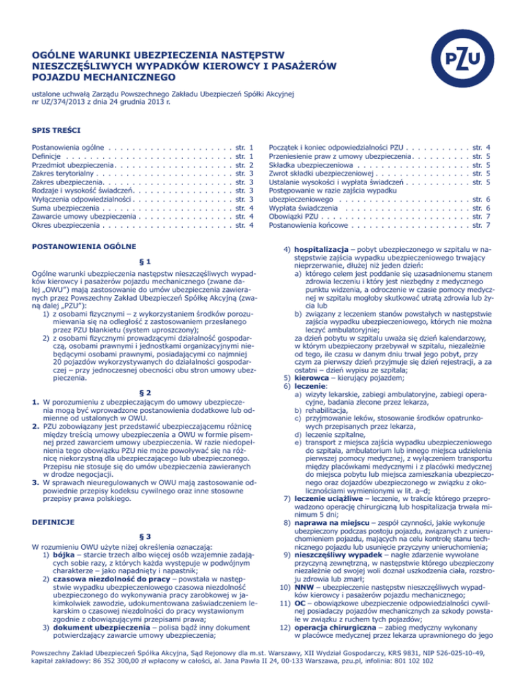 OGÓLNE WARUNKI UBEZPIECZENIA NASTĘPSTW NIESZCZĘŚLIWYCH WYPADKÓW KIEROWCY I PASAŻERÓW POJAZDU MECHANICZNEGO ustalone uchwałą Zarządu Powszechnego Zakładu Ubezpieczeń Spółki Akcyjnej nr UZ/374/2013 z dnia 24 grudnia 2013 r. SPIS TREŚCI Postanowienia ogólne . . . . . . . . . . . . . . . . . . . . . .str. 1 Definicje . . . . . . . . . . . . . . . . . . . . . . . . . . . . .str. 1 Przedmiot ubezpieczenia . . . . . . . . . . . . . . . . . . . .str. 2 Zakres terytorialny . . . . . . . . . . . . . . . . . . . . . . .str. 3 Zakres ubezpieczenia . . . . . . . . . . . . . . . . . . . . . .str. 3 Rodzaje i wysokość świadczeń . . . . . . . . . . . . . . . . .str. 3 Wyłączenia odpowiedzialności . . . . . . . . . . . . . . . . .str. 3 Suma ubezpieczenia . . . . . . . . . . . . . . . . . . . . . .str. 4 Zawarcie umowy ubezpieczenia . . . . . . . . . . . . . . . .str. 4 Okres ubezpieczenia . . . . . . . . . . . . . . . . . . . . . .str. 4 POSTANOWIENIA OGÓLNE §1 Ogólne warunki ubezpieczenia następstw nieszczęśliwych wypadków kierowcy i pasażerów pojazdu mechanicznego (zwane dalej „OWU”) mają zastosowanie do umów ubezpieczenia zawieranych przez Powszechny Zakład Ubezpieczeń Spółkę Akcyjną (zwaną dalej „PZU”): 1) z osobami fizycznymi – z wykorzystaniem środków porozumiewania się na odległość z zastosowaniem przesłanego przez PZU blankietu (system uproszczony); 2) z osobami fizycznymi prowadzącymi działalność gospodarczą, osobami prawnymi i jednostkami organizacyjnymi niebędącymi osobami prawnymi, posiadającymi co najmniej 20 pojazdów wykorzystywanych do działalności gospodarczej – przy jednoczesnej obecności obu stron umowy ubezpieczenia. §2 1. W porozumieniu z ubezpieczającym do umowy ubezpieczenia mogą być wprowadzone postanowienia dodatkowe lub odmienne od ustalonych w OWU. 2. PZU zobowiązany jest przedstawić ubezpieczającemu różnicę między treścią umowy ubezpieczenia a OWU w formie pisemnej przed zawarciem umowy ubezpieczenia. W razie niedopełnienia tego obowiązku PZU nie może powoływać się na różnicę niekorzystną dla ubezpieczającego lub ubezpieczonego. Przepisu nie stosuje się do umów ubezpieczenia zawieranych w drodze negocjacji. 3. W sprawach nieuregulowanych w OWU mają zastosowanie odpowiednie przepisy kodeksu cywilnego oraz inne stosowne przepisy prawa polskiego. DEFINICJE §3 W rozumieniu OWU użyte niżej określenia oznaczają: 1) bójka – starcie trzech albo więcej osób wzajemnie zadających sobie razy, z których każda występuje w podwójnym charakterze – jako napadnięty i napastnik; 2) c zasowa niezdolność do pracy – powstała w następstwie wypadku ubezpieczeniowego czasowa niezdolność ubezpieczonego do wykonywania pracy zarobkowej w jakimkolwiek zawodzie, udokumentowana zaświadczeniem lekarskim o czasowej niezdolności do pracy wystawionym zgodnie z obowiązującymi przepisami prawa; 3) dokument ubezpieczenia – polisa bądź inny dokument potwierdzający zawarcie umowy ubezpieczenia; Początek i koniec odpowiedzialności PZU . . . . . . . . . . .str. 4 Przeniesienie praw z umowy ubezpieczenia . . . . . . . . . .str. 5 Składka ubezpieczeniowa . . . . . . . . . . . . . . . . . . . .str. 5 Zwrot składki ubezpieczeniowej . . . . . . . . . . . . . . . .str. 5 Ustalanie wysokości i wypłata świadczeń . . . . . . . . . . .str. 5 Postępowanie w razie zajścia wypadku ubezpieczeniowego . . . . . . . . . . . . . . . . . . . . . . .str. 6 Wypłata świadczenia . . . . . . . . . . . . . . . . . . . . . .str. 6 Obowiązki PZU . . . . . . . . . . . . . . . . . . . . . . . . .str. 7 Postanowienia końcowe . . . . . . . . . . . . . . . . . . . .str. 7 4) hospitalizacja – pobyt ubezpieczonego w szpitalu w następstwie zajścia wypadku ubezpieczeniowego trwający nieprzerwanie, dłużej niż jeden dzień: a)którego celem jest poddanie się uzasadnionemu stanem zdrowia leczeniu i który jest niezbędny z medycznego punktu widzenia, a odroczenie w czasie pomocy medycznej w szpitalu mogłoby skutkować utratą zdrowia lub życia lub b)związany z leczeniem stanów powstałych w następstwie zajścia wypadku ubezpieczeniowego, których nie można leczyć ambulatoryjnie; za dzień pobytu w szpitalu uważa się dzień kalendarzowy, w którym ubezpieczony przebywał w szpitalu, niezależnie od tego, ile czasu w danym dniu trwał jego pobyt, przy czym za pierwszy dzień przyjmuje się dzień rejestracji, a za ostatni – dzień wypisu ze szpitala; 5) kierowca – kierujący pojazdem; 6) leczenie: a)wizyty lekarskie, zabiegi ambulatoryjne, zabiegi operacyjne, badania zlecone przez lekarza, b)rehabilitacja, c)przyjmowanie leków, stosowanie środków opatrunkowych przepisanych przez lekarza, d)leczenie szpitalne, e)transport z miejsca zajścia wypadku ubezpieczeniowego do szpitala, ambulatorium lub innego miejsca udzielenia pierwszej pomocy medycznej, z wyłączeniem transportu między placówkami medycznymi i z placówki medycznej do miejsca pobytu lub miejsca zamieszkania ubezpieczonego oraz dojazdów ubezpieczonego w związku z okolicznościami wymienionymi w lit. a–d; 7) leczenie uciążliwe – leczenie, w trakcie którego przeprowadzono operację chirurgiczną lub hospitalizacja trwała minimum 5 dni; 8) naprawa na miejscu – zespół czynności, jakie wykonuje ubezpieczony podczas postoju pojazdu, związanych z unieruchomieniem pojazdu, mających na celu kontrolę stanu technicznego pojazdu lub usunięcie przyczyny unieruchomienia; 9) nieszczęśliwy wypadek – nagłe zdarzenie wywołane przyczyną zewnętrzną, w następstwie którego ubezpieczony niezależnie od swojej woli doznał uszkodzenia ciała, rozstroju zdrowia lub zmarł; 10) NNW – ubezpieczenie następstw nieszczęśliwych wypadków kierowcy i pasażerów pojazdu mechanicznego; 11) OC – obowiązkowe ubezpieczenie odpowiedzialności cywilnej posiadaczy pojazdów mechanicznych za szkody powstałe w związku z ruchem t
