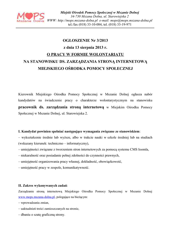 Miejski Ośrodek Pomocy Społecznej w Mszanie Dolnej 34-730 Mszana Dolna, ul. Starowiejska 2 WWW: http://mops.mszana-dolna.pl e-mail: [email protected] tel./fax (018) 33-10-084, tel. (018) 33-19-971 OGŁOSZENIE Nr 3/2013 z dnia 13 sierpnia 2013 r. O PRACY W FORMIE WOLONTARIATU NA STANOWISKU DS. ZARZĄDZANIA STRONĄ INTERNETOWĄ MIEJSKIEGO OŚRODKA POMOCY SPOŁECZNEJ Kierownik Miejskiego Ośrodka Pomocy Społecznej w Mszanie Dolnej ogłasza nabór kandydatów na świadczenie pracy o charakterze wolontarystycznym na stanowisku pracownik ds. zarządzania stroną internetową w Miejskim Ośrodku Pomocy Społecznej w Mszanie Dolnej, ul. Starowiejska 2. I. Kandydat powinien spełniać następujące wymagania związane ze stanowiskiem: – wykształcenie średnie lub wyższe, albo w trakcie nauki w szkole średniej lub na studiach (wskazany kierunek: techniczno – informatyczny), – umiejętności związane z tworzeniem stron internetowych za pomocą systemu CMS Ioomla, – niekaralność oraz posiadanie pełnej zdolności do czynności prawnych, – umiejętność organizowania pracy własnej, dokładność, obowiązkowość, – umiejętność pracy w zespole, komunikatywność. II. Zakres wykonywanych zadań: Zarządzanie stroną internetową Miejskiego Ośrodka Pomocy Społecznej w Mszanie Dolnej www.mops.mszana-dolna.pl, polegające na bieżącym: – wprowadzaniu zmian, – uaktualnień treści zamieszczanych na stronie, – dbaniu o szatę graficzną strony. Miejski Ośrodek Pomocy Społecznej w Mszanie Dolnej 34-730 Mszana Dolna, ul. Starowiejska 2 WWW: http://mops.mszana-dolna.pl e-mail: [email protected] tel./fax (018) 33-10-084, tel. (018) 33-19-971 III. Wymagane dokumenty: – wniosek kandydata o podjęcie współpracy w formie wolontariatu, – życiorys (CV) z uwzględnieniem przebiegu kariery zawodowej, – kopie dokumentu potwierdzające wykształcenie, – kopia ostatniego świadectwa pracy, – zaświadczenie o kontynuowaniu nauki, – referencje dotychczasowych pracodawców, jeśli kandydat takie posiada, – oświadczenie kandydata o korzystaniu z pełni praw publicznych i o niekaralności za przestępstwa popełnione umyślnie oraz o nie toczeniu się przeciwko niemu postępowania karnego. Dokumenty można składać: – osobiście w Miejskim Ośrodku Pomocy Społecznej w Mszanie Dolnej ul. Starowiejska 2 tel. 18 33-10-084 – drogą elektroniczną na adres e-mail: [email protected]