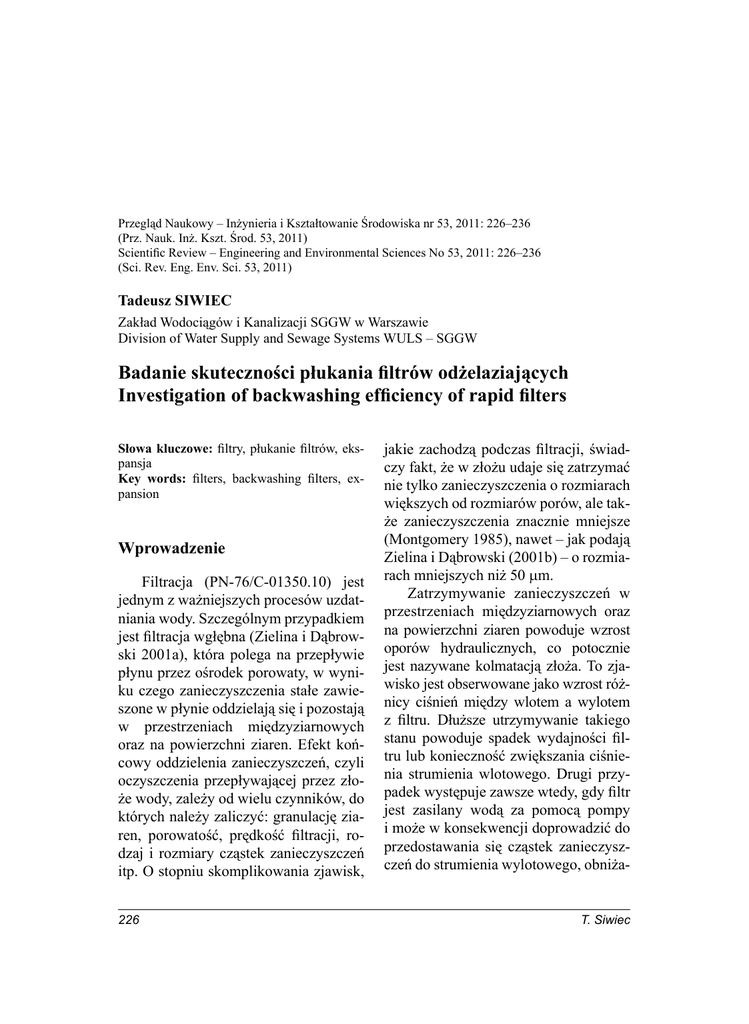 Przegląd Naukowy – Inżynieria i Kształtowanie Środowiska nr 53, 2011: 226–236 (Prz. Nauk. Inż. Kszt. Środ. 53, 2011) Scientific Review – Engineering and Environmental Sciences No 53, 2011: 226–236 (Sci. Rev. Eng. Env. Sci. 53, 2011) Tadeusz SIWIEC Zakład Wodociągów i Kanalizacji SGGW w Warszawie Division of Water Supply and Sewage Systems WULS – SGGW Badanie skuteczności płukania filtrów odżelaziających Investigation of backwashing efficiency of rapid filters Słowa kluczowe: filtry, płukanie filtrów, ekspansja Key words: filters, backwashing filters, expansion Wprowadzenie Filtracja (PN-76/C-01350.10) jest jednym z ważniejszych procesów uzdatniania wody. Szczególnym przypadkiem jest filtracja wgłębna (Zielina i Dąbrowski 2001a), która polega na przepływie płynu przez ośrodek porowaty, w wyniku czego zanieczyszczenia stałe zawieszone w płynie oddzielają się i pozostają w przestrzeniach międzyziarnowych oraz na powierzchni ziaren. Efekt końcowy oddzielenia zanieczyszczeń, czyli oczyszczenia przepływającej przez złoże wody, zależy od wielu czynników, do których należy zaliczyć: granulację ziaren, porowatość, prędkość filtracji, rodzaj i rozmiary cząstek zanieczyszczeń itp. O stopniu skomplikowania zjawisk, 226 jakie zachodzą podczas filtracji, świadczy fakt, że w złożu udaje się zatrzymać nie tylko zanieczyszczenia o rozmiarach większych od rozmiarów porów, ale także zanieczyszczenia znacznie mniejsze (Montgomery 1985), nawet – jak podają Zielina i Dąbrowski (2001b) – o rozmiarach mniejszych niż 50 μm. Zatrzymywanie zanieczyszczeń w przestrzeniach międzyziarnowych oraz na powierzchni ziaren powoduje wzrost oporów hydraulicznych, co potocznie jest nazywane kolmatacją złoża. To zjawisko jest obserwowane jako wzrost różnicy ciśnień między wlotem a wylotem z filtru. Dłuższe utrzymywanie takiego stanu powoduje spadek wydajności filtru lub konieczność zwiększania ciśnienia strumienia wlotowego. Drugi przypadek występuje zawsze wtedy, gdy filtr jest zasilany wodą za pomocą pompy i może w konsekwencji doprowadzić do przedostawania się cząstek zanieczyszczeń do strumienia wylotowego, obniża- T. Siwiec jąc skuteczność uzdatniania wody. Takie zjawisko jest nazywane „przebiciem filtru”. Metodą na przywrócenie początkowych własności jest wypłukanie złoża. Istota procesu płukania Płukanie jest realizowane przez wywołanie strumienia przepływu wody w kierunku odwrotnym do kierunku filtracji (w klasycznych filtrach pospiesznych z dołu do góry) i usunięcie zdeponowanych w złożu zanieczyszczeń. Analiza zjawiska polega na założeniu występowania równowagi układu sił, co pokazano na rysunku 1. W F G RYSUNEK 1. Schemat sił działających na ziarno złoża podczas płukania FIGURE 1. Forces which are acting on beds particle during backwashing Na każde ziarno złoża zanurzone w wodzie działają skierowane przeciwnie dwie siły – siła ciężkości (G) i siła wyporu (W). Gdy siła ciężkości jest większa od siły wyporu, wtedy złoże spoczywa na ruszcie. Jeśli rozpoczyna się płukanie, to wówczas dochodzi siła dynamiczna (F), wynikająca z przepływu strumienia wody do góry. Wzrost siły dynamicznej powoduje, że ciężar pozorny zmniejsza się i przy odpowiedniej wartości siły F może dojść do zrównania siły ciężkości z sumą siły wyporu i siły dynamicznej. Wówczas złoże staje się nieważkie i od tej chwili każdy wzrost prędkości strumienia płucznego przekłada się na wzrost siły F i w konsekwencji na ekspansję złoża. Bardziej precyzyjnie opis tych zjawisk został przedstawiony na rysunku 2. Na osi poziomej przedstawiono prędkość płukania, natomiast na osi pionowej – straty ciśnienia (rys. 2). Wyobraźmy sobie, że po uruchomieniu pompy płucznej powoli jest otwierany zawór, dzięki czemu powoli wzrasta prędkość płukania. Początkowo siła dynamiczna jest mała, dlatego złoże spoczywa na ruszcie i warstwie podtrzymującej. Straty ciśnienia są opisywane funkcją liniową – przy małych prędkościach przepływu (V), a funkcją kwadratową o ogólnej postaci ∆p = f(V) – przy większych, natomiast porowatość złoża jest równa porowatości złoża w stanie spoczynku (ε0). Zwiększając sukcesywnie prędkość przepływu, a co za tym idzie – zwiększając siłę dynamiczną (F), dochodzi się do punktu, w którym siła ta razem z wyporem równoważy ciężar ziaren i złoże staje się nieważkie. Punkt ten nazywany jest początkiem fluidyzacji (upłynnienia złoża) lub punktem minimum fluidyzacji (mf) i oznaczany jest trzema wielkościami: V = Vmf, ε = εmf i Δp = f(Vmf). Od tego punktu dalsze zwiększanie prędkości strumienia płucznego skutkuje zwiększaniem ekspansji złoża, czyli zwiększaniem przestrzeni między ziarnami (porowatości), którą można zapisać jako ε = f(V), a nie skutkuje zmianami strat ciśnienia, które są stałe Δp = const, gdyż zwiększanie prędkości płukania przekłada się Badanie skuteczności płukania filtrów odżelaziających 227 V = Vm ε = εmf Δp = f(Vmf) strata ciĞnienia Δp head loss V > Vmf ε = f(V) Δp = const V < Vmf ε = ε0 Δp = f(V) prĊdkoĞü páukania V backwashing velocity rotacja ziaren grains rotataion RYSUNEK 2. Zobrazowanie zjawisk zachodzących podczas płukania złoża (Orzechowski 1990) FIGURE 2. Presentation of backwashing phenomena in filtration bed nie na wzrost strat, lecz na zwiększanie się przekroju poprzecznego kanałów przepływowych. Granicznym punktem zwiększania prędkości (V), a co za tym idzie – ekspansji złoża, jest zbliżanie się drobnych ziaren do krawędzi przelewu połączonego z rurą wylotową z filtra. Przekroczenie tej granicy skutkuje „ucieczką” drobnych frakcji złoża do kanalizacji. Może być zastanawiające, dlaczego w okolicach punktu minimum fluidyzacji występuje „garbik”, powyżej którego str