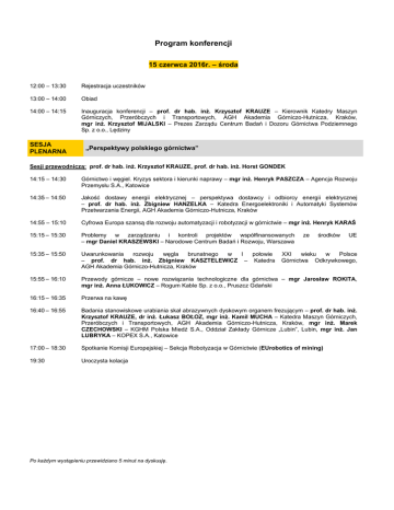 Program konferencji 15 czerwca 2016r. – środa 12:00 – 13:30 Rejestracja uczestników 13:00 – 14:00 Obiad 14:00 – 14:15 Inauguracja konferencji – prof. dr hab. inż. Krzysztof KRAUZE – Kierownik Katedry Maszyn Górniczych, Przeróbczych i Transportowych, AGH Akademia Górniczo-Hutnicza, Kraków, mgr inż. Krzysztof MIJALSKI – Prezes Zarządu Centrum Badań i Dozoru Górnictwa Podziemnego Sp. z o.o., Lędziny SESJA PLENARNA „Perspektywy polskiego górnictwa” Sesji przewodniczą: prof. dr hab. inż. Krzysztof KRAUZE, prof. dr hab. inż. Horst GONDEK 14:15 – 14:30 Górnictwo i węgiel. Kryzys sektora i kierunki naprawy – mgr inż. Henryk PASZCZA – Agencja Rozwoju Przemysłu S.A., Katowice 14:35 – 14:50 Jakość dostawy energii elektrycznej – perspektywa dostawcy i odbiorcy energii elektrycznej – prof. dr hab. inż. Zbigniew HANZELKA – Katedra Energoelektroniki i Automatyki Systemów Przetwarzania Energii, AGH Akademia Górniczo-Hutnicza, Kraków 14:55 – 15:10 Cyfrowa Europa szansą dla rozwoju automatyzacji i robotyzacji w górnictwie – mgr inż. Henryk KARAŚ 15:15 – 15:30 Problemy w zarządzaniu i kontroli projektów współfinansowanych – mgr Daniel KRASZEWSKI – Narodowe Centrum Badań i Rozwoju, Warszawa 15:35 – 15:50 Uwarunkowania rozwoju węgla brunatnego w I połowie – prof. dr hab. inż. Zbigniew KASZTELEWICZ – Katedra AGH Akademia Górniczo-Hutnicza, Kraków 15:55 – 16:10 Przewody górnicze – nowe rozwiązania technologiczne dla górnictwa – mgr Jarosław ROKITA, mgr inż. Anna ŁUKOWICZ – Rogum Kable Sp. z o.o., Pruszcz Gdański 16:15 – 16:35 Przerwa na kawę 16:40 – 16:55 Badania stanowiskowe urabiania skał abrazywnych dyskowym organem frezującym – prof. dr hab. inż. Krzysztof KRAUZE, dr inż. Łukasz BOŁOZ, mgr inż. Kamil MUCHA – Katedra Maszyn Górniczych, Przeróbczych i Transportowych, AGH Akademia Górniczo-Hutnicza, Kraków, mgr inż. Marek CZECHOWSKI – KGHM Polska Miedź S.A., Oddział Zakłady Górnicze „Lubin”, Lubin, mgr inż. Jan LUBRYKA – KOPEX S.A., Katowice 17:00 – 18:30 Spotkanie Komisji Europejskiej – Sekcja Robotyzacja w Górnictwie (EUrobotics of mining) 19:30 Uroczysta kolacja Po każdym wystąpieniu przewidziano 5 minut na dyskusję. ze środków UE XXI wieku w Polsce Górnictwa Odkrywkowego, 16 czerwca 2016r. – czwartek 8:00 – 8:45 SESJA I A Śniadanie „Najnowsze wymagania w przemyśle maszynowym” Sesji przewodniczą: mgr inż. Marek Trajdos, mgr inż. Mariusz Łukaszyński 9:00 – 9:30 Nowy system oceny zgodności wyrobów – zmiany wynikające z ustawy z dnia 13 kwietnia 2016 r. o systemach oceny zgodności i nadzoru rynku – mgr Małgorzata Kacprzyk – Wydział Prawa Technicznego, Ministerstwo Rozwoju 9:45 – 10:05 Najważniejsze zmiany wynikające z nowej dyrektywy niskonapięciowej LVD – mgr inż. Marek TRAJDOS – Cert Partner Sp. z o.o. Sp.k., Opole; LUC – CE CONSULTING, Opole; DAMET Sp. J. Dańko, Jaksina, Chwaszczyno 10:10 – 10:30 Odpowiedzialność z zakresu prawa pracy w aspekcie bezpieczeństwa maszyn podlegających wymaganiom zasadniczym – dr inż. Radosław Gonet – Okręgowy Inspektorat Pracy, Rzeszów 10:35 – 10:50 Czego powinien wymagać użytkownik maszyn od ich producenta, w kontekście oznaczenia CE? – mgr inż. Mariusz ŁUKASZYŃSKI – Cert Partner Sp. z o.o. Sp.k., Opole; LUC – CE CONSULTING, Opole 10:55 – 11:10 Najczęściej popełniane błędy w deklaracjach zgodności maszyn – mgr inż. Mariusz ŁUKASZYŃSKI – Cert Partner Sp. z o.o. Sp.k., Opole; LUC – CE CONSULTING, Opole 11:15 – 11:35 Instrukcje producentów maszyn oraz stanowiskowe instrukcje BHP – wymagania aktualne a praktyka – mgr inż. Józef Gierasimiuk – Centralny Instytut Ochrony Pracy – Państwowy Instytut Badawczy, Warszawa 11:40 – 12:00 Przerwa na kawę 12:00 – 12:45 Praktyczne aspekty odpowiedzialności prawnej za produkt – Maciej JAMNY – Cert Partner Sp. z o.o. Sp. k., Opole; LUC – CE CONSULTING, Opole 13:00 – 13:20 Wybrane zagadnienia bezpieczeństwa funkcjonalnego części systemu sterowania związanego z bezpieczeństwem na podstawie norm EN ISO 13849-1 i EN 62061 – mgr inż. Marek TRAJDOS – Cert Partner Sp. z o.o. Sp.k., Opole; LUC – CE CONSULTING, Opole; DAMET Sp. J. Dańko, Jaksina, Chwaszczyno 13:25 – 13:45 Systemy bezpieczeństwa funkcjonalnego. Certyfikacja poziomu nienaruszalności bezpieczeństwa – Krzysztof ŚWIĄTKO – TÜV Rheinland Polska Sp. z o.o., Wieliczka 13:50 – 14:10 Dyrektywa ATEX nowa (2014/34/UE) vs. stara (94/9/WE) – formalne i techniczne aspekty podczas atestacji urządzeń w wykonaniu przeciwwybuchowym – mgr inż. Krzysztof Sinka – Ośrodek Badań Atestacji i Certyfikacji OBAC Sp. z o.o. 14:15 – 14:35 Od czego zależy pozytywny wynik oceny zgodności lub certyfikacji produktów, na przykładzie maszyn objętych dyrektywą maszynową – mgr inż. Mariusz ŁUKASZYŃSKI – Cert Partner Sp. z o.o. Sp.k., Opole; LUC – CE CONSULTING, Opole 14:40 – 15:40 Obiad 15:40 – 17:00 Bezpieczeństwo maszyn od kuchni – eksperci Cert Partner odpowiadają na pytania związane z bezpieczeństwem technicznym maszyn i urządzeń oraz odpowiedzialnością prawną za produkt – Cert Partner Sp. z o.o. Sp.k., Opole Po każdym wystąpieniu przewidziano 5 minut na dyskusję (z wyjątkiem wystąpienia o godz. 9:00 i 12:00). SESJA I B „Ogólne problemy górnictwa” Sesji przewodniczą: prof. dr hab. inż. Antoni KALUKIEWICZ, prof. dr hab. inż. Zbigniew HANZELKA 9:00 – 9:15 Branża kruszyw, dziś i w przyszłości – mgr inż. Aleksander KABZIŃSKI – Polski Związek Producentów Kruszyw, Kielce 9:20 – 9:35 Projekt stanowiska do badania procesu frezowania i wiercenia – prof. dr hab. inż. Krzysztof KRAUZE, dr inż. Łukasz BOŁOZ, dr inż. Tomasz WYDRO – Katedra Maszyn Górniczych, Przeróbczych i Transportowych, AGH Akademia Górniczo-Hutnicza, Kraków 9:40 – 9:55 Laboratoryjna metoda b
