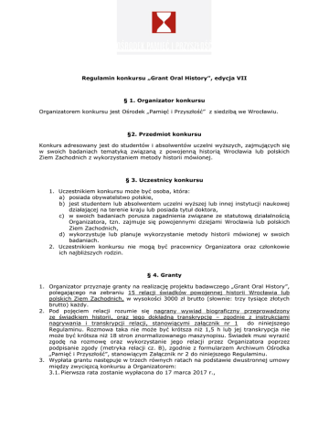 Regulamin konkursu „Grant Oral History”, edycja VII § 1. Organizator konkursu Organizatorem konkursu jest Ośrodek „Pamięć i Przyszłość” z siedzibą we Wrocławiu. §2. Przedmiot konkursu Konkurs adresowany jest do studentów i absolwentów uczelni wyższych, zajmujących się w swoich badaniach tematyką związaną z powojenną historią Wrocławia lub polskich Ziem Zachodnich z wykorzystaniem metody historii mówionej. § 3. Uczestnicy konkursu 1. Uczestnikiem konkursu może być osoba, która: a) posiada obywatelstwo polskie, b) jest studentem lub absolwentem uczelni wyższej lub innej instytucji naukowej działającej na terenie kraju lub posiada tytuł doktora, c) w swoich badaniach porusza zagadnienia związane ze statutową działalnością Organizatora, tzn. zajmuje się powojennymi dziejami Wrocławia lub polskich Ziem Zachodnich, d) wykorzystuje lub planuje wykorzystanie metody historii mówionej w swoich badaniach. 2. Uczestnikiem konkursu nie mogą być pracownicy Organizatora oraz członkowie ich najbliższych rodzin. § 4. Granty 1. Organizator przyznaje granty na realizację projektu badawczego „Grant Oral History”, polegającego na zebraniu 15 relacji świadków powojennej historii Wrocławia lub polskich Ziem Zachodnich, w wysokości 3000 zł brutto (słownie: trzy tysiące złotych brutto) każdy. 2. Pod pojęciem relacji rozumie się nagrany wywiad biograficzny przeprowadzony ze świadkiem historii, oraz jego dokładną transkrypcję – zgodnie z instrukcjami nagrywania i transkrypcji relacji, stanowiącymi załącznik nr 1 do niniejszego Regulaminu. Rozmowa taka nie może być krótsza niż 1,5 h lub jej transkrypcja nie może być krótsza niż 18 stron znormalizowanego maszynopisu. Świadek musi wyrazić zgodę na rozmowę oraz wykorzystanie jego relacji przez Organizatora poprzez podpisanie zgody (metryka relacji cz. B), zgodnie z formularzem Archiwum Ośrodka „Pamięć i Przyszłość”, stanowiącym Załącznik nr 2 do niniejszego Regulaminu. 3. Wypłata grantu następuje w trzech równych ratach na podstawie dwustronnej umowy między zwycięzcą konkursu a Organizatorem: 3.1. Pierwsza rata zostanie wypłacona do 17 marca 2017 r., 3.2. Druga rata zostanie wypłacona po przekazaniu 8 relacji (termin oddania: 31.07.2017) 3.3. Trzecia rata zostanie wypłacona do 08.12.207 po przekazaniu wszystkich 15 relacji (termin oddania: 20.11.2017). 4. Grant nie podlega przedłużeniu. 5. Osoba, której przyznano grant, może startować w kolejnych edycjach konkursu. §5. Wniosek 1. Wniosek składa kandydat na formularzu, będącym załącznikiem nr 3 do niniejszego Regulaminu (dostępny na stronie www.zajezdnia.org w zakładce „Nasze działania-> Edukacja -> Stypendia i granty”). 2. Wniosek należy złożyć w formie pisemnej w siedzibie Organizatora lub wysłać pocztą na adres Organizatora. 3. Do wniosku należy dołączyć: a) Curriculum Vitae kandydata z uwzględnieniem działalności naukowo-badawczej (maksymalnie 2 strony maszynopisu), b) Oryginał lub kserokopię zaświadczenia o studiowaniu na uczelni wyższej lub dyplomu ukończenia studiów wyższych, c) Skrócony opis przebiegu dotychczasowej pracy naukowej i zainteresowań badawczych (maksymalnie 2 strony znormalizowanego maszynopisu), d) Wykaz publikacji, e) List referencyjny samodzielnego pracownika naukowego, f) Projekt grantu (maksymalnie 2 strony maszynopisu), który powinien zawierać: 1. tytuł projektu, 2. tematykę relacji, ich zakres chronologiczny i charakterystykę świadków historii włącznie z, o ile to możliwe, załączeniem ich listy, 3. propozycję kwestionariusza pytań zadawanych na trzecim etapie rozmowy (opisanym w załączniku nr 1 do niniejszego Regulaminu). Organizator zastrzega sobie możliwość rozszerzenia kwestionariusza pytań, o pytania związane z obszarami zainteresowań Ośrodka „Pamięć i Przyszłość”. 4. Komplet dokumentów należy przesłać do dnia 17 lutego 2017 r. (decyduje data nadania) na adres Organizatora (Ośrodek „Pamięć i Przyszłość”, ul. Grabiszyńska 184 , 53-235 Wrocław) lub dostarczyć go do sekretariatu Organizatora najpóźniej do godziny 14.00 17 lutego 2017 r. (Wrocław, ul. Grabiszyńska 184, I piętro). 5. Wnioski niekompletne oraz zgłoszone po terminie nie będą rozpatrywane. 6. Nadesłane wnioski nie będą zwracane. §6. Rozstrzygnięcie konkursu 1. Zaopiniowane wnioski zostaną przedstawione Komisji Konkursowej powołanej przez Dyrektora Ośrodka „Pamięć i Przyszłość”. 2. Komisja Konkursowa dokona oceny wniosków i wyłoni zwycięzców konkursu. 3. Komisja ma prawo przeprowadzić drugi etap konkursu – rozmowę z wybranymi kandydatami. 4. Rozstrzygnięcie konkursu nastąpi do 10 marca 2017 r. 5. Decyzja Komisji Konkursowej jest nieodwołalna i nie podlega zaskarżeniu. 6. Wyniki konkursu zostaną podane do publicznej wiadomości na stronie internetowej Organizatora (www.zajezdnia.org), a laureaci zostaną dodatkowo zawiadomieni o przyznaniu grantu przez Komisję Konkursową telefonicznie lub mailowo. 7. Komisja nie ma obowiązku argumentować dlaczego dany wniosek został odrzucony. 8. W przypadku niskiej oceny nadesłanych wniosków organizator zastrzega sobie prawo do nie przyznania żadnego grantu. §7. Zobowiązania beneficjenta grantu 1. Zwycięzca konkursu przez okres pobierania grantu zobowiązany jest do: a) Kontynuowania pracy naukowej; b) Zebrania 15 relacji świadków powojennej historii Wrocławia lub polskich Ziem Zachodnich metodą opisaną w załączniku nr 1 do niniejszego regulaminu; c) Przekazania plików dźwiękowych i transkrypcji relacji do Archiwum Ośrodka „Pamięć i Przyszłość” zgodnie z procedurą archiwalną Organizatora (zwycięzcy konkursu zostaną zapoznani z ww. procedurą) i instrukcją stanowiącą załącznik nr 1 do niniejszego regulaminu: 1. 8 relacji nie później niż do 31 lipca 2017 r. 2. pozostałych 7 relacji nie później niż do 20 listopada 2017