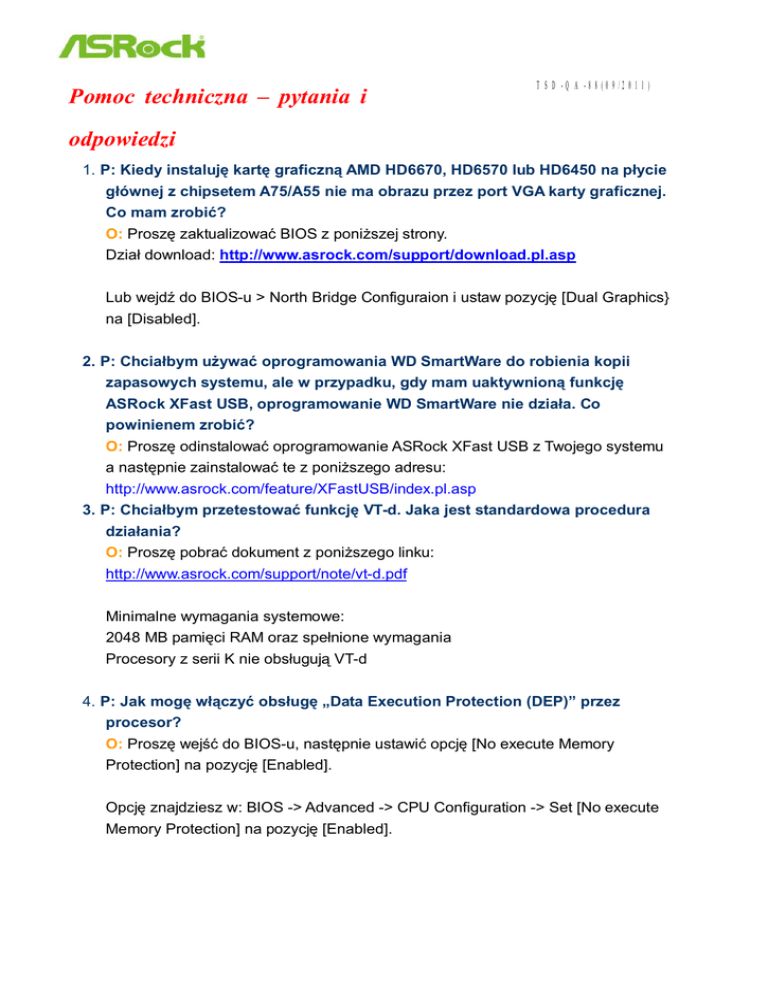 Pomoc techniczna – pytania i TSD-QA-88(09/2011) odpowiedzi 1. P: Kiedy instaluj kart graficzn AMD HD6670, HD6570 lub HD6450 na p ycie ównej z chipsetem A75/A55 nie ma obrazu przez port VGA karty graficznej. Co mam zrobi ? O: Prosz zaktualizowa BIOS z poni szej strony. Dzia download: http://www.asrock.com/support/download.pl.asp Lub wejd do BIOS-u > North Bridge Configuraion i ustaw pozycj [Dual Graphics} na [Disabled]. 2. P: Chcia bym u ywa oprogramowania WD SmartWare do robienia kopii zapasowych systemu, ale w przypadku, gdy mam uaktywnion funkcj ASRock XFast USB, oprogramowanie WD SmartWare nie dzia a. Co powinienem zrobi ? O: Prosz odinstalowa oprogramowanie ASRock XFast USB z Twojego systemu a nast pnie zainstalowa te z poni szego adresu: http://www.asrock.com/feature/XFastUSB/index.pl.asp 3. P: Chcia bym przetestowa funkcj VT-d. Jaka jest standardowa procedura dzia ania? O: Prosz pobra dokument z poni szego linku: http://www.asrock.com/support/note/vt-d.pdf Minimalne wymagania systemowe: 2048 MB pami ci RAM oraz spe nione wymagania Procesory z serii K nie obs uguj VT-d 4. P: Jak mog w czy obs ug „Data Execution Protection (DEP)” przez procesor? O: Prosz wej do BIOS-u, nast pnie ustawi opcj [No execute Memory Protection] na pozycj [Enabled]. Opcj znajdziesz w: BIOS -> Advanced -> CPU Configuration -> Set [No execute Memory Protection] na pozycj [Enabled].