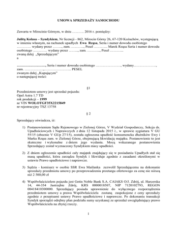 UMOWA SPRZEDAŻY SAMOCHODU Zawarta w Mirocinie Górnym, w dniu ………. 2016 r. pomiędzy: Julitą Kolasa – Syndykiem, Nr licencji - 862, Mirocin Górny 26, 67-120 Kożuchów, występującą w imieniu własnym, na rachunek upadłych Ewa Rząsa, Seria i numer dowodu osobistego ………… wydany przez …….., zam. ……….., Pesel ………... Marek Rząsa Seria i numer dowodu osobistego ………… wydany przez …….., zam. ……….., Pesel ………... zwaną dalej „Sprzedającym” a ……………………, Seria i numer dowodu osobistego …………………, wydany………………., zam. …………….,………………….. PESEL zwanym dalej „Kupującym” o następującej treści: §1 Przedmiotem umowy jest sprzedaż pojazdu: Opel Astra 1.7 TD rok produkcji – 1999 nr VIN WOLOTGF35X2215849 nr rejestracyjny TSZ 13758 §2 Sprzedający oświadcza, iż: 1) Postanowieniem Sądu Rejonowego w Zielonej Górze, V Wydział Gospodarczy, Sekcja ds. Upadłościowych i Naprawczych z dnia 12 listopada 2015 r., w sprawie sygnatura V GU 55/15 (obecnie V GUp 27/15), została ogłoszona upadłość konsumencka dłużników Ewy i Marka Rząsa zam. w Zielonej Górze, obejmującą likwidację majątku. Postanowienie to jest skuteczne i wykonalne z dniem jego wydania. Mocą wskazanego postanowienia Sprzedający został wyznaczony Syndykiem masy upadłości. 2) Z dniem ogłoszenie upadłości cały majątek znajdujący się w posiadaniu Upadłych stał się masą upadłości, która zarządza Syndyk i likwiduje zgodnie z zasadami określonymi w ustawie Prawo upadłościowe i naprawcze. 3) Sędzia - komisarz w osobie SSR Ewa Maślanka zezwolił Sprzedającemu na dokonanie sprzedaży przedmiotu umowy po przeprowadzeniu przetargu ofertowego za cenę nie niższą niż 2 500,00 zł 4) Współwłaścicielem pojazdu jest Getin Noble Bank S.A. CAIAKS O/J. Zdrój, ul. Harcerska 14, 44-354 Jastrzębie Zdrój, KRS 0000018507, NIP 7120102793, REGON 00418410300000. Sprzedający posiada uprawnienie do wyłącznego rozporządzenia przedmiotem umowy a prawa Współwłaściciela zostaną zaspokojone z ceny sprzedaży zgodnie z przepisami ustawy Prawo upadłościowe i naprawcze. Po dokonaniu transakcji Syndyk sporządzi odrębny plan podziału sumy uzyskanej ze sprzedaż uwzględniający prawo Współwłaściciela na zbytej rzeczy. 1 5) Sprzedaż dokonywana przez Syndyka ma skutki sprzedaży egzekucyjnej. Kupujący nabywa pojazd w stanie wolnym od obciążeń w zakresie określonym w art. 313 Prawa upadłościowego i naprawczego. §3 Strony ustaliły wartość przedmiotu umowy na kwotę ………. zł (słownie: …………………. złotych). §4 Sprzedający działając w imieniu własnym lecz na rachunek upadłego przenosi na rzecz Kupującego własność pojazdu określonego w punkcie 1 niniejszej umowy za kwotę określoną w punkcie 3 niniejszej umowy, której otrzymanie Sprzedający kwituje. Pojazd zostanie wydany Kupującemu w czasie i miejscu ustalonym przez strony. §5 Kupujący oświadcza, że stan techniczny pojazdu jest mu znany. §6 Koszty zawarcia niniejszej umowy ponosi w całości Kupujący. §7 W sprawach nie uregulowanych w niniejszej umowie zastosowanie mają obowiązujące w tym zakresie przepisy kodeksu cywilnego. §8 Niniejszą umowę sporządzono w dwóch jednobrzmiących egzemplarzach, po jednym dla każdej ze stron. KUPUJĄCY SPRZEDAJĄCY 2