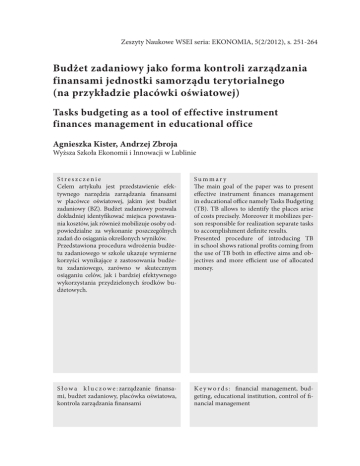 Zeszyty Naukowe WSEI seria: EKONOMIA, 5(2/2012), s. 251-264 Budżet zadaniowy jako forma kontroli zarządzania finansami jednostki samorządu terytorialnego (na przykładzie placówki oświatowej) Tasks budgeting as a tool of effective instrument finances management in educational office Agnieszka Kister, Andrzej Zbroja Wyższa Szkoła Ekonomii i Innowacji w Lublinie Streszczenie Celem artykułu jest przedstawienie efektywnego narzędzia zarządzania finansami w placówce oświatowej, jakim jest budżet zadaniowy (BZ). Budżet zadaniowy pozwala dokładniej identyfikować miejsca powstawania kosztów, jak również mobilizuje osoby odpowiedzialne za wykonanie poszczególnych zadań do osiągania określonych wyników. Przedstawiona procedura wdrożenia budżetu zadaniowego w szkole ukazuje wymierne korzyści wynikające z zastosowania budżetu zadaniowego, zarówno w skutecznym osiąganiu celów, jak i bardziej efektywnego wykorzystania przydzielonych środków budżetowych. Summar y The main goal of the paper was to present effective instrument finances management in educational office namely Tasks Budgeting (TB). TB allows to identify the places arise of costs precisely. Moreover it mobilizes person responsible for realization separate tasks to accomplishment definite results. Presented procedure of introducing TB in school shows rational profits coming from the use of TB both in effective aims and objectives and more efficient use of allocated money. S ł o w a k l u c z o w e : zarządzanie finansami, budżet zadaniowy, placówka oświatowa, kontrola zarządzania finansami K e y w o r d s : financial management, budgeting, educational institution, control of financial management Zeszyty Naukowe WSEI seria: EKONOMIA, 5(2/2012) 252 Agnieszka Kister, Andrzej Zbroja, Budżet zadaniowy jako forma kontroli... W stę p Zmiany zachodzące w latach dziewięćdziesiątych ubiegłego stulecia, demokratyzacja życia publicznego, a wraz z nią jawność finansów publicznych i większy rygor prawny skłaniały jednostki samorządu terytorialnego (JST) do racjonalizacji wydatków ponoszonych na oświatę. Jednakże pozostałości systemu centralnego, brak wzorców i doświadczeń, stan niewiedzy ekonomicznej i prawnej ludzi, którzy odpowiadali za system szkolnictwa polskiego sprawiały, że działania podejmowane w latach dziewięćdziesiątych ubiegłego stulenia oparte były na intuicji. Środki na realizację zadań nadal planowane, realizowane i przekazywane były centralnie. Szacunkowe dane wykonania planów finansowych w roku bieżącym stanowiły podstawę do wyliczeń niezbędnych środków na kolejne lata. Tworzony budżet był więc konsekwencją wydatków realizowanych przez tysiące dysponentów drugiego i trzeciego stopnia1, a nie obiektywnych kryteriów naliczania środków. Ustawa o samorządzie terytorialnym z 8 marca 1990 roku do zadań własnych gminy włączyła prowadzenie szkół podstawowych, przedszkoli i innych placówek oświatowo-wychowawczych. Od 1996 roku, kiedy wszystkie gminy przejęły prowadzenie szkół podstawowych, wydatki na oświatę stały się najważniejszą pozycją w ich budżetach. Po przejęciu oświaty przez samorządy, sposób jej finansowania był zróżnicowany w różnych regionach. Tam, gdzie stare zasady dawały poczucie bezpieczeństwa, a przekonanie, że ewidencja dochodów i wydatków prowadzona według klasyfikacji budżetowej, jest wystarczająca dla oceny prawidłowości działania, pozostał nadal system zarządzania centralnego. Pogłębiający się niedobór środków publicznych na finansowanie zadań oświatowych stał się przyczyną, aby gminy podjęły się realizacji racjonalnej gospodarki i dokonywały kontroli efektywnego wykorzystania środków pozostających w ich dyspozycji. Dobre efekty w tym aspekcie uzyskały samorządy, które poprzez decentralizację zarządzanie finansami przekazały dyrektorom szkół. Samodzielności dyrektora w podejmowaniu decyzji finansowych sprzyjało określanie celowości ponoszonych wydatków. Pomimo braku obowiązujących standardów ich finansowania, jak również systemów przeliczania poniesionych nakładów na uzyskiwane efekty edukacyjne, priorytetem stało się osiągnięcie pewnej współmierności zadań, które wykonano, ze środkami przeznaczonymi na ich sfinansowanie. 1 Dysponent pierwszego stopnia – Minister Finansów, Zarząd Gminy (Powiatu, Województwa), dysponent drugiego stopnia – Wojewoda, dysponent trzeciego stopnia – kierownik jednostki organizacyjnej państwa lub samorządu terytorialnego. Zeszyty Naukowe WSEI seria: EKONOMIA, 5(2/2012) Agnieszka Kister, Andrzej Zbroja, Budżet zadaniowy jako forma kontroli... 253 1. Tradycyjne zarządzanie finansami w gminie Tradycyjny sposób zarządzania finansami JST, w tym również w oświacie, polega na ocenie potrzeb danego podmiotu sektora finansów publicznych w oparciu o dane historyczne i tworzeniu na ich podstawie budżetów na kolejne lata. Przygotowanie budżetu w gminie rozpoczyna się od zebrania wniosków określających potrzeby poszczególnych dysponentów. Wnioski te przedstawiają z reguły zapotrzebowanie na środki finansowe, rzadko natomiast precyzują wymierny wynik zaplanowanych wydatków. Suma zebranych wniosków na ogół kilkakrotnie przewyższa możliwości finansowe gminy. Muszą być dokonane odpowiednie „cięcia budżetowe”. Podstawą są wydatki poprzedniego roku w poszczególnych podziałkach klasyfikacji budżetowej i na tej podstawie dokonywany jest podział środków na poszczególne działy, a następnie na rozdziały. Planowanie budżetowe na obydwu poziomach dotyczy wydatkowania środków, natomiast nie określa efektów, jakie mają przynieść poniesione nakłady. Decydenci, przydzielając środki, nie wiedzą dokładnie, co zostanie wykonane. Dysponenci natomiast, w najlepszym wypadku, rozpoczynają planowanie zadań po zatwierdzeniu budżetu, najczęściej jednak faza ta jest całkowici