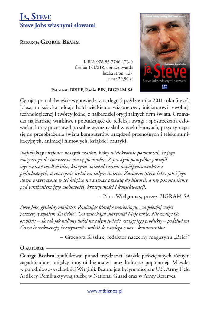 Ja, Steve Steve Jobs własnymi słowami Redakcja George Beahm ISBN: 978-83-7746-173-0 format 141/218, oprawa twarda liczba stron: 127 cena: 29,90 zł Patronat: BRIEF, Radio PIN, BIGRAM SA Cytując ponad dwieście wypowiedzi zmarłego 5 października 2011 roku Steve’a Jobsa, ta książka oddaje hołd wielkiemu wizjonerowi, inicjatorowi rewolucji technologicznej i twórcy jednej z najbardziej oryginalnych firm świata. Gromadzi najbardziej wnikliwe i pobudzające do refleksji uwagi i spostrzeżenia człowieka, który pozostawił po sobie wyraźny ślad w wielu branżach, przyczyniając się do przeobrażenia świata komputerów, urządzeń przenośnych i telekomunikacyjnych, animacji filmowych, książek i muzyki. Największy wizjoner naszych czasów, który wielokrotnie powtarzał, że jego motywacją do tworzenia nie są pieniądze. Z prostych pomysłów potrafił wykreować wielkie idee, którymi zarażał swoich współpracowników i podwładnych, a następnie ludzi na całym świecie. Zarówno Steve Jobs, jak i jego słowa przytoczone w tej książce na zawsze przejdą do historii, a my pozostaniemy pod wrażeniem jego osobowości, kreatywności i konsekwencji. – Piotr Wielgomas, prezes BIGRAM SA Steve Jobs, genialny marketer. Realizując filozofię marketingu: „zaspokajaj czyjeś potrzeby z zyskiem dla siebie”, On zaspokajał marzenia! Moje także. Nie znając Go osobiście – ale tak jak miliony ludzi na całym świecie, znając jego produkty – podziwiam Go za konsekwencję, kreatywność i miłość do każdego z nas – konsumentów. – Grzegorz Kiszluk, redaktor naczelny magazynu „Brief ” O autorze George Beahm opublikował ponad trzydzieści książek poświęconych różnym zagadnieniom, między innymi biznesowi oraz kulturze popularnej. Mieszka w południowo-wschodniej Wirginii. Beahm jest byłym oficerem U.S. Army Field Artillery. Pełnił aktywną służbę w National Guard oraz w Army Reserves. www.mtbiznes.pl Ja, Steve 6SLV WUHVFL Wprowadzenie ......................................................................................... 11 Cytaty ....................................................................................................... 13 Akcje Apple ......................................................................................... 13 Analiza problemu ............................................................................... 13 Aplikacje pornograczne na Androida ............................................. 14 BâĘdna denicja wartoŒci ................................................................. 14 BâĘdy ................................................................................................... 15 Brak innowacji Microsoftu ................................................................ 15 Branding ............................................................................................. 16 Byý albo nie byý ................................................................................. 16 Byý najlepszym .................................................................................. 17 CaâoŒciowe ksztaâtowanie doŒwiadczenia uŮytkownika ................ 17 Cele ..................................................................................................... 17 CiĘŮka praca ...................................................................................... 17 CiĘŮka praca i upâywajĉce lata ........................................................ 18 CoŒ wiĘcej niŮ rekrutacja .................................................................. 18 Credo .................................................................................................. 19 Curriculum Vitae (CV) Jobsa ............................................................. 19 Czytniki e-booków ............................................................................. 20 David kontra Goliat ............................................................................ 20 DNA rmy Apple ................................................................................. 20 DoskonaâoŒý ...................................................................................... 21 DoŒwiadczenie uŮytkownika ............................................................. 21 Duma z produktu ............................................................................... 22 Dusza nowej maszyny ....................................................................... 22 Dziedzictwo Jobsa w Apple ............................................................... 22 Dziedzictwo Maca .............................................................................. 22 Fascynacja ......................................................................................... 23 Filozoa rmy ..................................................................................... 23 Gotowy zestaw ................................................................................... 23 IBM ..................................................................................................... 24 iCEO .................................................................................................... 24 Innowacje ........................................................................................... 24 Innowacje PARC ................................................................................. 26 Innowacje produktowe ...................................................................... 26 Inspiracja ............................................................................................ 26 Integracja ........................................................................................... 27 www.mtbiznes.pl Ja, Steve Steve Jobs, wâasnymi sâowami Integracja produktu ........................................................................... 27 Interfejs graczny PARC .................................................................... 29 iPad i nieunikniona zmian
