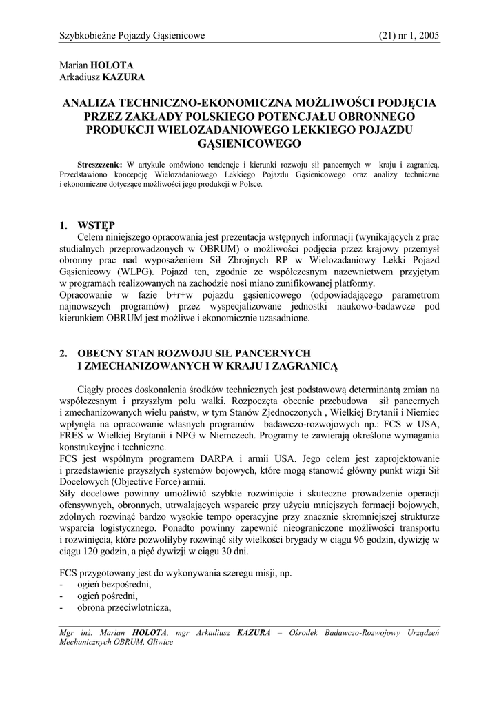 Szybkobieżne Pojazdy Gąsienicowe (21) nr 1, 2005 Marian HOLOTA Arkadiusz KAZURA ANALIZA TECHNICZNO-EKONOMICZNA MOŻLIWOŚCI PODJĘCIA PRZEZ ZAKŁADY POLSKIEGO POTENCJAŁU OBRONNEGO PRODUKCJI WIELOZADANIOWEGO LEKKIEGO POJAZDU GĄSIENICOWEGO Streszczenie: W artykule omówiono tendencje i kierunki rozwoju sił pancernych w kraju i zagranicą. Przedstawiono koncepcję Wielozadaniowego Lekkiego Pojazdu Gąsienicowego oraz analizy techniczne i ekonomiczne dotyczące możliwości jego produkcji w Polsce. 1. WSTĘP Celem niniejszego opracowania jest prezentacja wstępnych informacji (wynikających z prac studialnych przeprowadzonych w OBRUM) o możliwości podjęcia przez krajowy przemysł obronny prac nad wyposażeniem Sił Zbrojnych RP w Wielozadaniowy Lekki Pojazd Gąsienicowy (WLPG). Pojazd ten, zgodnie ze współczesnym nazewnictwem przyjętym w programach realizowanych na zachodzie nosi miano zunifikowanej platformy. Opracowanie w fazie b+r+w pojazdu gąsienicowego (odpowiadającego parametrom najnowszych programów) przez wyspecjalizowane jednostki naukowo-badawcze pod kierunkiem OBRUM jest możliwe i ekonomicznie uzasadnione. 2. OBECNY STAN ROZWOJU SIŁ PANCERNYCH I ZMECHANIZOWANYCH W KRAJU I ZAGRANICĄ Ciągły proces doskonalenia środków technicznych jest podstawową determinantą zmian na współczesnym i przyszłym polu walki. Rozpoczęta obecnie przebudowa sił pancernych i zmechanizowanych wielu państw, w tym Stanów Zjednoczonych , Wielkiej Brytanii i Niemiec wpłynęła na opracowanie własnych programów badawczo-rozwojowych np.: FCS w USA, FRES w Wielkiej Brytanii i NPG w Niemczech. Programy te zawierają określone wymagania konstrukcyjne i techniczne. FCS jest wspólnym programem DARPA i armii USA. Jego celem jest zaprojektowanie i przedstawienie przyszłych systemów bojowych, które mogą stanowić główny punkt wizji Sił Docelowych (Objective Force) armii. Siły docelowe powinny umożliwić szybkie rozwinięcie i skuteczne prowadzenie operacji ofensywnych, obronnych, utrwalających wsparcie przy użyciu mniejszych formacji bojowych, zdolnych rozwinąć bardzo wysokie tempo operacyjne przy znacznie skromniejszej strukturze wsparcia logistycznego. Ponadto powinny zapewnić nieograniczone możliwości transportu i rozwinięcia, które pozwoliłyby rozwinąć siły wielkości brygady w ciągu 96 godzin, dywizję w ciągu 120 godzin, a pięć dywizji w ciągu 30 dni. FCS przygotowany jest do wykonywania szeregu misji, np. - ogień bezpośredni, - ogień pośredni, - obrona przeciwlotnicza, Mgr inż. Marian HOLOTA, mgr Arkadiusz KAZURA – Ośrodek Badawczo-Rozwojowy Urządzeń Mechanicznych OBRUM, Gliwice Marian HOLOTA, Arkadiusz KAZURA - transport oddziałów, prowadzenie misji obserwacyjnych nieprzyjaciela, mobilność/kontrmobilność, C4I (dowodzenie, kierowanie, łączność, komputery i rozpoznanie), zabezpieczenie materiałowo-techniczne, wsparcie bojowe. Plan rozwoju amerykańskich wojsk lądowych w ramach FCS przedstawia poniższy schemat. Rys. 1. Schemat rozwoju amerykańskich wojsk lądowych w ramach FCS Poniżej w tablicy 1 przedstawiono porównanie dwóch programów realizowanych w USA i Wielkiej Brytanii. Tablica 1 FCS w USA FRES w Wielkiej Brytanii - olbrzymia siła rażenia - obsługiwalność - zdolność przeżycia - dostępność - C4l - transportowalność - transportowalność - mobilność operacyjna - mobilność operacyjna - przeżywalność - interoperacyjność - olbrzymia siła rażenia - łatwość obsługi i wsparcia - interoperacyjność Analiza techniczno-ekonomiczna możliwości podjęcia przez zakłady polskiego potencjału… FCS w USA FRES w Wielkiej Brytanii - wielozadaniowość - świadomość sytuacji, rekonesans i aktywizacja celów - otwarta architektura - odporność środowiskowa - możliwości szkoleniowe - właściwości trakcyjne - minimalizacja obsługi i załogi - potencjał rozwojowy Platformy przyszłych wozów bojowych XXI wieku, testowane na poligonach jako prototypy awangardowych bojowych pojazdów opancerzonych, uwzględnione w programie Future Combat System, mogą stać się protoplastami rodziny pojazdów załogowych i bezzałogowych, przewidzianych do zastosowania w nowej strukturze FCS. Platformy przyszłościowych wozów mają mieć tzw. pancerne wanny, zabezpieczające przed eksplozją min, wykonane ze spawanych płyt tytanowych i aluminiowych. Pozostałe osłony to nowej generacji ultralekkie pancerze ceramiczne oraz kompozytowe. Część pancerza zewnętrznego ma mieć strukturę modułową. Uszkodzone podczas walki moduły będą mogły zostać szybko wymienione. Platformy gąsienicowe wyposażane będą w zawieszenia hydropneumatyczne z napędem hybrydowo-elektycznym. Napęd ten posiada kilka zalet w stosunku do konwencjonalnego power-packa. Zapewnia zmniejszenie zużycia paliwa oraz daje możliwość zasilania dużą ilością energii elektrycznej. Amerykańskie firmy prowadzą również badania nad nowym uniwersalnym systemem obserwacji panoramicznej dla żołnierzy. Składa się on z dwóch pięciocalowych głowic umieszczonych na górnej części pancerza w przedniej i tylnej części wozów. Umieszczona w nich kombinacja mikrokamer umożliwia obserwację pola walki w pełnym zakresie (360o). Obraz będzie mógł być przekazywany w czasie rzeczywistym do monitorów załogi, lub do wyświetlaczy-okularów (ruch głowy będzie zmieniał pole widzenia). Realizacja w Polsce prac o podobnym charakterze może zmniejszyć obecny dystans wyposażeniowy pomiędzy rozwiązaniami konstrukcyjnymi opartymi o rozwiązania radzieckie (BWP-1, BWP-2, MTLB), a współczesnymi rozwiązaniami państw zachodnich. Zrealizowaną w OBRUM, lecz nie wdrożoną do produkcji jest konstrukcja BWP 2000 wyposażona w wieżę z armatą kal.60mm. Również w OBRUM w latach 80. wdrożono pionierską (na ówczesne czasy) modułową konstrukcję szybkobieżnego pojazdu gąsienicowego SPG1, SPG1M i KALINA. Obecnie brak jest w kraju programu