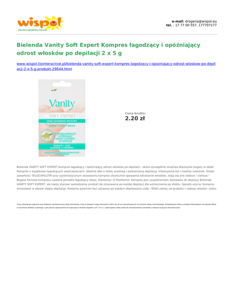 e-mail: [email protected] tel. : 17 77 00 557, 177707177 Bielenda Vanity Soft Expert Kompres łagodzący i opóźniający odrost włosków po depilacji 2 x 5 g www.wispol.tiointeractive.pl/bielenda-vanity-soft-expert-kompres-lagodzacy-i-opozniajacy-odrost-wloskow-po-depil acji-2-x-5-g-produkt-29644.html Cena brutto: 2.20 zł Bielenda VANITY SOFT EXPERT Kompres łagodzący i opóźniający odrost włosków po depilacji - skóra szczególnie wrażliwa Niezwykle bogaty w skład Kompres o wyjątkowo łagodzących właściwościach, idealnie dba o skórę wrażliwą i podrażnioną depilacją. Intensywnie koi i nawilża naskórek. Dzięki zawartości TELOCAPILUTM przy systematycznym stosowaniu kompres skutecznie spowalnia odrastanie włosków, stają się one słabsze i cieńsze." Bogata formuła kompresu zawiera ponadto łagodzący Aloes, Alantoinę i D-Panthenol. Kompres jest uzupełnieniem Zestawów do depilacji Bielenda VANITY SOFT EXPERT, ale także stanowi samodzielny produkt do stosowania po każdej depilacji dla wzmocnienia jej efektu. Sposób użycia: Kompres wmasować w obszar objęty depilacją. Kompres powinien być używany po każdym depilowaniu ciała. *Efekt zależy od grubości i rodzaju włosów i skóry. *Ceny obowiązują wyłącznie przy składaniu zamówień przez sklep internetowy. Ceny w sklepach mogą nieznacznie różnić się od cen prezentowanych na stronach sklepu internetowego. Przedstawiona oferta w sklepie internetowym nie stanowi oferty w rozumieniu Kodeksu Cywilnego, i jest jedynie zaproszeniem do rozpoczęcia rokowań (zgodnie z art. 71 k.c.). Zastrzegamy sobie prawo do niezrealizowania zamówień z ważnych przyczyn ekonomicznych.