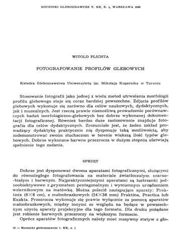 R O C Z N IK I G L E B O Z N A W C Z E T. X X , Z. l, W A R S Z A W A 1969 W ITOLD PLIC H TA FOTOGRAFOWANIE PROFILÓW GLEBOWYCH K atedra G leb ozn aw stw a U n iw ersy tetu im. M ikołaja K opernika w T oruniu Stosowanie fotografii jako jednej z wielu metod utrw alania morfologii profilu glebowego staje się coraz bardziej powszechne. Zdjęcia profilów glebowych wykonuje się zarówno dla celów naukowych, dydaktycznych, jak i muzealnych. Jest rzeczą prawie niemożliwą prowadzenie porównaw czych badań morfologiczno-glebowych bez dobrze wykonanej dokumen tacji fotograficznej. Również bardzo duże zastosowanie znajduje foto grafia dla celów dydaktycznych. Zrozumiałe jest, że żaden zakład pro wadzący dydaktykę praktycznie пЦ dysponuje taką możliwością, aby zademonstrować swoim słuchaczom w terenie większą ilość typów gle bowych. Dobrze wykonane barw ne przezrocza w dużym stopniu ułatw iają spełnienie tego zadania. SPRZĘT Dobrze jest dysponować dwoma aparatam i fotograficznymi, służącymi do równoległego fotografowania na m ateriale światłoczułym czarno-białym i barwnym. N ajpraktyczniejszym i aparatam i są lustrzanki jed noobiektywowe z .pryzmatem pentagonalnym i wymiennym urządzeniem wziernikowym na matówkę. Można polecić następujące aparaty: P raktisix (6X6 cm), z małoobrazkowych (24X36 mm) Praktina, Practica lub Exakta. Przezrocza w ykonuje się prawie wyłącznie za pomocą aparatów małoobrazkowych, między innym i ze względu na będące w powszech nym użyciu aparaty projekcyjne dla tego form atu. Dla druku pożądane jest robienie barw nych przezroczy na większym formacie. Oprócz aparatów fotograficznych należy mieć masywny statyw z gło16 — R o c z n ik i g le b o z n a w c z e t. X X , z. 1 242 wicą przegubową (kulową) i panoramiczną, światłomierz bardzo czuły (najlepiej światłomierz na fotooporachX lampę błyskową (elektronową), komplety filtrów i obiektywów wymiennych. Bardzo przydatny jest szczególnie obiektyw szerokokątny. Konieczne jest również posiadanie wężyka spustowego i pędzelka do czyszczenia aparatów. Jako m ateriału światłoczułego używa się raczej błon niskoczułych, które odznaczają się drobnym ziarnem, dużą zdolnością rozdzielczą i od powiednią kontrastowością. Tymi własnościami odznaczają się filmy czarno-białe NP 10 DIN i NP 18 DIN. Ostatnio ukazały się na rynku do skonałe filmy do fotografowania profilów glebowych NP 15 DIN. Do wy konania diapozytywów używa się filmów barw nych odwracalnych na światło dzienne UT 16 DIN. Ze sprzętu ,,niefotograficznego” należy wymienić: składaną dwukolorową łatę mierniczą, wzorzec czterech barw podstawowych, komplet cyfr do num eracji profilów i płat brezentu. Brezent można wykorzystać do położenia pod kolana w czasie fotografowania lub do zasłonięcia pro filu, w razie potrzeby, w celu uniknięcia rażących plam słońca na po wierzchni fotografowanej. PRZY G O TO W AN IE ODKRYW KI Odkrywka powinna być odpowiednio usytuowana w stosunku do słoń ca, to znaczy tak, aby promienie nie padały wprost na fotografowaną ścianę. Unikamy w ten sposób na profilu ostrych cieni i plam słońca. Glebę z dołu wyrzucam y na boki, żeby nie zanieczyścić widocznej na zdjęciu powierzchni gleby i roślinności. Następnie preparujem y po wierzchnię profilu tak, aby wszystkie charakterystyczne elem enty stru k tury gleby były wyraźnie widoczne. W zależności od typu gleby i m a teriału zaznaczają się one wyraźniej na ścianie wilgotnej, w innym przy padku na wysuszonej. Korzenie roślin i szkielet powinny lekko w ysta wać ponad powierzchnię profilu, co zwiększa plastyczność zdjęcia. Do przygotowanego w opisany sposób profilu przykładam y składaną łatę mierniczą, tak aby jej początek pokrywał się z powierzchnią gleby, następnie wzorzec z czterema barwam i podstawowymi i kolejny num er odkrywki. W Y K O N A NIE ZDJĘCIA A parat fotograficzny ustawia się na statyw ie z głowicą przegubową (kulową) i zakłada odpowiedni obiektyw, najczęściej szerokokątny, aby obejmował całą powierzchnię profilu. Dobrze jest, jeśli widoczna jest również powierzchnia gleby i szata roślinna. F o tografow an ie p ro filó w gleb ow ych 243 N ajtrudniejszą i najbardziej kłopotliwą spraw ą w czasie fotografo wania jest właściwe oświetlenie profilu. Na ogół korzystam y ze światła sztucznego, rzadziej naturalnego. Składa się na to wiele powodów: — przy świetle naturalnym bardzo trudno uzyskać równomierne oświetlenie całego profilu; do dolnej części odkrywki dociera mniejsza ilość światła, co powoduje zniekształcenie stopnia zaczernienia na czarno-białych zdjęciach i zmiany barw y na kolorowych. — jesteśm y ograniczeni porą dnia, szczególnie jeśli chodzi o zdjęcia barwne, co spowodowane jest nieodpowiednim składem spektralnym św iatła słonecznego rano i późnym popołudniem; — w lesie, szczególnie liściastym, przefiltrow ane przez korony drzew światło dzienne ma w swoim składzie zbyt dużo promieni zielonych. Wy konane w tych w arunkach zdjęcia barw ne m ają odcień zielony. W przypadku gdy trzeba korzystać ze światła naturalnego w nieod powiednich w arunkach stosujem y filtry do fotografii barw nej; — filtr różowy 101 (R 6) zapobiega błękitnem u zadymieniu przy zdję ciach w cieniu i przy zakrytym niebie, — filtr różowy 102 (R 12) o działaniu silniejszym od poprzedniego zapobiega silnemu zadymieniu niebieskozielonemu, na przykład gdy foto grafujem y pod drzewami w lesie, szczególnie liściastym, lub przy po chm urnym niebie, — filtr jasnoniebieski 110 (B 1,5) przyczynia się do prawidłowego o d dania barw przy fotografowaniu w porach dnia, gdy słońce znajduje się nisko nad horyzontem, — filtr niebieski średni 111 (B 3) oddaje prawidłowe barw y przy obiektach o barwie żółtoczerwonej, gdy słońce znajduje się nisko nad 