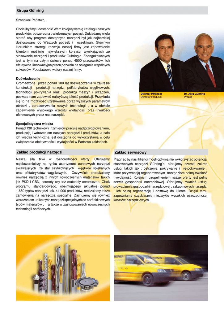 Grupa Gühring Szanowni Państwo, Chcielibyśmy udostępnić Wam kolejną wersję katalogu naszych produktów, poszerzoną o wiele nowych pozycji. Dokładamy wielu starań aby program dostępnych narzędzi był jak najbardziej dostosowany do Waszych potrzeb i oczekiwań. Głównym kierunkiem strategii rozwoju naszej firmy jest zapewnienie klientom możliwie największych korzyści wynikających ze stosowania narzędzi i produktów Guhring‘a. Zaangażowanych jest w tym na całym świecie ponad 4500 pracowników. Ich efektywna i innowacyjna praca pozwala na osiąganie wspólnych sukcesów. Podstawowe walory naszej firmy: Doświadczenie Gromadzone przez ponad 100 lat doświadczenia w zakresie konstrukcji i produkcji narzędzi, półfabrykatów węglikowych, technologii pokrywania oraz produkcji maszyn i urządzeń, pozwala nam zapewnić najwyższą jakość produkcji. Przekłada się to na możliwość uzyskiwania coraz wyższych parametrów obróbki , opracowywania nowych technologii , a w efekcie zapewnienie wysokiego wzrostu wydajności oraz trwałości oferowanych przez nas narzędzi. Dietmar Pfränger Dyrektor Produkcji Dr. Jörg Gühring Prezes Specjalistyczna wiedza Ponad 130 techników i inżynierów pracuje nad przygotowaniem, produkcją i wdrożeniem naszych narzędzi i produktów, a cała ich wiedza techniczna jest dostępna do wykorzystania w celu zwiększania efektywności i wydajności w Państwa zakładach. Zakład produkcji narzędzi Nasza siła tkwi w różnorodności oferty. Oferujemy najobszerniejszy na rynku asortyment obrotowych narzędzi skrawających ze stali szybkotnących i węglików spiekanych oraz półfabrykatów węglikowych. Oczywiście produkujemy również narzędzia z innych nowoczesnych materiałów takich jak PKD i CBN, cermety czy też materiały ceramiczne. Obok programu standardowego, obejmującego aktualnie ponad 1.650 typów narzędzi i ok. 44.000 produktów, realizujemy także zamówienia na narzędzia specjalne. Zajmujemy się również wdrażaniem unikalnych narzędzi specjalnych do obróbki nowych typów materiałów , a także w zastosowaniach nowoczesnych technologii obróbczych. Zakład serwisowy Pragnąc by nasi klienci mogli optymalnie wykorzystać potencjał stosowanych narzędzi Gühring’a, oferujemy szeroki zakres usług, takich jak : ostrzenie, pokrywanie i re-pokrywanie , które przywracają regenerowanym narzędziom pełną trwałość i wydajność. Kolejnym uzupełnieniem naszej oferty jest pełny serwis gospodarki narzędziowej. Oferujemy również usługi prowadzenia gospodarki narzędziowej : zakup nowych narzędzi , ich pełną regenerację i dostawę do klienta. Dzięki temu zapewniamy uzyskiwanie niezwykle wysokich oszczędności kosztów narzędziowych. Grupa Gühring Innowacyjność Firma Guhring zawsze była i jest liderem we wprowadzaniu nowych technologii narzędziowych, z których liczne stały się standardami powszechnie używanymi , przykładowo : pokrycie TiN (które jako pierwsi zastosowaliśmy do wierteł w 1980 roku) ; system mocowania HSK oraz zaokrąglona geometria wierzchołka wiertła (typ RT100R) do obróbki żeliw takich jak CGI i ADI. Obecnie takimi standardami stają się : system chłodzenia MQL (MMS) ; unikatowy system ustawiania i regulacji dla wieloostrzowych, dwustopniowych narzędzi PKD/ CBN. Wyznaczają one dziś nowe kierunki rozwoju technologii narzędziowych. Oliver Gühring Dyrektor Sprzedaży i Marketingu Bernd Schatz Dyrektor Finansowy Globalny serwis Staramy się być jak najbliżej swoich klientów. W tym celu stworzyliśmy obszerną sieć obsługi obejmującą cały świat (posiadamy 26 zakładów produkcyjnych, 36 centrów serwisowych, 43 przedstawicielstwa oraz licznych partnerów handlowych). Zapewnia to szybkie wykonywanie nowych narzędzi oraz sprawną ich regenerację. Gwarantujemy przy tym zachowanie najwyższych standardów jakościowych. Będziemy zaszczyceni możliwością współpracy z Państwem. Dr. Jörg Gühring Zakład węglików spiekanych Zakład produkcji obrabiarek i wyposażenia Posiadanie własnej bazy produkcji węglików spiekanych zapewnia firmie Guhring stały rozwój najlepszych materiałów przeznaczonych do produkcji narzędzi. Dzięki temu jesteśmy liderem rozwoju najbardziej efektywnych metod obróbki skrawaniem. W konsekwencji zapewniamy niskie koszty produkcji narzędzi i uzyskiwanie przez naszych klientów bezpośrednich zysków z wdrożenia najnowszych technologii . Nasze zakłady węglików spiekanych z ich roczną produkcją ok. 2000 ton czynią z firmy Guhring jednego z największych producentów węglików na świecie. Rozwijana jest również produkcja węglików przeznaczonych do innych zastosowań np. dla górnictwa czy przemysłu spożywczego. Zapewnienie stabilności produkcji, zagwarantowanie najwyższej jakości wyrobów oraz międzynarodowa presja na obniżkę kosztów to podstawowe czynniki, które spowodowały, że konstruujemy i produkujemy własne, najwyższej klasy obrabiarki. Należą do nich szlifierki CNC, instalacje do supertwardych pokryć i przyrządy pomiarowe. Produkujemy również różnego rodzaju wyposażenie i przyrządy warsztatowe, automatyczne systemy wydawania narzędzi (przeznaczone do prowadzenia gospodarki narzędziowej) oraz wiele innych produktów spełniających wysokie wymagania klientów. Skrócony przewodnik zastosowań nowoczesnych narzędzi firmy Guhring Poniższy skrócony przewodnik zapewnia przegląd zakresów zastosowań dla większości nowoczesnych narzędzi firmy Guhring. Narzędzia w poniższej tabeli zostały podzielone na grupy oraz poszczególne typy, zgodnie z ich oznaczeniami w katalogu. ły* eria mat wa żeli obr óbk aw inne ne zew ierd en stal nej szo . wyż zym pod wytr eo stal m² N/m 800 . do lSi rzym wyt py A eo i sto l stal opy o st i jeg Wiertła Ratio A wy odle iwe iągl Al c najlepszy wybór możliwy wybór warunkowy wybór do technologii yso kow yda obr óbk jna am HSC ater iałó ch