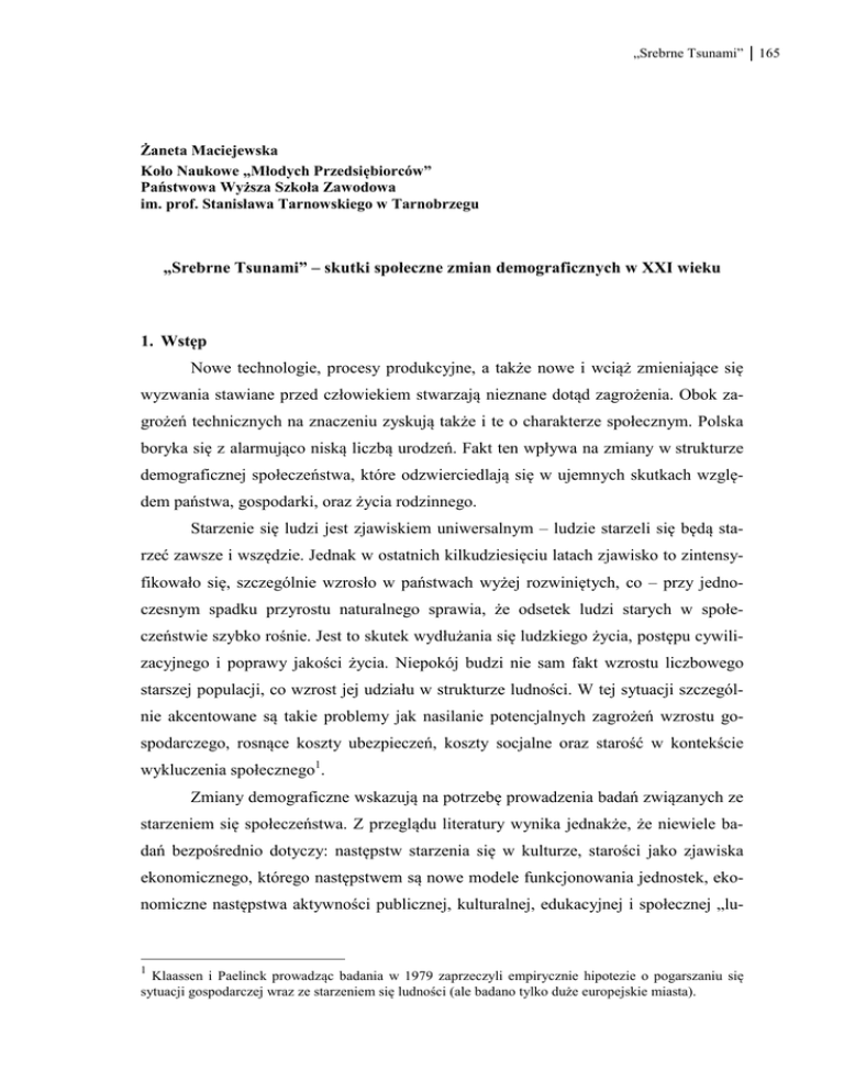 „Srebrne Tsunami” Żaneta Maciejewska Koło Naukowe „Młodych Przedsiębiorców” Państwowa Wyższa Szkoła Zawodowa im. prof. Stanisława Tarnowskiego w Tarnobrzegu „Srebrne Tsunami” – skutki społeczne zmian demograficznych w XXI wieku 1. Wstęp Nowe technologie, procesy produkcyjne, a także nowe i wciąż zmieniające się wyzwania stawiane przed człowiekiem stwarzają nieznane dotąd zagrożenia. Obok zagrożeń technicznych na znaczeniu zyskują także i te o charakterze społecznym. Polska boryka się z alarmująco niską liczbą urodzeń. Fakt ten wpływa na zmiany w strukturze demograficznej społeczeństwa, które odzwierciedlają się w ujemnych skutkach względem państwa, gospodarki, oraz życia rodzinnego. Starzenie się ludzi jest zjawiskiem uniwersalnym – ludzie starzeli się będą starzeć zawsze i wszędzie. Jednak w ostatnich kilkudziesięciu latach zjawisko to zintensyfikowało się, szczególnie wzrosło w państwach wyżej rozwiniętych, co – przy jednoczesnym spadku przyrostu naturalnego sprawia, że odsetek ludzi starych w społeczeństwie szybko rośnie. Jest to skutek wydłużania się ludzkiego życia, postępu cywilizacyjnego i poprawy jakości życia. Niepokój budzi nie sam fakt wzrostu liczbowego starszej populacji, co wzrost jej udziału w strukturze ludności. W tej sytuacji szczególnie akcentowane są takie problemy jak nasilanie potencjalnych zagrożeń wzrostu gospodarczego, rosnące koszty ubezpieczeń, koszty socjalne oraz starość w kontekście wykluczenia społecznego1. Zmiany demograficzne wskazują na potrzebę prowadzenia badań związanych ze starzeniem się społeczeństwa. Z przeglądu literatury wynika jednakże, że niewiele badań bezpośrednio dotyczy: następstw starzenia się w kulturze, starości jako zjawiska ekonomicznego, którego następstwem są nowe modele funkcjonowania jednostek, ekonomiczne następstwa aktywności publicznej, kulturalnej, edukacyjnej i społecznej „lu- 1 Klaassen i Paelinck prowadząc badania w 1979 zaprzeczyli empirycznie hipotezie o pogarszaniu się sytuacji gospodarczej wraz ze starzeniem się ludności (ale badano tylko duże europejskie miasta). 165 166 Żaneta Maciejewska dzi dojrzałych”2, czy rozwój społeczeństwa informacyjnego. W związku z podjętym tematem autorka niniejszego opracowania pragnie wykazać w oparciu o analizę ogólnodostępnych źródeł oraz własnych obserwacji, że faktycznie zmiany demograficzne mają wpływ na kierunki zmian zarówno w aspekcie kulturalnym, społecznym jak również ekonomiczno – gospodarczym. Celem niniejszej pracy jest zwrócenie uwagi na zmiany w strukturze demograficznej państwa polskiego oraz wskazanie rozwiązań systemowych, których efektywność jest bardzo niska ze względu na niedostosowanie do potrzeb społeczeństwa, dla którego owe rozwiązania zostały skonstruowane. 2. Kształt polskiej demografii społecznej oraz jego oddziaływanie na jednostkę Jean Bodin stwierdził, że ludzie są źródłem siły i bogactwa państwa (Okolski 2013, s. 13), z podobnego założenia wychodzą pracodawcy RP, którzy uważnie śledzą trendy demografii społecznej. Rok 2013 okazał się szczególnie niekorzystny pod tym względem dla Polski. Współczynnik dzietności wynosił 1,26 dziecka w przeliczeniu na jedną kobietę w wieku rozrodczym. W kolejnym roku odnotowano wzrost tej wielkości (Podstawowe informacje… 2015, s. 3). Tendencja okazała się jednak krótkotrwała – do końca kwietnia 2015 r. urodziło się o ponad tysiąc dzieci mniej niż w tym samym okresie roku minionego, a liczba zgonów w stosunku do liczby urodzeń zwiększyła się o 13 tys. (Informacja o sytuacji… 2015, s. 6-7). Aby można było mówić o zastępowalności prostej pokoleń zakłada się, że współczynnik dzietności powinien wynosić około 2,1 (Podstawowe informacje… 2015, s. 4-5) – jeśli kolejne pokolenia nie osiągną tego poziomu społeczeństwo polskie może okazać się niewystarczająco liczne, aby można było mówić o jakiejkolwiek stabilności społecznej i ekonomicznej. Współczynnik dzietności z upływem czasu jest coraz wyższy. Wiąże się to ze zjawiskiem „srebrnego tsunami” (Mamos-Gabryś 2015), które polega na wydłużeniu się przeciętnego trwania życia: mężczyzn – z 70,4 lat w 2004 roku do 77,6 lat w 2035 roku i kobiet – odpowiednio – z 78,8 lat do 83,3 lat (Prognoza ludności… 2009). Statystyki demograficzne prezentują zjawisko „podwójnego starzenia się ludności”3. Mówi ona, że choć generalnie następuje procentowy wzrost ludności starszej, w jej ramach najszyb2 W tym kontekście chodzi o najstarszą grupę społeczeństwa. W związku ze zmieniającymi się trendami społecznymi oraz potrzebą edukowania społeczeństwa zasadnym jest używanie zwrotu „ludzie dojrzali”, a nie „starzejący się”. 3 Amerykańska literatura przedstawia podział zbiorowości seniorów na trzy grupy: „młodych starych” (osoby w wieku 65-74 lata), „starych starych” (75-84 lata) i „najstarszych starych” (85 lat i więcej). „Srebrne Tsunami” ciej rośnie odłam najstarszy. Szybciej od „młodych starych” (w wieku od 65 do 74 lat) rośnie liczebność „starych starych” (75-84 lata), najszybciej zaś – zbiorowość „najstarszych starych” (85 lat i więcej) (Szukalski 2008, s. 12-13). Na zjawisko starzenia się społeczeństwa ma wpływ szereg czynników, wśród których wymienić można m.in. poziom zamożności społeczeństwa, model rodziny, aktywność zawodową kobiet, rozwój opieki społecznej i ochrony zdrowia, wykształcenie ludności oraz politykę społeczną państwa. Wspomniane determinanty wykreowały styl życia polskiego obywatela. Analizując ich wpływ na życie społeczne jednostki istnieje możliwość scharakteryzowania poszczególnych grup, poprzez przypisanie im określonych cech. Cechy charakterystyczne dla obecnego społeczeństwa to: − wzrost lic