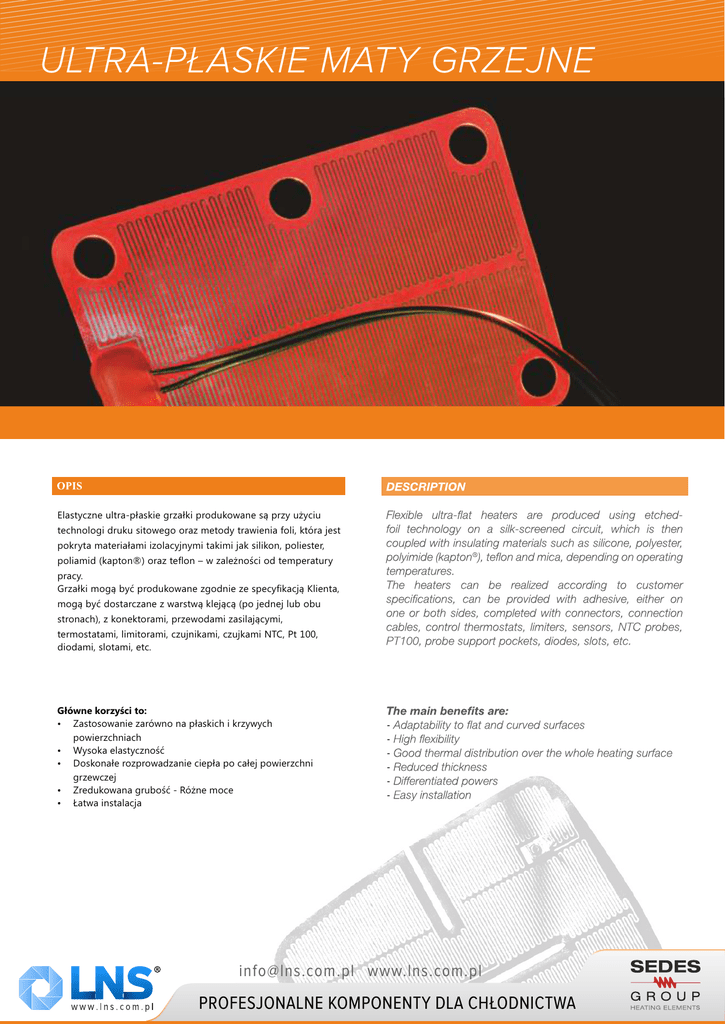 ULTRA-PŁASKIE MATY GRZEJNE Elastyczne ultra-płaskie grzałki produkowane są przy użyciu technologi druku sitowego oraz metody trawienia foli, która jest pokryta materiałami izolacyjnymi takimi jak silikon, poliester, poliamid (kapton®) oraz teflon – w zależności od temperatury pracy. Grzałki mogą być produkowane zgodnie ze specyfikacją Klienta, mogą być dostarczane z warstwą klejącą (po jednej lub obu stronach), z konektorami, przewodami zasilającymi, termostatami, limitorami, czujnikami, czujkami NTC, Pt 100, diodami, slotami, etc. Główne korzyści to: ź Zastosowanie zarówno na płaskich i krzywych powierzchniach ź Wysoka elastyczność ź Doskonałe rozprowadzanie ciepła po całej powierzchni grzewczej ź Zredukowana grubość - Różne moce ź Łatwa instalacja [email protected] www.lns.com.pl PROFESJONALNE KOMPONENTY DLA CHŁODNICTWA ULTRA-PŁASKIE MATY GRZEJNE Przemysł motoryzacyjny i transport (lusterka samochodowe); aplikacje przemysłowe (podgrzewane prasy, matryce, powierzchnie grzewcze); catering (płyty grzejne, bemary, podgrzewacze jedzenia); klimatyzacja (klimatyzatory, grzałki karteru); chłodnictwo przemysłowe i komercyjne (tace ociekowe, systemy antykondensacyjne); medycyna (mycie ultradźwiękowe, instrumenty medyczne i laboratoryjne); łazienki (sauny, baseny z hydromasażem, koce elektryczne, odmgławianie luster łazienkowych, podgrzewacze ręczników); AGD (ekspresy do kawy, maszyny do robienia lodów, jogurtów, kuchenki, podgrzewacze do butelek); różne inne (anteny telekomunikacyjne, inkubatory dla zwierząt, systemy antykondensacyjne, ogrzewanie szklarni, akwariów i terrariów). LNS Sp. z o.o. ul. Żernicka 9, 55-010, Święta Katarzyna tel: +48 71 716 44 50 fax: +48 71 716 44 51 e-mail: [email protected] KRS 0000476413; NIP 8961535367; REGON 022250607
