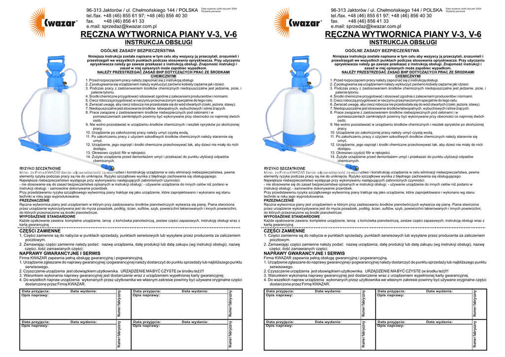 ® 96-313 Jaktorów / ul. Chełmońskiego 144 / POLSKA tel./fax. +48 (46) 855 61 97; +48 (46) 856 40 30 fax. +48 (46) 856 41 33 e.mail: [email protected] Data wydania ulotki:styczeń 2004 Wydanie pierwsze ® RĘCZNA WYTWORNICA PIANY V-3, V-6 96-313 Jaktorów / ul. Chełmońskiego 144 / POLSKA tel./fax. +48 (46) 855 61 97; +48 (46) 856 40 30 fax. +48 (46) 856 41 33 e.mail: [email protected] Data wydania ulotki:styczeń 2004 Wydanie pierwsze RĘCZNA WYTWORNICA PIANY V-3, V-6 INSTRUKCJA OBSŁUGI INSTRUKCJA OBSŁUGI OGÓLNE ZASADY BEZPIECZEŃSTWA OGÓLNE ZASADY BEZPIECZEŃSTWA Niniejsza instrukcja została napisana w tym celu aby wszyscy ją przeczytali, zrozumieli i przestrzegali we wszystkich punktach podczas stosowania opryskiwacza. Przy użyczaniu opryskiwacza należy go zawsze przekazać z instrukcją obsługi. Znajomość instrukcji i zasad w niej opisanych może zapobiec wypadkom. NALEŻY PRZESTRZEGAĆ ZASAD BHP DOTYCZĄCYCH PRAC ZE ŚRODKAMI CHEMICZNYMI 1. Przed rozpoczęciem pracy należy zapoznać się z instrukcją obsługi. 2. Z posługiwania się urządzeniem należy wykluczyć zarówno kobiety ciężarne jak i dzieci. 3. Podczas pracy z zastosowaniem środków chemicznych niedopuszczalne jest jedzenie, picie, i palenie tytoniu. 4. Środki chemiczne przygotować i stosować zgodnie z zaleceniami producentów i normami. 5. Ciecz roboczą przygotować w naczyniu przeznaczonym specjalnie do tego celu. 6. Zwracać uwagę, aby ciecz robocza nie przedostała się do wód otwartych (rzeki, jeziora, stawy). 7. Niedopuszczalne jest stosowanie środków łatwopalnych, wybuchowych i silnie żrących. 8. Prace związane z zastosowaniem środków niebezpiecznych pod osłonami i w pomieszczeniach zamkniętych powinny być wykonywane przy obecności co najmniej dwóch osób. 9. Nie wolno pozostawiać w urządzeniu środków chemicznych i resztek oprysków po skończonej pracy. 10. Urządzenie po zakończonej pracy należy umyć czystą wodą. 11. Po zakończeniu pracy z użyciem szkodliwych środków chemicznych należy starannie się umyć. 12. Urządzenie, jego osprzęt i środki chemiczne przechowywać tak, aby dzieci nie miały do nich dostępu. 13. Okresowo czyścić filtr w rękojeści. 14. Zużyte urządzenie przed demontażem umyć i przekazać do punktu utylizacji odpadów chemicznych. Niniejsza instrukcja została napisana w tym celu aby wszyscy ją przeczytali, zrozumieli i przestrzegali we wszystkich punktach podczas stosowania opryskiwacza. Przy użyczaniu opryskiwacza należy go zawsze przekazać z instrukcją obsługi. Znajomość instrukcji i zasad w niej opisanych może zapobiec wypadkom. NALEŻY PRZESTRZEGAĆ ZASAD BHP DOTYCZĄCYCH PRAC ZE ŚRODKAMI CHEMICZNYMI 1. Przed rozpoczęciem pracy należy zapoznać się z instrukcją obsługi. 2. Z posługiwania się urządzeniem należy wykluczyć zarówno kobiety ciężarne jak i dzieci. 3. Podczas pracy z zastosowaniem środków chemicznych niedopuszczalne jest jedzenie, picie, i palenie tytoniu. 4. Środki chemiczne przygotować i stosować zgodnie z zaleceniami producentów i normami. 5. Ciecz roboczą przygotować w naczyniu przeznaczonym specjalnie do tego celu. 6. Zwracać uwagę, aby ciecz robocza nie przedostała się do wód otwartych (rzeki, jeziora, stawy). 7. Niedopuszczalne jest stosowanie środków łatwopalnych, wybuchowych i silnie żrących. 8. Prace związane z zastosowaniem środków niebezpiecznych pod osłonami i w pomieszczeniach zamkniętych powinny być wykonywane przy obecności co najmniej dwóch osób. 9. Nie wolno pozostawiać w urządzeniu środków chemicznych i resztek oprysków po skończonej pracy. 10. Urządzenie po zakończonej pracy należy umyć czystą wodą. 11. Po zakończeniu pracy z użyciem szkodliwych środków chemicznych należy starannie się umyć. 12. Urządzenie, jego osprzęt i środki chemiczne przechowywać tak, aby dzieci nie miały do nich dostępu. 13. Okresowo czyścić filtr w rękojeści. 14. Zużyte urządzenie przed demontażem umyć i przekazać do punktu utylizacji odpadów chemicznych. RYZYKO SZCZĄTKOWE Mimo, że Firma KWAZAR bierze odpowiedzialność za wzornictwo i konstrukcję urządzenia w celu eliminacji niebezpieczeństwa, pewne elementy ryzyka podczas pracy są nie do uniknięcia. Ryzyko szczątkowe wynika z błędnego zachowania się obsługującego. Największe niebezpieczeństwo występuje przy wykonywaniu następujących zabronionych czynności: - nie stosowanie się do zasad bezpieczeństwa opisanych w instrukcji obsługi; - używanie urządzenia do innych celów niż podano w instrukcji obsługi; - samowolne dokonywanie przeróbek. Przy przedstawieniu ryzyka szczątkowego wytwornicę piany traktuje się jako urządzenie, które zaprojektowano i wykonano wg stanu techniki w roku jego wyprodukowania. PRZEZNACZENIE Ręczna wytwornica piany jest urządzeniem w którym przy zastosowaniu środków pianotwórczych wytwarza się pianę. Piana stworzona przez urządzenie wykorzystywana jest do mycia posadzek, podłóg, ścian, sufitów, szyb, powierzchni lakierowanych i innych powierzchni, do których przeznaczone są środki pianotwórcze. WYPOSAŻENIE STANDARDOWE Każde opakowanie zawiera: kompletne urządzenie, lancę z końcówka pianotwórczą, zestaw części zapasowych, instrukcję obsługi wraz z kartą gwarancyjną. RYZYKO SZCZĄTKOWE Mimo, że Firma KWAZAR bierze odpowiedzialność za wzornictwo i konstrukcję urządzenia w celu eliminacji niebezpieczeństwa, pewne elementy ryzyka podczas pracy są nie do uniknięcia. Ryzyko szczątkowe wynika z błędnego zachowania się obsługującego. Największe niebezpieczeństwo występuje przy wykonywaniu następujących zabronionych czynności: - nie stosowanie się do zasad bezpieczeństwa opisanych w instrukcji obsługi; - używanie urządzenia do innych celów niż podano w instrukcji obsługi; - samowolne dokonywanie przeróbek. Przy przedstawieniu ryzyka szczątkowego wytwornicę piany traktuje się jako ur