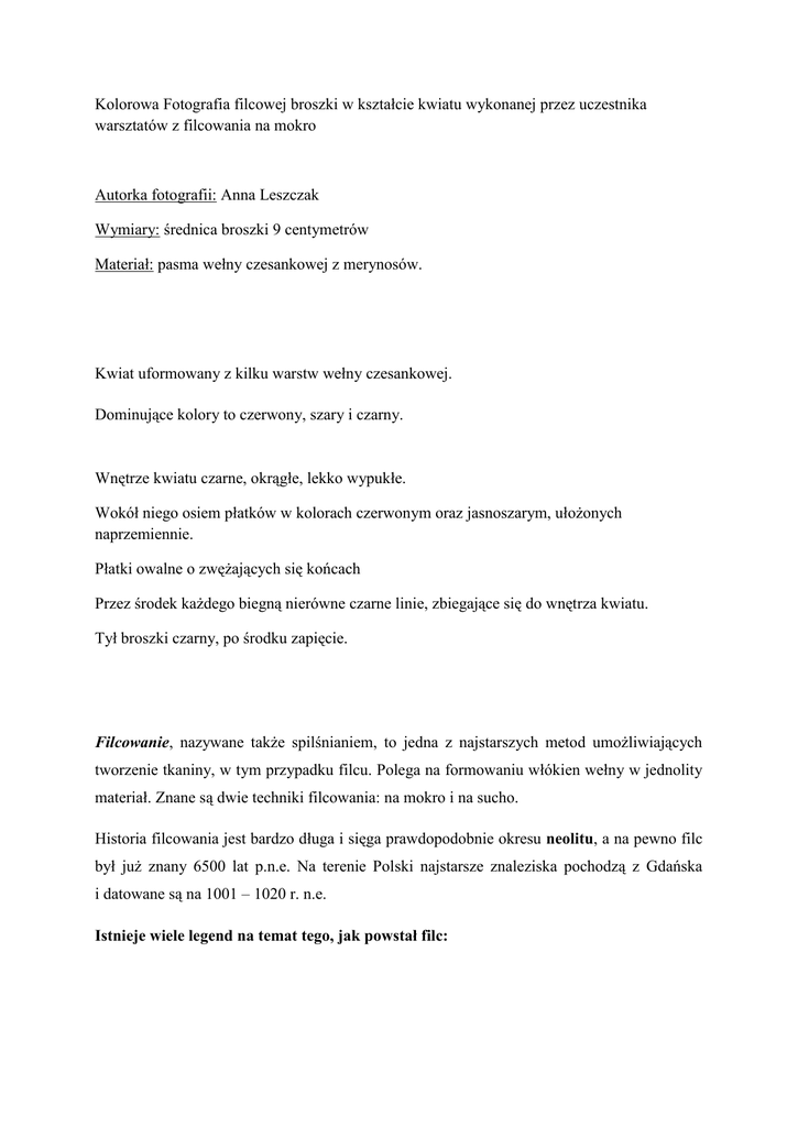 Kolorowa Fotografia filcowej broszki w kształcie kwiatu wykonanej przez uczestnika warsztatów z filcowania na mokro Autorka fotografii: Anna Leszczak Wymiary: średnica broszki 9 centymetrów Materiał: pasma wełny czesankowej z merynosów. Kwiat uformowany z kilku warstw wełny czesankowej. Dominujące kolory to czerwony, szary i czarny. Wnętrze kwiatu czarne, okrągłe, lekko wypukłe. Wokół niego osiem płatków w kolorach czerwonym oraz jasnoszarym, ułożonych naprzemiennie. Płatki owalne o zwężających się końcach Przez środek każdego biegną nierówne czarne linie, zbiegające się do wnętrza kwiatu. Tył broszki czarny, po środku zapięcie. Filcowanie, nazywane także spilśnianiem, to jedna z najstarszych metod umożliwiających tworzenie tkaniny, w tym przypadku filcu. Polega na formowaniu włókien wełny w jednolity materiał. Znane są dwie techniki filcowania: na mokro i na sucho. Historia filcowania jest bardzo długa i sięga prawdopodobnie okresu neolitu, a na pewno filc był już znany 6500 lat p.n.e. Na terenie Polski najstarsze znaleziska pochodzą z Gdańska i datowane są na 1001 – 1020 r. n.e. Istnieje wiele legend na temat tego, jak powstał filc: Ponoć już Noe wyściełał swoją arkę runem owczym, które to pod wpływem panującej tam wilgoci i ciągłemu ugniataniu przez ludzi i zwierzęta zamieniło się w kawałki filcu. Druga wersja, Mongolska, mówi o nomadach, którzy jako siodeł używali skór owczych razem z włosem. W czasie jazdy, poprzez pocieranie się o wilgotne i rozgrzane ciało konia, wełniana okrywa filcowała się, tworząc jednolitą strukturę. Według trzeciej legendy św. Klemens, czwarty biskup Rzymu i patron filcarzy (żył w I w. n.e.), wyruszając na misje, włożył do sandała trochę wełny aby obuwie, go nie obcierało. Wełna po jakimś czasie sfilcowała się po wpływem potu i tarcia.