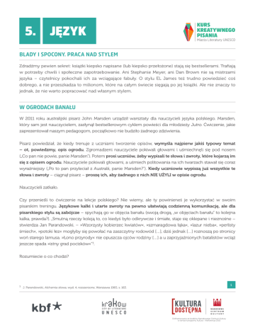 5. JĘZYK BLADY I SPOCONY. PRACA NAD STYLEM Zdradźmy pewien sekret: książki kiepsko napisane (lub kiepsko przełożone) stają się bestsellerami. Trafiają w potrzeby chwili i społeczne zapotrzebowanie. Ani Stephanie Meyer, ani Dan Brown nie są mistrzami języka – czytelnicy pokochali ich za wciągające fabuły. O stylu EL James też trudno powiedzieć coś dobrego, a nie przeszkadza to milionom, które na całym świecie sięgają po jej książki. Ale nie znaczy to jednak, że nie warto popracować nad własnym stylem. W OGRODACH BANAŁU W 2011 roku australijski pisarz John Marsden urządził warsztaty dla nauczycieli języka polskiego. Marsden, który sam jest nauczycielem, zasłynął bestsellerowym cyklem powieści dla młodzieży Jutro. Ćwiczenie, jakie zaprezentował naszym pedagogom, początkowo nie budziło żadnego zdziwienia. Pisarz powiedział, że kiedy trenuje z uczniami tworzenie opisów, wymyśla najpierw jakiś typowy temat – ot, powiedzmy, opis ogrodu. Zgromadzeni nauczyciele pokiwali głowami i uśmiechnęli się pod nosem („Co pan nie powie, panie Marsden”). Potem prosi uczniów, żeby wypisali te słowa i zwroty, które kojarzą im się z opisem ogrodu. Nauczyciele pokiwali głowami, a uśmiech politowania na ich twarzach stawał się coraz wyraźniejszy („Po to pan przyleciał z Australii, panie Marsden?”). Kiedy uczniowie wypiszą już wszystkie te słowa i zwroty – ciągnął pisarz – proszę ich, aby żadnego z nich NIE UŻYLI w opisie ogrodu. Nauczycieli zatkało. Czy przenieśli to ćwiczenie na lekcje polskiego? Nie wiemy, ale ty powinieneś je wykorzystać w swoim pisarskim treningu. Językowe kalki i utarte zwroty na pewno ułatwiają codzienną komunikację, ale dla pisarskiego stylu są zabójcze – spychają go w objęcia banału (swoją drogą, „w objęciach banału” to kolejna kalka, prawda?). „Smutną rzeczy koleją to, co kiedyś było odkrywcze i śmiałe, staje się oklepane i nieznośne – stwierdza Jan Parandowski. – »Wzorzysty kobierzec kwiatów«, »szmaragdowa łąka«, »lazur nieba«, »perlisty śmiech«, »potoki łez« mogłyby się powołać na zaszczytny rodowód […], dziś jednak […] roznoszą po stronicy woń starego lamusa. »Łono przyrody« nie opuszcza ojców rodziny […] a u zaprzyjaźnionych batalistów wciąż jeszcze spada »istny grad pocisków«”3. Rozumiecie o co chodzi? 3. 1 J. Parandowski, Alchemia słowa, wyd. 4, rozszerzone, Warszawa 1965, s. 163. Dofinansowano ze środków Narodowego Centrum Kultury w ramach programu Kultura - Interwencje 2015 5. JĘZYK KURS KREATYWNEGO PISANIA Miasta Literatury UNESCO Parandowskiego cytujemy za wydaniem z 1965 roku. Problem jest chyba jednak wciąż aktualny, skoro w roku 2001 Stephen King ostrzega: „Nietrafione porównanie to tylko jedna z potencjalnych pułapek bogatego stylu. Najpopularniejsza z takich pułapek […] to wykorzystanie banalnych porównań, przenośni czy obrazów. Ktoś »biegł jak szaleniec«. Bohaterka »była śliczna jak letni dzień«. Ta kobieta to »ostry towar«. Bob »walczył jak lew«”4. Chcesz naprawdę oryginalnego porównania? Sięgnij po klasyka cyberpunku Williama Gibsona: „Niebo nad portem miało barwę ekranu monitora nastrojonego na martwy kanał”5. Jedno jest pewne: nikt wcześniej nie stworzył takiego porównania. A do tego to pierwsze zdanie Neuromancera – od razu mówi nam, z jaką literaturą będziemy mieli do czynienia. Trudno się dziwić, że Gibson zdefiniował gatunek – właściwie zrobił to już tym jednym porównaniem! Chodzi tu nie tylko o same porównania, ale o całościowe podejście do tego, jak opowiadasz swoją historię. „Mama była sama jak palec” to skuteczna komunikacja, ale na pewno nie literatura. Zobacz, jak proponuje to załatwić Janusz Rudnicki: „odwiedzam po latach matkę, wróciłem z zagranicy, z emigracji, obojętnie. W pewnym momencie chcę się u niej wykąpać, matka chce puścić mi wodę, protestuję, sam sobie puszczę, zgadza się, mówi, że w tym czasie wymyje naczynia, puszczam więc wodę, a ona z kuchni krzyczy, żebym jeszcze troszkę poczekał, bo nie wiedziała, że jak się puści wodę w łazience, to wtedy prawie nie leci ona w kuchni. To wystarczy. Użycie słowa »samotność« nie dość, że zbędne, to jeszcze psujące efekt”6. Spójrz na przykłady, które daje Mariusz Szczygieł: „Nie pisz: »W moim życiu niczego nie żałuję. Wychodzę z założenia, że wszystko to, co przeżyłam, wszystkie błędy, które zdarzyło mi się popełnić, wszystkie dobre i złe doświadczenia mają swój sens«. To banał i zbędne słowa, tak pisze każdy. Zacznij od razu: »Nie żałuję ani jednej nylonowej pończochy porwanej przez kochanków«. Nie pisz: »Mama była zawsze elegancka«, tylko: »Mama bez makijażu nie wynosiła nawet śmieci«. Nie pisz: »Babcia była bogata, ale skromna«, tylko: »Babcia nigdy nie dała po sobie poznać, że ma dwie służące«”7. 4. S. King, Jak pisać. Pamiętnik rzemieślnika, tłum. P. Braiter, Warszawa 2001, s. 142. W. Gibson, Trylogia ciągu. Neuromancer. Graf Zero. Mona Liza Turbo, tłum. P. W. Cholewa, Warszawa 2015, s. 9. 6. J. Rudnicki, Bo mam, k…, talent, „Wysokie Obcasy”, dodatek do „Gazety Wyborczej” nr 154 z dn. 05.07.2014, s. 8. 7. M. Szczygieł, Dumnie w mojej trumnie, „Wysokie Obcasy”, dodatek do „Gazety Wyborczej” nr 166 z dn. 19.07.2014, s. 6. 5. 2 Dofinansowano ze środków Narodowego Centrum Kultury w ramach programu Kultura - Interwencje 2015 5. JĘZYK KURS KREATYWNEGO PISANIA Miasta Literatury UNESCO PROSTOTA STYLU „Rafy kwiecistego stylu trzeba omijać”8 (to znów Rudnicki). Łatwo powiedzieć! „Chrzanowski spotkał Sienkiewicza w Bretanii, w okresie Krzyżaków. Pisarz zamykał się w swoim pokoiku na cały ranek aż do południa. Wtedy wychodził na plażę, był blady, często ze spotniałym czołem. Na pytanie, co go tak męczy, odpowiedział: 