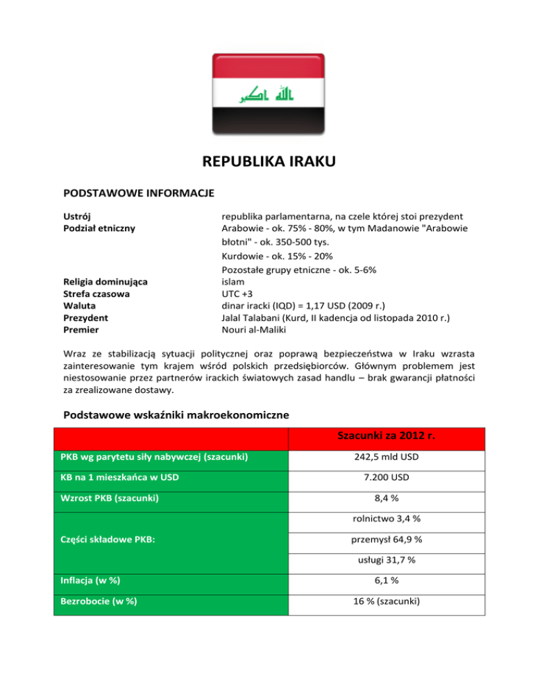 REPUBLIKA IRAKU PODSTAWOWE INFORMACJE Ustrój Podział etniczny Religia dominująca Strefa czasowa Waluta Prezydent Premier republika parlamentarna, na czele której stoi prezydent Arabowie - ok. 75% - 80%, w tym Madanowie "Arabowie błotni" - ok. 350-500 tys. Kurdowie - ok. 15% - 20% Pozostałe grupy etniczne - ok. 5-6% islam UTC +3 dinar iracki (IQD) = 1,17 USD (2009 r.) Jalal Talabani (Kurd, II kadencja od listopada 2010 r.) Nouri al-Maliki Wraz ze stabilizacją sytuacji politycznej oraz poprawą bezpieczeństwa w Iraku wzrasta zainteresowanie tym krajem wśród polskich przedsiębiorców. Głównym problemem jest niestosowanie przez partnerów irackich światowych zasad handlu – brak gwarancji płatności za zrealizowane dostawy. Podstawowe wskaźniki makroekonomiczne Szacunki za 2012 r. PKB wg parytetu siły nabywczej (szacunki) KB na 1 mieszkańca w USD Wzrost PKB (szacunki) 242,5 mld USD 7.200 USD 8,4 % rolnictwo 3,4 % Części składowe PKB: przemysł 64,9 % usługi 31,7 % Inflacja (w %) Bezrobocie (w %) 6,1 % 16 % (szacunki) Eksport 93,91 mld USD Główne towary w eksporcie ropa naftowa (84 %), pozostałe surowce ropopochodne – poza paliwami (8 %), artykuły spożywcze i zwierzęta żywe (5 %) Główni partnerzy w eksporcie USA (21,4%), Indie (21,1%), Chiny (13,8), Rep. Korei (11,2%),Kanada (4,8%), Włochu (4,5%), Hiszpania (4,3%) Import 56,89 mld USD Główne towary w imporcie żywność, leki, towary przetworzone Główni partnerzy imporcie Turcja, Syria, Chiny, USA, Rep. Korei Źródło: CIA The World Factbook (aktualizacja z sierpnia 2013 r.) PROGRAM ROZWOJU SEKTORA PRYWATNEGO W IRAKU Program jest realizowany we współpracy rządu irackiego z agendami ONZ, Bankiem Światowym, Amerykańską Agencją ds. Rozwoju oraz Włoską Izbą Handlową UNIONCAMERE. Za bezpośrednią koordynację odpowiedzialne jest przedstawicielstwo UNDP w Iraku we współpracy z Biurem Projektowym UNDP w Warszawie (będącym częścią UNDP Bratislava Regional Centre). Polska będzie uczestniczyła w ww. programie, który ma na celu stworzenie kompleksowych ram dla rozwoju gospodarczego, w szczególności rozwoju sektora prywatnego w Iraku. Program dąży do zrównoważonego wzrostu zatrudnienia, redukcji ubóstwa oraz poprawy otoczenia instytucjonalnego i prawnego, które umożliwi zwiększenie inwestycji krajowych i zagranicznych. Poszczególne polskie ministerstwa i agencje zaoferowały możliwość dzielenia się swoimi doświadczeniami z zakresu: procesów prywatyzacyjnych (MSP), ekonomii społecznej, reformy emerytalnej, modelu integracji społecznej osób niepełnosprawnych (MPiPS), procesów transformacyjnych (MG), reformy podatkowej (MF), infrastruktury prawnej i instytucjonalnej niezbędnej do utworzenia w Iraku instytucji odpowiadającej Polskiej Agencji Rozwoju Przedsiębiorczości (PARP), zachowania dziedzictwa kulturowego Iraku (MKiDzN), integracji społeczno-kulturowej poprzez zajęcia sportowe (MSiT). PERSPEKTYWY ROZWOJU POLSKO-IRACKIEJ I WSPÓŁPRACY GOSPODARCZEJ WYMIANY HANDLOWEJ Obecny stan współpracy gospodarczej nie odzwierciedla zaangażowania Polski w proces stabilizacji i odbudowy Iraku. Inicjatywy KIG, a także innych organizacji samorządowych aktywnie wspieranych przez Ministerstwo Gospodarki zaowocowały o wiele niższym od spodziewanego zaangażowaniem polskich przedsiębiorców na irackim rynku. W 2003 roku zainteresowanie udziałem w rekonstrukcji Iraku zgłosiło ponad 1600 polskich przedsiębiorstw. Owocem tego było utworzenie 15 konsorcjów branżowych. Największym beneficjentem była, jak dotychczas, właściwie jedna firma - Bumar sp. z o.o. Szczególny wzrost zainteresowania polskich przedsiębiorców odnotowywany jest w regionie Kurdystanu irackiego. Od 2009 r. Ambasada RP w Bagdadzie uczestniczy w Międzynarodowych Targach Wielobranżowych w Erbilu (stolica autonomicznego regionu irackiego Kurdystanu). Ministerstwo Gospodarki poparło pomysł otwarcia Konsulatu Honorowego w Erbilu, który miałby również wspierać polskich przedsiębiorców. W listopadzie 2011 r. podpisana została umowa o współpracy między Województwem Małopolskim a Regionem Kurdystanu. W tym samym miesiącu przebywała w Iraku misja gospodarcza 20 polskich przedsiębiorstw z sektora przemysłu spożywczego zorganizowana przez Agencję Rynku Rolnego. W styczniu 2012 r. przebywała w Polsce misja przedsiębiorców z regionu Kurdystanu. POLSKO-IRACKA WYMIANA HANDLOWA (wartości w tys. USD) 2008 2009 2010 2011 2012 Dynamika % 2011 = 100 Eksport 37, 424 43 ,496 49,991 94,21 92,534 98 Import 0,203 0,142 0,006 0,007 77,736 1137328 Obroty 37 ,627 43 ,638 50, 152 94,217 170,27 b.d. Saldo 37, 221 43. 354 50 ,140 94,203 14,798 b.d. Źródło: GUS Wg danych GUS, polski eksport do Iraku w 2012 r. wyniósł 92,5 mln USD, a import 77,7 mln USD. Tradycyjnie główne pozycje w naszym eksporcie to: papierosy, ser przetworzony, kombajny zbożowe, urządzenia do przetwórstwa spożywczego, broń. Tak znaczący wzrost importu to zakup ropy naftowej, po raz pierwszy od ponad 20 lat. Wg wstępnych danych za okres I-VIII 2013 roku polski eksport do Iraku wyniósł 84,01 mln USD (dynamika 153% w porównaniu do analogicznego okresu roku poprzedniego), import był marginalny (zaledwie 55 tys. USD). Około 60% naszej sprzedaży do urządzenia do odbioru dźwięku, w dalszej kolejności – produkty pochodzenia zwierzęcego i gotowe artykuły spożywcze. Jest to istotna zmiana w strukturze ale na bieżącym etapie trudno ocenić czy będzie to stała tendencja. AKTUALNY STAN ROZLICZEŃ FINANSOWYCH POMIĘDZY POLSKĄ A IRAKIEM Wg stanu na dzień 31 grudnia 2004 r. Irak jest winien Polsce (należności budżetu) 786 mln USD z tytułu wykorzystanych i podlegających spłacie kredytów rządowych – w tym częściowo już restrukturyzowanych – za zrealizowane dostawy. Podczas wizyty w Polsce Ministra Ropy Iraku w sierpniu 2008 r., Wicepremier W. Pawlak zadeklarował chęć rozstrzygnięcia kwestii zadłużenia