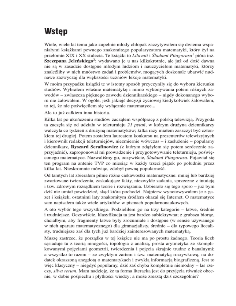 Wstęp Wiele, wiele lat temu jako zupełnie młody chłopak zaczytywałem się dwiema wspaniałymi książkami pewnego znakomitego popularyzatora matematyki, który żył na przełomie XIX i XX stulecia. Te książki to Lilavati i Śladami Pitagorasa1 pióra inż. Szczepana Jeleńskiego2; wydawano je u nas kilkakrotnie, ale już od dość dawna nie są w zasadzie dostępne młodym ludziom i nauczycielom matematyki, którzy znaleźliby w nich mnóstwo zadań i problemów, mogących doskonale ubarwić nudnawe zazwyczaj dla większości uczniów lekcje matematyki. W moim przypadku książki te w istotny sposób przyczyniły się do wyboru kierunku studiów. Wybrałem właśnie matematykę i mimo wykonywania potem różnych zawodów – zwłaszcza pięknego zawodu dziennikarskiego – nigdy dokonanego wyboru nie żałowałem. W ogóle, jeśli jakiejś decyzji życiowej kiedykolwiek żałowałem, to tej, że nie poświęciłem się wyłącznie matematyce... Ale to już całkiem inna historia. Kilka lat po ukończeniu studiów zacząłem współpracę z polską telewizją. Przygoda ta zaczęła się od udziału w teleturnieju 21 pytań, w którym drużyna dziennikarzy walczyła co tydzień z drużyną matematyków; kilka razy miałem zaszczyt być członkiem tej drugiej. Potem zostałem laureatem konkursu na prezenterów telewizyjnych i kierownik redakcji teleturniejów, niezmiernie wówczas – i zasłużenie – popularny dziennikarz, Ryszard Serafinowicz (z którym zdążyłem się potem serdecznie zaprzyjaźnić), zaproponował mi prowadzenie i przygotowywanie teleturnieju, poświęconego matematyce. Nazwaliśmy go, oczywiście, Śladami Pitagorasa. Pojawiał się ten program na antenie TVP co miesiąc w każdy trzeci piątek po południu przez kilka lat. Nieskromnie mówiąc, zdobył pewną popularność. Od tamtych lat zbierałem pilnie różne ciekawostki matematyczne: mniej lub bardziej zwariowane twierdzenia, zaskakujące fakty, niezwykłe zadania, sprzeczne z intuicją i tzw. zdrowym rozsądkiem teorie i rozwiązania. Uzbierało się tego sporo – już bym dziś nie umiał powiedzieć, skąd która pochodzi. Najpierw wynotowywałem je z gazet i książek, ostatnimi laty znakomitym źródłem okazał się Internet. O matematyce sam napisałem także wiele artykułów w pismach popularnonaukowych. A oto wybór tego wszystkiego. Podzieliłem go na trzy kategorie – łatwe, średnie i trudniejsze. Oczywiście, klasyfikacja ta jest bardzo subiektywna; z grubsza biorąc, chciałbym, aby fragmenty łatwe były zrozumiałe i dostępne (w sensie używanego w nich aparatu matematycznego) dla gimnazjalisty, średnie – dla typowego licealisty, trudniejsze zaś dla tych już bardziej zainteresowanych matematyką. Muszę zastrzec, że porządku w tej książce nie ma po prostu żadnego. Teoria liczb sąsiaduje tu z teorią mnogości, topologia z analizą, prosta arytmetyka ze skomplikowanymi pojęciami geometrii, twierdzenia i pojęcia skrajnie trudne z banalnymi; a wszystko to razem – ze zwykłym żartem i tzw. matematyką rozrywkową, na dodatek okraszoną anegdotą o matematykach i zwykłą informacją biograficzną. Jest to więc klasyczny – niegdyś popularny, dziś zaś chyba kompletnie niemodny – las rzeczy, silva rerum. Mam nadzieję, że ta forma literacka jest do przyjęcia również obecnie, w dobie pośpiechu i płytkości wiedzy; a może zresztą dziś szczególnie? Wstęp 7 Przy okazji: jest więc oczywiste, że nie ma żadnego obowiązku ani potrzeby czytania tej książki „po kolei”, strona po stronie. Także jednocześnie chcę powiedzieć bardzo wyraźnie: ta książka nie służy do nauki matematyki. To nie jest podręcznik, zbiorek zadań ani samouczek! Przeczytawszy ją w całości, lub częściowo, będziecie mieli po prostu troszkę więcej od innych pojęcia, czym matematyka jest. Jak mawiał jeden z moich wielkich nauczycieli, profesor Krzysztof Maurin, zaczynając swoje piekielnie trudne wykłady: „może wasza ogólna kultura matematyczna odrobinkę wzrośnie”. Tylko tyle – i aż tyle. Od czasów Szczepana Jeleńskiego matematyka bardzo się rozwinęła. Powstały setki i tysiące nowych pojęć i twierdzeń, a także całych teorii. Dokonano zdumiewających odkryć o niebywałej doniosłości praktycznej. O wielu z nich w szkole średniej nie mówi się zresztą ani słowa. Zmieniło się też podejście do matematyki; przestano ją uważać za opis rzeczywistości fizycznej, zaczęto zaś w niej widzieć po prostu uniwersalny język nauki, którego podstawy musi dziś znać i rozumieć nie tylko matematyk czy fizyk, ale również biolog, historyk czy językoznawca. Z tej przyczyny niniejsza książka nie jest tylko zbiorem prostych ciekawostek i z całą pewnością do jej zrozumienia trzeba – przynajmniej w wielu miejscach – znacznie większej kultury matematycznej niż ta, której wymagał od swoich czytelników Jeleński, który w zasadzie zakładał u odbiorcy – wedle dzisiejszego spojrzenia – posiadanie wiedzy na poziomie szkoły podstawowej. Mam nadzieję, że sympatyków matematyki to nie zniechęci. A może nawet przeciwnie? W odróżnieniu od Jeleńskiego, który mógł założyć u czytelnika znajomość podstawowych tylko praw matematyki (w wypadku jego książek chodziło zresztą raczej wyłącznie o arytmetykę i prostą geometrię) – ja czasami muszę zrobić wypad w kierunku teorii bardziej złożonych, niekiedy uchodzących za dość trudne pojęciowo. Staram się za każdym razem robić to maksymalnie prosto i dostępnie. Stale mam na myśli słynne zdanie, przypisywane wielkiemu Albertowi Einsteinowi: podobno rachunku całkowego można nauczyć nawet małpę; wszystko zależy od nauczyciela”. A co dopiero człowieka zainteresowanego tematem, dla którego przeznaczam niniejszą książkę. Jeśli więc będzie w niej coś niezrozumiałego – będzie to wyłącznie wina nauczyciela, czyli moja. Ale jeśli napotkacie taki