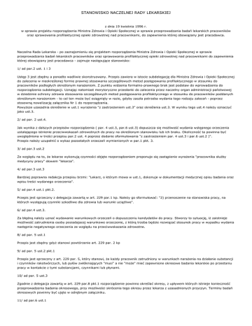 STANOWISKO NACZELNEJ RADY LEKARSKIEJ z dnia 19 kwietnia 1996 r. w sprawie projektu rozporządzenia Ministra Zdrowia i Opieki Społecznej w sprawie przeprowadzania badań lekarskich pracowników oraz sprawowania profilaktycznej opieki zdrowotnej nad pracownikami, do zapewnienia której obowiązany jest pracodawca. Naczelna Rada Lekarska - po zaznajomieniu się projektem rozporządzenia Ministra Zdrowia i Opieki Społecznej w sprawie przeprowadzania badań lekarskich pracowników oraz sprawowania profilaktycznej opieki zdrowotnej nad pracownikami do zapewnienia której obowiązany jest pracodawca - zajmuje następujące stanowisko: 1/ ad par.2 ust. 1 i 3 Ustęp 3 jest zbędny a ponadto wadliwie skonstruowany. Przepis zawiera w istocie subdelegację dla Ministra Zdrowia i Opieki Społecznej do zalecenia w nieokreślonej formie prawnej stosowania szczegółowych metod postępowania profilaktycznego w stosunku do pracowników podległych określonym narażeniom. Z punktu widzenia formalno-prawnego brak jest podstaw do wprowadzenia do rozporządzenia subdelegacji. Uznając natomiast merytoryczne przesłanki do zalecenia przez naczelny organ administracji państwowej w dziedzinie ochrony zdrowia stosowania szczegółowych metod postępowania profilaktycznego w stosunku do pracowników poddanych określonym narażeniom - to cel ten może być osiągnięty w razie, gdyby zaszła potrzeba wydania tego rodzaju zaleceń - poprzez stosowną nowelizację załącznika Nr 1 do rozporządzenia. Powyższe uzasadnia skreślenie w ust.1 wyrażenia "z zastrzeżeniem ust.3" oraz skreślenia ust.3. W wyniku tego ust.4 należy oznaczyć jako ust.3. 2/ ad par. 2 ust.4. Jak wynika z dalszych przepisów rozporządzenia ( par. 4 ust.3, par.6 ust.3) dopuszcza się możliwość wydania wstępnego orzeczenia ustalającego istnienie przeciwwskazań zdrowotnych do pracy na określonym stanowisku lub ich braku. Okoliczność ta powinna być uwzględniona w treści przepisu par.2 ust. 4 poprzez dodanie sformułowania "z zastrzeżeniem par. 4 ust.3 i par.6 ust.2 )". Przepis należy uzupełnić o wykaz pozostałych orzeczeń wymienionych w par.1 pkt. 3. 3/ ad par.3 ust.2 Ze względu na to, że lekarze wykonują czynności objęte rozporządzeniem proponuje się zastąpienie wyrażenia "pracownika służby medycyny pracy" słowem "lekarza". 4/ ad par.3 ust.3 Bardziej poprawna redakcja przepisu brzmi: "Lekarz, o którym mowa w ust.1, dokonuje w dokumentacji medycznej opisu badania oraz wpisu treści wydanego orzeczenia". 5/ ad par.4 ust.1 pkt.2. Przepis jest sprzeczny z delegacja zawartą w art. 229 par.1 kp. Należy go sformułować: "2) przenoszenie na stanowiska pracy, na których występują czynniki szkodliwe dla zdrowia lub warunki uciążliwe". 6/ ad par.4 ust.3. Za błędną należy uznać wydawanie warunkowych orzeczeń o dopuszczeniu kandydatów do pracy. Stworzy to sytuację, iż zaistnieje możliwość zatrudnienia osoby posiadajacej warunkowe orzeczenie, z którą trzeba będzie rozwiązać stosunek pracy w wypadku wydania następnie negatywnego orzeczenia ze względu na przeciwwskazania zdrowotne. 8/ ad par. 5 ust.1 Przepis jest zbędny gdyż stanowi powtórzenie art. 229 par. 2 kp 9/ ad par. 5 ust.2 pkt.1 Przepis jest sprzeczny z art. 229 par. 5, który stanowi, że każdy pracownik zatrudniony w warunkach narażenia na działanie substancji i czynników rakotwórczych, lub pyłów zwłókniających "musi" a nie "może" mieć zapewnione okresowe badania lekarskie po przestaniu pracy w kontakcie z tymi substancjami, czynnikami lub płynami. 10/ ad par. 5 ust.3 Zgodnie z delegacja zawartą w art. 229 par.8 pkt.1 rozporządzenie powinno określać okresy, z upływem których istnieje konieczność przeprowadzenia badania okresowego, przy mozliwości skrócenia tego okresu przez lekarza z uzasadnionych przyczyn. Terminy badań okresowych powinny być ujęte w odrębnym załączniku. 11/ ad par.6 ust.1 Przepis rozbieżny z treścią art.229 par.2 zdanie drugie kp wobec pominięcia wyrażenia "w celu ustalenia zdolności do wykonywania pracy na dotychczasowym stanowisku". 12/ ad par.7 Przepis merytorycznie zasadny, ale delegacja ustawowa nie przewiduje ustalenia trybu odwoławczego od orzeczenia lekarskiego, więc należy go skreślić. 13/ ad par. 8 pkt. 1 Przepis zbędny. 14/ ad par. 8 pkt. 2 i 3. Treść przepisów jest niejasna. Co oznacza wyrażenie "normatyw biologiczny"? 15/ ad par. 9 ust. 1 pkt. 2 Proponowany przepis należy zastąpić sformułowaniem: 1/ uzyskali specjalizację w dziedzinie: medycyny pracy, medycyny przemysłowej, medycyny morskiej i tropikalnej, medycyny kolejowej (transportu ) lub higieny pracy na zasadach określonych w odrebnych przepisach, albo 2/ nabyli uprawnienia na podstawie dotychczasowych przepisów z tytułu odbytego przeszkolenia, 3/ nabyli uprawnienia na podstawie dotychczasowych przepisów i w dotychczasowym zakresie z tytułu stażu pracy z tym, że obowiązani są do odbycia w okresie 3 lat od wejścia w życie rozporządzenia dodatkowego przeszkolenia w zakresie medycyny pracy. Program tego przeszkolenia określi Minister Zdrowia i Opieki Społecznej. Do prowadzenia przeszkolenia uprawnione są jednostki badawczo-rozwojowe w dziedzinie medycyny pracy i wojewódzkie ośrodki medycyny pracy". 16/ ad par. 10 ust.2 - pkt.1 przepis należy uzupełnić przez dodanie wyrażenia numer rejestracyjny lekarza", - pkt.4 przepis należy sformułować, "dane o dotychczasowej ekspozycji zawodowej" - pkt.5. należy skreślić wyrażenie "wynikające z informacji pracodawcy", - pkt.7 przepis należy sformułować "wyniki badań diagnostycznych i/lub konsultacyjnych", - pkt.8 należy skreślić wyrażenie "wynik badania profilaktycznego", 17/ ad par. 10 ust.4 Po wyrażeniu "stosuje się" należy dodać słowo "odpowiednio", gdyż brak jest ogólnie obowiązujących przepisów o dokumentacji medycznej. 18/ ad par. 11 ust.1 Przepis wymaga przeredagowania. Należy uwzględnić funkcjonowanie re