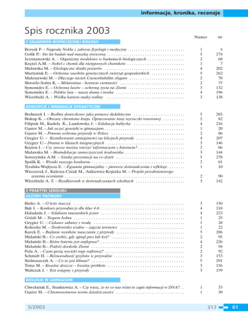 informacje, kronika, recenzje Spis rocznika 2003 Numer str 1 5 2 1 4 5 2 2 3 4 3 4 274 68 7 202 262 70 75 132 196 138 5 2 4 1 2 4 3 2 3 5 2 1 283 82 216 20 86 207 146 86 144 278 81 10 2 3 90 142 3 4 4 1 1 1 5 2 4 2 2 3 5 3 3 150 218 223 25 28 22 286 95 226 94 92 153 291 156 159 1 1 33 30 Z ZAGADNIE¡ WSPÓ¸CZESNEJ BIOLOGII Borsuk P. – Nagroda Nobla z zakresu fizjologii i medycyny . . . . . . . . . . . . . . . . . . . . . . . . . Golik P.– Sto lat badaƒ nad muszkà owocowà . . . . . . . . . . . . . . . . . . . . . . . . . . . . . . . . . . . Jerzmanowski A. – Organizmy modelowe w badaniach biologicznych . . . . . . . . . . . . . . . . . Kr´˝el A.M. – Nobel z chemii dla nietypowych chemików . . . . . . . . . . . . . . . . . . . . . . . . . . Malawska M. – Ekologiczne skutki po˝arów . . . . . . . . . . . . . . . . . . . . . . . . . . . . . . . . . . . . Martyniuk E. – Ochrona zasobów genetycznych zwierzàt gospodarskich . . . . . . . . . . . . . . . Maleszewski M. – Dlaczego nicieƒ Caenorhabditis elegans . . . . . . . . . . . . . . . . . . . . . . . . . Skwar∏o-Soƒta K. – Melatonina - hormon ciemnoÊci . . . . . . . . . . . . . . . . . . . . . . . . . . . . . Symonides E. – Ochrona lasów – ochronà ˝ycia na Ziemi . . . . . . . . . . . . . . . . . . . . . . . . . Symonides E. – Polskie lasy – nasza duma i troska . . . . . . . . . . . . . . . . . . . . . . . . . . . . . . . Wierzbicki A. – Wielka kariera ma∏ej roÊliny . . . . . . . . . . . . . . . . . . . . . . . . . . . . . . . . . . . KONCEPCJE I INNOWACJE DYDAKTYCZNE Bednarek I. – RoÊliny doniczkowe jako pomoce dydaktyczne . . . . . . . . . . . . . . . . . . . . . . . Biskup K. – Obszary chronione kraju. Opracowanie trasy wycieczki rowerowej . . . . . . . . . . Filipiak M., Kudela K., Landowska J. – Edukacja ba∏tycka . . . . . . . . . . . . . . . . . . . . . . . Gàsior M. – Jak uczyç genetyki w gimnazjum . . . . . . . . . . . . . . . . . . . . . . . . . . . . . . . . . . . . Gàsior M. – Prawna ochrona przyrody w Polsce . . . . . . . . . . . . . . . . . . . . . . . . . . . . . . . . . Grygier U. – Kszta∏towanie umiej´tnoÊci na lekcjach przyrody . . . . . . . . . . . . . . . . . . . . . . Grygier U.– Drama w klasach integracyjnych . . . . . . . . . . . . . . . . . . . . . . . . . . . . . . . . . . . Kusion I. – Czy zawsze mo˝na wierzyç informacjom z Internetu? . . . . . . . . . . . . . . . . . . . . . Malawska M. – Bioindykacja zanieczyszczeƒ Êrodowiska . . . . . . . . . . . . . . . . . . . . . . . . . . . Seweryƒska A.M. – Sztuka prezentacji na co dzieƒ . . . . . . . . . . . . . . . . . . . . . . . . . . . . . . . Spalik K. – Wyniki naszego konkursu . . . . . . . . . . . . . . . . . . . . . . . . . . . . . . . . . . . . . . . . . . Tyralska-Wojtycza E. – Egzamin gimnazjalny – pierwsze doÊwiadczenia i refleksje . . . . . . . Wieczorek J., Kulesza-Cisiak M., Ankiewicz-Kopicka M. – Projekt przedmiotowego systemu oceniania . . . . . . . . . . . . . . . . . . . . . . . . . . . . . . . . . . . . . . . . . . . . . . . . . . . . . . Wierzbicki A. T. – Rzodkiewnik w doÊwiadczeniach szkolnych . . . . . . . . . . . . . . . . . . . . . . Z PRAKTYKI SZKOLNEJ UCZYMY PRZYRODY Batko A. – O lesie inaczej . . . . . . . . . . . . . . . . . . . . . . . . . . . . . . . . . . . . . . . . . . . . . . . . . . Bàk I. – Konkurs przyrodniczy dla klas 4-6 . . . . . . . . . . . . . . . . . . . . . . . . . . . . . . . . . . . . . . Ha∏aduda J. – Szlakiem mazurskich jezior . . . . . . . . . . . . . . . . . . . . . . . . . . . . . . . . . . . . . . Góêdê M. – Tropem bobra . . . . . . . . . . . . . . . . . . . . . . . . . . . . . . . . . . . . . . . . . . . . . . . . . . Grygier U. – Ciekawe zabawy z wodà . . . . . . . . . . . . . . . . . . . . . . . . . . . . . . . . . . . . . . . . . Kokocka M. – Ârodowisko wodne – zaj´cia terenowe . . . . . . . . . . . . . . . . . . . . . . . . . . . . . Kurek E. – Badanie wyników nauczania z przyrody . . . . . . . . . . . . . . . . . . . . . . . . . . . . . . . Malaƒski B.– Co zrobiç, gdy zginà∏ pies lub kot? . . . . . . . . . . . . . . . . . . . . . . . . . . . . . . . . . Malaƒski B.– Która bateria jest najlepsza? . . . . . . . . . . . . . . . . . . . . . . . . . . . . . . . . . . . . . . Malaƒski B.– Podró˝ dooko∏a Ziemi . . . . . . . . . . . . . . . . . . . . . . . . . . . . . . . . . . . . . . . . . . Pu∏a A. – Czym gro˝à wycieki ropy naftowej? . . . . . . . . . . . . . . . . . . . . . . . . . . . . . . . . . . . . Schmidt H. – Ró˝norodnoÊç grzybów w przyrodzie . . . . . . . . . . . . . . . . . . . . . . . . . . . . . . . . Stelmaszczyk A. – Co to jest klimat? . . . . . . . . . . . . . . . . . . . . . . . . . . . . . . . . . . . . . . . . . . Toma M. – KwaÊne deszcze – kwaÊny problem . . . . . . . . . . . . . . . . . . . . . . . . . . . . . . . . . . . Waliczek J. – Test wst´pny z przyrody . . . . . . . . . . . . . . . . . . . . . . . . . . . . . . . . . . . . . . . . . . BIOLOGIA W GIMNAZJUM Chwe∏atiuk E., Stankiewicz A. – Czy wiesz, ˝e to co nas ró˝ni to zapis informacji w DNA? . . Gàsior M. – Chromosomowa teoria dziedzicznoÊci . . . . . . . . . . . . . . . . . . . . . . . . . . . . . . . 5/2003 317 61 informacje, kronika, recenzje Gryniuk U. – Wp∏yw palenia papierosów na zdrowie . . . . . . . . . . . . . . . . . . . . . . . . . . . . . . Jaszek D. – Edukacja ekologiczna w „Salamandrze” . . . . . . . . . . . . . . . . . . . . . . . . . . . . . Jaszek D. – Tydzieƒ dla Êrodowiska . . . . . . . . . . . . . . . . . . . . . . . . . . . . . . . . . . . . . . . . . . . Jurgowiak E. M. – Budowa i dzia∏anie uk∏adu dokrewnego cz∏owieka . . . . . . . . . . . . . . . . Karpowicz M. – Konkurs „Woda jest ˝yciem” . . . . . . . . . . . . . . . . . . . . . . . . . . . . . . . . . . . Kochaƒska M. – Zaj´cia terenowe w rezerwacie „Mewia ¸acha