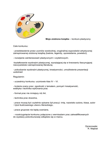Moja ulubiona książka – konkurs plastyczny Cele konkursu: - przedstawienie przez uczniów swobodnej, oryginalnej wypowiedzi artystycznej zainspirowanej ulubioną książką (baśnie, legendy, opowiadania, powieści); - rozwijanie zainteresowań plastycznych i czytelniczych; -kształtowanie wyobraźni plastycznej, wyrażającej się w kreowaniu fascynującej rzeczywistości zainspirowanej literaturą; - pobudzanie wyobraźni plastycznej, kreatywności, umożliwienie prezentacji uzdolnień Regulamin: - uczestnicy konkursu: uczniowie klas IV – VI. - kryteria oceny prac: zgodność z tematem, pomysł i kreatywność, estetyka i technika wykonania prac - format prac nie mniejszy niż A4, - technika prac dowolna, - prace muszą być czytelnie opisane (tył pracy): imię, nazwisko autora, klasa, autor i tytuł ilustrowanego utworu literackiego, - prace grupowe nie będą oceniane, - rozstrzygnięcie konkursu połączone z wernisażem prac zakwalifikowanych do wystawy pokonkursowej odbędzie się w marcu. Opracowała: R. Majblat