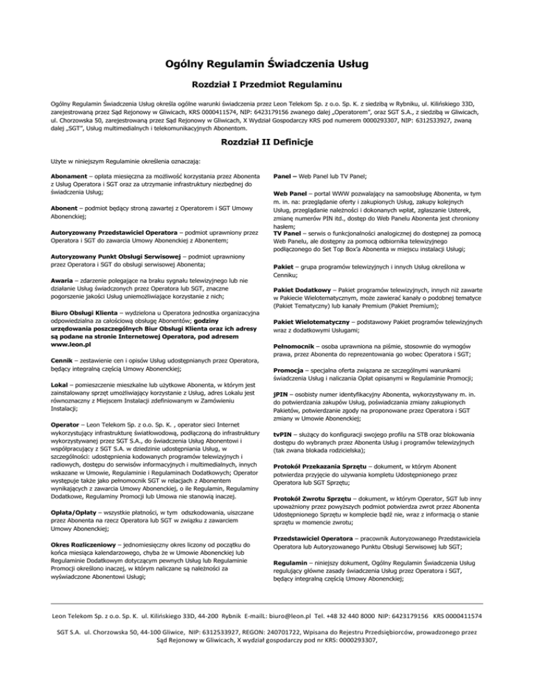Ogólny Regulamin Świadczenia Usług Rozdział I Przedmiot Regulaminu Ogólny Regulamin Świadczenia Usług określa ogólne warunki świadczenia przez Leon Telekom Sp. z o.o. Sp. K. z siedzibą w Rybniku, ul. Kilińskiego 33D, zarejestrowaną przez Sąd Rejonowy w Gliwicach, KRS 0000411574, NIP: 6423179156 zwanego dalej „Operatorem”, oraz SGT S.A., z siedzibą w Gliwicach, ul. Chorzowska 50, zarejestrowaną przez Sąd Rejonowy w Gliwicach, X Wydział Gospodarczy KRS pod numerem 0000293307, NIP: 6312533927, zwaną dalej „SGT”, Usług multimedialnych i telekomunikacyjnych Abonentom. Rozdział II Definicje Użyte w niniejszym Regulaminie określenia oznaczają: Abonament – opłata miesięczna za możliwość korzystania przez Abonenta z Usług Operatora i SGT oraz za utrzymanie infrastruktury niezbędnej do świadczenia Usług; Abonent – podmiot będący stroną zawartej z Operatorem i SGT Umowy Abonenckiej; Autoryzowany Przedstawiciel Operatora – podmiot uprawniony przez Operatora i SGT do zawarcia Umowy Abonenckiej z Abonentem; Autoryzowany Punkt Obsługi Serwisowej – podmiot uprawniony przez Operatora i SGT do obsługi serwisowej Abonenta; Awaria – zdarzenie polegające na braku sygnału telewizyjnego lub nie działanie Usług świadczonych przez Operatora lub SGT, znaczne pogorszenie jakości Usług uniemożliwiające korzystanie z nich; Biuro Obsługi Klienta – wydzielona u Operatora jednostka organizacyjna odpowiedzialna za całościową obsługę Abonentów; godziny urzędowania poszczególnych Biur Obsługi Klienta oraz ich adresy są podane na stronie Internetowej Operatora, pod adresem www.leon.pl Cennik – zestawienie cen i opisów Usług udostępnianych przez Operatora, będący integralną częścią Umowy Abonenckiej; Lokal – pomieszczenie mieszkalne lub użytkowe Abonenta, w którym jest zainstalowany sprzęt umożliwiający korzystanie z Usług, adres Lokalu jest równoznaczny z Miejscem Instalacji zdefiniowanym w Zamówieniu Instalacji; Operator – Leon Telekom Sp. z o.o. Sp. K. , operator sieci Internet wykorzystujący infrastrukturę światłowodową, podłączoną do infrastruktury wykorzystywanej przez SGT S.A., do świadczenia Usług Abonentowi i współpracujący z SGT S.A. w dziedzinie udostępniania Usług, w szczególności: udostępnienia kodowanych programów telewizyjnych i radiowych, dostępu do serwisów informacyjnych i multimedialnych, innych wskazane w Umowie, Regulaminie i Regulaminach Dodatkowych; Operator występuje także jako pełnomocnik SGT w relacjach z Abonentem wynikających z zawarcia Umowy Abonenckiej, o ile Regulamin, Regulaminy Dodatkowe, Regulaminy Promocji lub Umowa nie stanowią inaczej. Opłata/Opłaty – wszystkie płatności, w tym odszkodowania, uiszczane przez Abonenta na rzecz Operatora lub SGT w związku z zawarciem Umowy Abonenckiej; Okres Rozliczeniowy – jednomiesięczny okres liczony od początku do końca miesiąca kalendarzowego, chyba że w Umowie Abonenckiej lub Regulaminie Dodatkowym dotyczącym pewnych Usług lub Regulaminie Promocji określono inaczej, w którym naliczane są należności za wyświadczone Abonentowi Usługi; Panel – Web Panel lub TV Panel; Web Panel – portal WWW pozwalający na samoobsługę Abonenta, w tym m. in. na: przeglądanie oferty i zakupionych Usług, zakupy kolejnych Usług, przeglądanie należności i dokonanych wpłat, zgłaszanie Usterek, zmianę numerów PIN itd., dostęp do Web Panelu Abonenta jest chroniony hasłem; TV Panel – serwis o funkcjonalności analogicznej do dostępnej za pomocą Web Panelu, ale dostępny za pomocą odbiornika telewizyjnego podłączonego do Set Top Box’a Abonenta w miejscu instalacji Usługi; Pakiet – grupa programów telewizyjnych i innych Usług określona w Cenniku; Pakiet Dodatkowy – Pakiet programów telewizyjnych, innych niż zawarte w Pakiecie Wielotematycznym, może zawierać kanały o podobnej tematyce (Pakiet Tematyczny) lub kanały Premium (Pakiet Premium); Pakiet Wielotematyczny – podstawowy Pakiet programów telewizyjnych wraz z dodatkowymi Usługami; Pełnomocnik – osoba uprawniona na piśmie, stosownie do wymogów prawa, przez Abonenta do reprezentowania go wobec Operatora i SGT; Promocja – specjalna oferta związana ze szczególnymi warunkami świadczenia Usług i naliczania Opłat opisanymi w Regulaminie Promocji; jPIN – osobisty numer identyfikacyjny Abonenta, wykorzystywany m. in. do potwierdzania zakupów Usług, poświadczania zmiany zakupionych Pakietów, potwierdzanie zgody na proponowane przez Operatora i SGT zmiany w Umowie Abonenckiej; tvPIN – służący do konfiguracji swojego profilu na STB oraz blokowania dostępu do wybranych przez Abonenta Usług i programów telewizyjnych (tak zwana blokada rodzicielska); Protokół Przekazania Sprzętu – dokument, w którym Abonent potwierdza przyjęcie do używania kompletu Udostępnionego przez Operatora lub SGT Sprzętu; Protokół Zwrotu Sprzętu – dokument, w którym Operator, SGT lub inny upoważniony przez powyższych podmiot potwierdza zwrot przez Abonenta Udostępnionego Sprzętu w komplecie bądź nie, wraz z informacją o stanie sprzętu w momencie zwrotu; Przedstawiciel Operatora – pracownik Autoryzowanego Przedstawiciela Operatora lub Autoryzowanego Punktu Obsługi Serwisowej lub SGT; Regulamin – niniejszy dokument, Ogólny Regulamin Świadczenia Usług regulujący główne zasady świadczenia Usług przez Operatora i SGT, będący integralną częścią Umowy Abonenckiej; Leon Telekom Sp. z o.o. Sp. K. ul. Kilińskiego 33D, 44-200 Rybnik E-mailL: [email protected] Tel. +48 32 440 8000 NIP: 6423179156 KRS 0000411574 SGT S.A. ul. Chorzowska 50, 44-100 Gliwice, NIP: 6312533927, REGON: 240701722, Wpisana do Rejestru Przedsiębiorców, prowadzonego przez Sąd Rejonowy w Gliwicach, X wydział gospodarczy pod nr KRS: 0000293307, Regulamin Promocji – Regulamin opisujący szczególne warunki świadczenia Usług w ramach danej Promoc