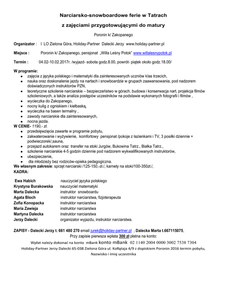 Narciarsko-snowboardowe ferie w Tatrach z zajęciami przygotowującymi do matury Poronin k/ Zakopanego Organizator : I LO Zielona Góra, Holiday-Partner Dalecki Jerzy www.holiday-partner.pl Miejsce : Poronin k/ Zakopanego, pensjonat „Willa Leśny Potok” www.willalesnypotok.pl Termin : 04.02-10.02.2017r. /wyjazd- sobota godz.8.00, powrót- piątek około godz.18.00/ W programie: zajęcia z języka polskiego i matematyki dla zainteresowanych uczniów klas trzecich, nauka oraz doskonalenie jazdy na nartach i snowboardzie w grupach zaawansowania, pod nadzorem doświadczonych instruktorów PZN, teoretyczne szkolenie narciarskie – bezpieczeństwo w górach, budowa i konserwacja nart, projekcja filmów szkoleniowych, a także analiza postępów uczestników na podstawie wykonanych fotografii i filmów , wycieczka do Zakopanego, nocny kulig z ogniskiem i kiełbaską, wycieczka na basen termalny , zawody narciarskie dla zainteresowanych, nocna jazda. W CENIE- 1190,- zł. przedsięwzięcia zawarte w programie pobytu, zakwaterowanie i wyżywienie, komfortowy pensjonat /pokoje z łazienkami i TV, 3 posiłki dziennie + podwieczorek/,sauna, przejazd autokarem oraz transfer na stoki Jurgów, Bukowina Tatrz., Białka Tatrz., szkolenie narciarskie 4-5 godzin dziennie pod nadzorem wykwalifikowanych instruktorów, ubezpieczenie, dla młodzieży bez rodziców-opieka pedagogiczna. We własnym zakresie: sprzęt narciarski /125-150,-zł./, karnety na stoki/100-350zł./, KADRA: Ewa Habich Krystyna Burakowska Marta Dalecka Agata Bloch Zofia Konopacka Maria Zawieja Martyna Dalecka Jerzy Dalecki nauczyciel języka polskiego nauczyciel matematyki instruktor snowboardu instruktor narciarstwa, fizjoterapeuta instruktor narciarstwa instruktor narciarstwa instruktor narciarstwa organizator wyjazdu, instruktor narciarstwa. ZAPISY - Dalecki Jerzy t. 661 480 270 email [email protected] , Dalecka Marta t.667115075, Przy zapisie pierwsza wpłata 300 zł płatna na konto: Wpłat należy dokonać na konto mBank konto mBank 02 1140 2004 0000 3002 7538 7304 Holiday-Partner Jerzy Dalecki 65-038 Zielona Góra ul. Kołłątaja 4/9 z dopiskiem Poronin 2016 termin pobytu, Nazwisko i Imię uczestnika