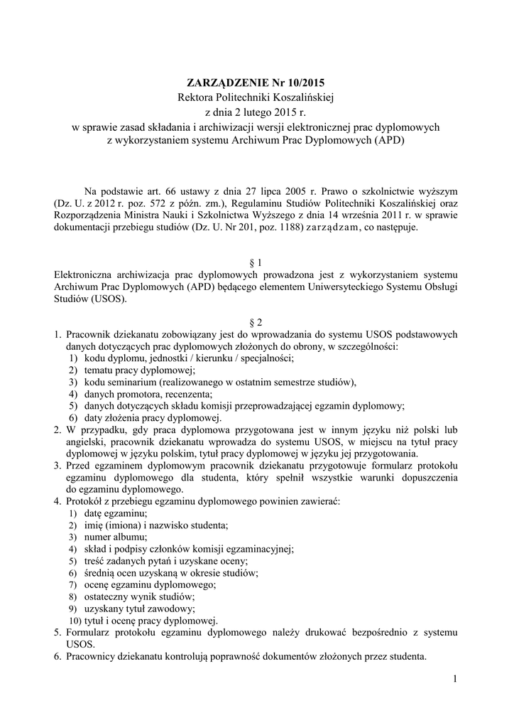 ZARZĄDZENIE Nr 10/2015 Rektora Politechniki Koszalińskiej z dnia 2 lutego 2015 r. w sprawie zasad składania i archiwizacji wersji elektronicznej prac dyplomowych z wykorzystaniem systemu Archiwum Prac Dyplomowych (APD) Na podstawie art. 66 ustawy z dnia 27 lipca 2005 r. Prawo o szkolnictwie wyższym (Dz. U. z 2012 r. poz. 572 z późn. zm.), Regulaminu Studiów Politechniki Koszalińskiej oraz Rozporządzenia Ministra Nauki i Szkolnictwa Wyższego z dnia 14 września 2011 r. w sprawie dokumentacji przebiegu studiów (Dz. U. Nr 201, poz. 1188) zarządzam, co następuje. §1 Elektroniczna archiwizacja prac dyplomowych prowadzona jest z wykorzystaniem systemu Archiwum Prac Dyplomowych (APD) będącego elementem Uniwersyteckiego Systemu Obsługi Studiów (USOS). §2 1. Pracownik dziekanatu zobowiązany jest do wprowadzania do systemu USOS podstawowych danych dotyczących prac dyplomowych złożonych do obrony, w szczególności: 1) kodu dyplomu, jednostki / kierunku / specjalności; 2) tematu pracy dyplomowej; 3) kodu seminarium (realizowanego w ostatnim semestrze studiów), 4) danych promotora, recenzenta; 5) danych dotyczących składu komisji przeprowadzającej egzamin dyplomowy; 6) daty złożenia pracy dyplomowej. 2. W przypadku, gdy praca dyplomowa przygotowana jest w innym języku niż polski lub angielski, pracownik dziekanatu wprowadza do systemu USOS, w miejscu na tytuł pracy dyplomowej w języku polskim, tytuł pracy dyplomowej w języku jej przygotowania. 3. Przed egzaminem dyplomowym pracownik dziekanatu przygotowuje formularz protokołu egzaminu dyplomowego dla studenta, który spełnił wszystkie warunki dopuszczenia do egzaminu dyplomowego. 4. Protokół z przebiegu egzaminu dyplomowego powinien zawierać: 1) datę egzaminu; 2) imię (imiona) i nazwisko studenta; 3) numer albumu; 4) skład i podpisy członków komisji egzaminacyjnej; 5) treść zadanych pytań i uzyskane oceny; 6) średnią ocen uzyskaną w okresie studiów; 7) ocenę egzaminu dyplomowego; 8) ostateczny wynik studiów; 9) uzyskany tytuł zawodowy; 10) tytuł i ocenę pracy dyplomowej. 5. Formularz protokołu egzaminu dyplomowego należy drukować bezpośrednio z systemu USOS. 6. Pracownicy dziekanatu kontrolują poprawność dokumentów złożonych przez studenta. 1 §3 1. Student przed przystąpieniem do egzaminu dyplomowego zobowiązany jest do: 1) podania lub uaktualnienia w dziekanacie wydziału/instytutu danych kontaktowych, w szczególności adresu e-mail; 2) wypełnienia w APD formularza zawierającego szczegółowe dane dotyczące pracy dyplomowej: tematu pracy w języku angielskim (jeżeli praca była przygotowana w języku polskim lub w języku innym niż język angielski), tematu pracy w języku polskim (jeżeli praca była przygotowana w języku innym niż polski), słów kluczowych i streszczenia w języku polskim (oraz w języku obcym, jeżeli praca została przygotowana w języku innym niż polski), po uprzednim uzgodnieniu treści tych danych z promotorem; 3) wprowadzenia do APD przygotowanej pracy dyplomowej w formacie PDF wraz z ewentualnymi załącznikami; 4) złożenia w dziekanacie kompletu dokumentów wymaganych do przystąpienia do egzaminu dyplomowego, w tym egzemplarza wydrukowanej z systemu APD pracy dyplomowej, zatwierdzonej przez kierującego pracą dyplomową (promotora); 5) złożenia dodatkowej dokumentacji wynikającej ze specyfiki studiów na kierunkach artystycznych. 2. Student zobowiązany jest do złożenia pracy dyplomowej w dziekanacie nie później niż tydzień przed planowanym terminem egzaminu dyplomowego. 3. W związku z Regulaminem antyplagiatowym student jest zobowiązany do dołączenia do pracy oświadczenia zgodnie z Załącznikiem Nr 1 do Regulaminu antyplagiatowego (Zarządzenie Rektora Nr 24/2014 z dnia 26 czerwca 2014 r.). §4 1. Strona tytułowa pracy dyplomowej musi zawierać obowiązkowo następujące elementy: 1) pełną nazwę uczelni (Politechnika Koszalińska); 2) nazwę podstawowej jednostki organizacyjnej; 3) rodzaj pracy dyplomowej (licencjacka/inżynierska/magisterska); 4) kierunek i specjalność studiów; 5) tytuł pracy dyplomowej w języku polskim i w języku angielskim; 6) imię (imiona) i nazwisko autora pracy dyplomowej; 7) numer albumu; 8) tytuł/stopień naukowy, imię (imiona) i nazwisko kierującego pracą dyplomową (promotora); 9) rok, w którym praca dyplomowa została złożona. 2. W przypadku, gdy praca dyplomowa przygotowywana jest w innym języku niż polski lub angielski, to na stronie tytułowej zamieszcza się tytuł w języku przygotowania pracy dyplomowej i w języku angielskim. Tytuł pracy w języku polskim umieszcza się na stronie kolejnej wraz ze streszczeniem w języku polskim. Powyższa praca dyplomowa musi zawierać streszczenie w języku polskim i w języku przygotowania pracy. §5 1. Warunki dopuszczenia studenta do egzaminu dyplomowego przeprowadzającej egzamin dyplomowy określa Regulamin Koszalińskiej oraz Regulamin antyplagiatowy. 2. Formę i zakres egzaminu dyplomowego na danym kierunku wydziału/instytutu. 3. Formularz oceny pracy dyplomowej znajdujący się w systemie APD odrębnie dla każdego z wydziałów/instytutów. oraz skład komisji Studiów Politechniki studiów określa rada może zostać określony 2 §6 Kierujący pracą dyplomową (promotor) zobowiązany jest do: 1) podania lub uaktualnienia w dziekanacie danych kontaktowych, a w szczególności adresu poczty elektronicznej; 2) współpracy ze studentem w zakresie ustalenia słów kluczowych pracy dyplomowej i jej streszczenia; 3) zatwierdzenia pracy, o której mowa w § 3 ust. 1 pkt 3; 4) wypełnienia oraz zatwierdzenia w systemie APD formularza oceny pracy dyplomowej nie później niż trzy dni przed terminem egzaminu dyplomowego; 5) przeprowadzenia kontroli oryginalności pracy zgodnie z Regulaminem antyplagiatowym oraz złożenia w dziekanacie wypełnionego i podpisanego protokołu stanowiącego Załącznik Nr 2 do Regulaminu antyplagi