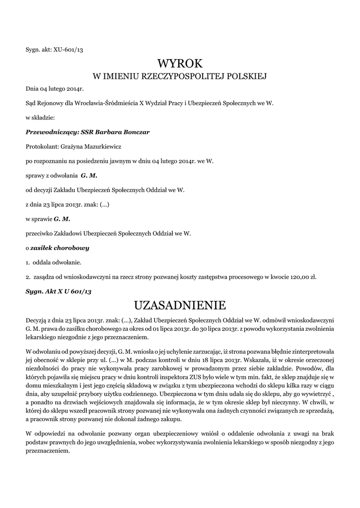 Sygn. akt: XU-601/13 WYROK W IMIENIU RZECZYPOSPOLITEJ POLSKIEJ Dnia 04 lutego 2014r. Sąd Rejonowy dla Wrocławia-Śródmieścia X Wydział Pracy i Ubezpieczeń Społecznych we W. w składzie: Przewodniczący: SSR Barbara Bonczar Protokolant: Grażyna Mazurkiewicz po rozpoznaniu na posiedzeniu jawnym w dniu 04 lutego 2014r. we W. sprawy z odwołania G. M. od decyzji Zakładu Ubezpieczeń Społecznych Oddział we W. z dnia 23 lipca 2013r. znak: (...) w sprawie G. M. przeciwko Zakładowi Ubezpieczeń Społecznych Oddział we W. o zasiłek chorobowy 1. oddala odwołanie. 2. zasądza od wnioskodawczyni na rzecz strony pozwanej koszty zastępstwa procesowego w kwocie 120,00 zł. Sygn. Akt X U 601/13 UZASADNIENIE Decyzją z dnia 23 lipca 2013r. znak: (...), Zakład Ubezpieczeń Społecznych Oddział we W. odmówił wnioskodawczyni G. M. prawa do zasiłku chorobowego za okres od 01 lipca 2013r. do 30 lipca 2013r. z powodu wykorzystania zwolnienia lekarskiego niezgodnie z jego przeznaczeniem. W odwołaniu od powyższej decyzji, G. M. wniosła o jej uchylenie zarzucając, iż strona pozwana błędnie zinterpretowała jej obecność w sklepie przy ul. (...) w M. podczas kontroli w dniu 18 lipca 2013r. Wskazała, iż w okresie orzeczonej niezdolności do pracy nie wykonywała pracy zarobkowej w prowadzonym przez siebie zakładzie. Powodów, dla których pojawiła się miejscu pracy w dniu kontroli inspektora ZUS było wiele w tym min. fakt, że sklep znajduje się w domu mieszkalnym i jest jego częścią składową w związku z tym ubezpieczona wchodzi do sklepu kilka razy w ciągu dnia, aby uzupełnić przybory użytku codziennego. Ubezpieczona w tym dniu udała się do sklepu, aby go wywietrzyć , a ponadto na drzwiach wejściowych znajdowała się informacja, że w tym okresie sklep był nieczynny. W chwili, w której do sklepu wszedł pracownik strony pozwanej nie wykonywała ona żadnych czynności związanych ze sprzedażą, a pracownik strony pozwanej nie dokonał żadnego zakupu. W odpowiedzi na odwołanie pozwany organ ubezpieczeniowy wniósł o oddalenie odwołania z uwagi na brak podstaw prawnych do jego uwzględnienia, wobec wykorzystywania zwolnienia lekarskiego w sposób niezgodny z jego przeznaczeniem. Sąd ustalił następujący stan faktyczny: Ubezpieczona G. M., prowadzi działalność gospodarczą w formie sklepu ogrodniczego pod nazwą „O.’ z siedzibą w M. przy ul. (...). Sklep jest usytuowany w domu mieszkalnym, który jest położony na terenie większego osiedla. Na terenie tego osiedla jest to jedyny tego rodzaju sklep. Ubezpieczona nie zatrudnia pracowników. Przy prowadzeniu sklepu pomaga jej mąż H. M., który zajmuje się rozładowaniem przywiezionego towaru. Wszystkie czynności związane z prowadzeniem sklepu wykonuje sama wnioskodawczyni; prowadzi sprzedaż, wykonuje prace porządkowe. Sklep jest usytuowany w taki sposób, że wejście do niego prowadzi z ulicy, a z niego można udać się do części mieszkalnej, do której prowadzi również osobne wejście. W okresie od 01 lipca 2013r. wnioskodawczyni przebywała na zwolnieniu lekarskim, zwolnienie lekarskie otrzymał do 30 lipca 2013r. W dniu 18 lipca 2013r. wnioskodawczyni była w sklepie. Drzwi sklepu były otwarte. Na drzwiach sklepu jak również na szybie okna brak było informacji, że sklep jest nieczynny. Ok. godz. 13.10 do sklepu wszedł pracownik strony pozwanej dokonujący kontroli zasadności wystawionego wnioskodawczyni zwolnienia lekarskiego za okres od 01.07.2013r. do 30.07.2013r. i zastał wnioskodawczynię stojącą za ladą. Z jej zachowania wynikało, że zamierza ona obsłużyć wchodzącego do sklepu klienta – pracownika strony pozwanej. Oprócz wnioskodawczyni w sklepie nie było innych osób obsługujących. Na tę okoliczność sporządzili protokół, do treści którego wnioskodawczyni zgłosiła uwagi i oświadczyła, że w sklepie wycierała półki i porządkowała. Wspólnie z pracownikiem strony pozwanej próbowała odnaleźć informację umieszczoną wg. relacji wnioskodawczyni na szybie witryny, że :sklep jest nieczynny”, ale żadnej kartki z taką informacją nie udało się odnaleźć w sklepie i poza nim. Dowód: - akta ZUS - zeznania świadka R. S. (1) - k. 13 akt - zeznania świadka H. M. – k. 14 akt - przesłuchanie wnioskodawczyni – k. 29 akt. W sklepie ubezpieczona prowadzi fasę fiskalną, która rejestruje dokonaną sprzedaż. W okresie niezdolności wnioskodawczyni do pracy kasa fiskalna była nieczynna. W tym okresie do sklepu wnioskodawczyni został dostarczony towar w dniach: 03, 17, 29, lipca, którego odbiór potwierdził mąż wnioskodawczyni H. M.. W dniu 13 lipca 2013r. wnioskodawczyni dokonała zakupu towarów w firmie(...) na kwotę 661 zł. Z przedłożonego zestawienia dokonanych w lipcu 2013r. operacji finansowych wynika, że w tym okresie wnioskodawczyni dokonywała zarówno sprzedaży jak i zakupu artykułów objętych sprzedażą w sklepie. Sąd zważył, co następuje: Odwołanie wnioskodawczyni nie zasługuje na uwzględnienie. Kwestią sporną było ustalenie czy wnioskodawczyni G. M. wykorzystała zwolnienie lekarskie niezgodnie z jego przeznaczeniem i czy w okresie orzeczonej niezdolności do pracy wykonywała pracę zarobkową. Ustalając stan faktyczny Sąd oparł się na dokumentacji dostarczonej przez pozwany organ, jak również wiarygodnych zeznaniach świadków R. S. (1), H. M. i przesłuchania wnioskodawczyni. Zgodnie z art. 17 ust 1. ustawy o świadczeniach pieniężnych z ubezpieczenia społecznego w razie choroby i macierzyństwa z dnia 25 czerwca 1999 r. „ubezpieczony wykonujący w okresie orzeczonej niezdolności do pracy pracę zarobkową lub wykorzystujący zwolnienie od pracy w sposób niezgodny z celem tego zwolnienia traci prawo do zasiłku chorobowego za cały okres tego zwolnienia”. Podjęcie zatem pracy zarobkowej w okresie zwolnienia uzasadnia domniemanie, że pracownik nie jest w rzeczywistości niezdolny do