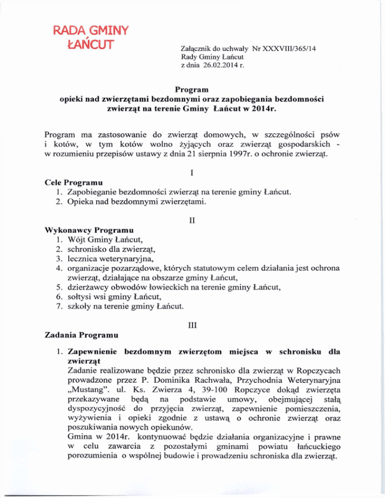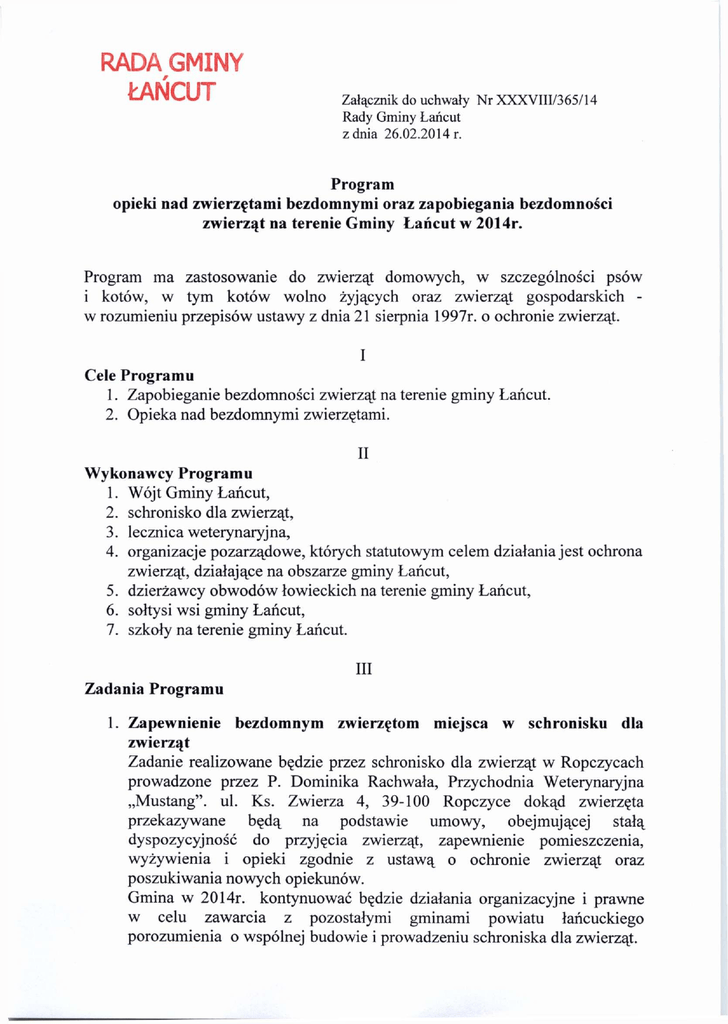 RADA GMINY ŁAŃCUT Załącznik d o uchwały N r X X X V I I I / 3 6 5 / 1 4 R a d y G m i n y Łańcut z dnia 26.02.2014 r. Program o p i e k i n a d zwierzętami b e z d o m n y m i o r a z z a p o b i e g a n i a bezdomności zwierząt n a t e r e n i e G m i n y Łańcut w 2 0 1 4 r . P r o g r a m m a z a s t o s o w a n i e d o zwierząt d o m o w y c h , w szczególności psów i kotów, w t y m kotów w o l n o żyjących o r a z zwierząt g o s p o d a r s k i c h w r o z u m i e n i u przepisów u s t a w y z d n i a 2 1 s i e r p n i a 1 9 9 7 r . o o c h r o n i e zwierząt. I Cele P r o g r a m u 1. Z a p o b i e g a n i e bezdomności zwierząt n a t e r e n i e g m i n y Łańcut. 2 . O p i e k a n a d b e z d o m n y m i zwierzętami. II Wykonawcy Programu 1. Wójt G m i n y Łańcut, 2 . s c h r o n i s k o d l a zwierząt, 3. lecznica w e t e r y n a r y j n a , 4 . o r g a n i z a c j e pozarządowe, których s t a t u t o w y m c e l e m działania j e s t o c h r o n a zwierząt, działające n a o b s z a r z e g m i n y Łańcut, 5. dzierżawcy obwodów łowieckich n a t e r e n i e g m i n y Łańcut, 6 . sołtysi w s i g m i n y Łańcut, 7 . szkoły n a t e r e n i e g m i n y Łańcut. III Zadania Programu 1 . Z a p e w n i e n i e b e z d o m n y m zwierzętom m i e j s c a w s c h r o n i s k u d l a zwierząt Z a d a n i e r e a l i z o w a n e będzie p r z e z s c h r o n i s k o d l a zwierząt w R o p c z y c a c h p r o w a d z o n e p r z e z P . D o m i n i k a Rachwała, P r z y c h o d n i a W e t e r y n a r y j n a „Mustang", u l . K s . Z w i e r z a 4 , 3 9 - 1 0 0 R o p c z y c e dokąd zwierzęta przekazywane będą n a p o d s t a w i e umowy, obejmującej stałą dyspozycyjność d o przyjęcia zwierząt, z a p e w n i e n i e pomieszczenia, wyżywienia i o p i e k i z g o d n i e z ustawą o o c h r o n i e zwierząt o r a z p o s z u k i w a n i a n o w y c h opiekunów. G m i n a w 2 0 1 4 r . kontynuować będzie działania o r g a n i z a c y j n e i p r a w n e w c e l u z a w a r c i a z pozostałymi g m i n a m i p o w i a t u łańcuckiego p o r o z u m i e n i a o wspólnej b u d o w i e i p r o w a d z e n i u s c h r o n i s k a d l a zwierząt. 2 . O p i e k a n a d w o l n o żyjącymi k o t a m i , w t y m i c h d o k a r m i a n i e Z a d a n i e r e a l i z o w a n e będzie p r z y u d z i a l e o r g a n i z a c j i pozarządowych o r a z w o l o n t a r i u s z y spośród młodzieży s z k o l n e j p o p r z e z d o k a r m i a n i e w o l n o żyjących kotów. 3 . Odławianie b e z d o m n y c h zwierząt: Z a d a n i e r e a l i z o w a n e będzie p r z e z p o d m i o t odławiający zwierzęta lecznicę weterynaryjną „CANVET - L e c z n i c a W e t e r y n a r y j n a G r z e g o r z M i c h n o , A m b u l a t o r i u m W e t e r y n a r y j n e R y s z a r d C h u d z i k " u l . Piłsudskiego 4 0 , 3 7 - 1 0 0 Łańcut, z którą G m i n a m a zawartą umowę, każdorazowo n a zlecenie G m i n y l u b Policji. D o czasu przekazania d o schroniska lub d o a d o p c j i zwierzęciem opiekować się będzie p o d m i o t wyłapujący zwierzę zapewniający p o m i e s z c z e n i e , wyżywienie i opiekę z g o d n i e z ustawą o o c h r o n i e zwierząt o r a z niezbędne l e c z e n i e zwierząt c h o r y c h . 4 . S t e r y l i z a c j a i k a s t r a c j a zwierząt w s c h r o n i s k a c h d l a zwierząt: Sterylizację i kastrację wyłapanych zwierząt b e z d o m n y c h wykonywać będzie p o d m i o t odławiający zwierzę l u b s c h r o n i s k o n a każdorazowe z l e c e n i e g m i n y p r z e d p r z e k a z a n i e m zwierzęcia d o a d o p c j i , p o u z g o d n i e n i u z przyszłym o p i e k u n e m zwierzęcia. 5. P o s z u k i w a n i e właścicieli dla bezdomnych zwierząt: Wójt G m i n y , p o d m i o t odławiający, s c h r o n i s k o o r a z sołtysi w s i będą prowadzić działania zmierzające d o u s t a l e n i a właścicieli zabłąkanych zwierząt d o m o w y c h o r a z p o z y s k a n i a n o w y c h właścicieli d l a wyłapanych b e z d o m n y c h zwierząt, których właściciela n i e udało się ustalić f u n k c j o n u j e kącik a d o p c j i zwierząt n a s t r o n i e i n t e r n e t o w e j G m i n y o r a z s k r z y n k a e - m a i l o c h r o n a z w i e r z a t ( a > g m i n a l a n c u t . p l przyjmująca zgłoszenia o zaginięciu, a także o chęci a d o p c j i zabłąkanych zwierząt, n a t a b l i c a c h ogłoszeń w Urzędzie G m i n y i w t e r e n i e będą w y w i e s z a n e ogłoszenia w w e r s j i p a p i e r o w e j . Zwierzęta p r z e k a z y w a n e będą d o a d o p c j i n a p o d s t a w i e u m o w y a d o p c y j n e j . O s o b i e adoptującej zwierzę p r z e k a z a n e p r z e z Gminę l u b p o d m i o t odławiający przysługuje j e d n o r a z o w e w s p a r c i e f i n a n s o w e n a z a k u p k a r m y w wysokości 2 0 0 , - zł d l a psów, 1 0 0 , - zł d l a kotów, r e a l i z o w a n e w f o r m i e d i e t y w y d a w a n e j p r z e z p o d m i o t odławiający p r z y p r z e k a z y w a n i u zwierzęcia d o a d o p c j i . 6 . U s y p i a n i e ślepych miotów R e a l i z a c j a z a d a n i a t y l k o w p r z y p a d k u zwierząt b e z d o m n y c h n a z l e c e n i e G m i n y p r z e z p o d m i o t odławiający l u b s c h r o n i s k o z g o d n i e z zawartą umową. 7. W s k a z a n i e g o s p o d a r s t w a r o l n e g o w c e l u z a p e w n i e n i a m i e j s c a d l a zwierząt g o s p o d a r s k i c h : W 2014r. wskazane zostaje indywidualne gospodarstwo rolne w A l b i g o w e j 2 6 3 , posiadające o d p o w i e d n i e w a r u n k i d o przyjęcia krów, t r z o d y c h l e w n e j , k o n i , o w i e c i kóz. Z a d a n i e będzie r e a l i z o w a n e w o p a r c i u 0 umowę zawartą z właścicielem, obejmującą stałą dyspozycyjność d o przyjęcia zwierząt, z a
