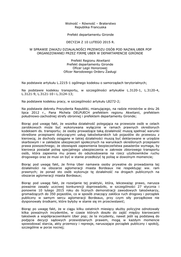 Wolność – Równość – Braterstwo Republika Francuska Prefekt departamentu Gironde DECYZJA Z 10 LUTEGO 2015 R. W SPRAWIE ZAKAZU DZIAŁALNOŚCI PRZEWOZU OSÓB POD NAZWĄ UBER POP ORGANIZOWANEJ PRZEZ FIRMĘ UBER W DEPARTAMENCIE GIRONDE Prefekt Regionu Akwitanii Prefekt departamentu Gironde Oficer Legii Honorowej Oficer Narodowego Orderu Zasługi Na podstawie artykułu L.2215-1 ogólnego kodeksu o samorządach terytorialnych; Na podstawie kodeksu transportu, w szczególności artykułów L.3120-1, L.3120-4, L.3121-9, L.3121-10 i L.3124-13; Na podstawie kodeksu pracy, w szczególności artykułu L8272-2; Na podstawie dekretu Prezydenta Republiki, mianującego, na radzie ministrów w dniu 26 lipca 2012 r., Pana Michela DELPUECH prefektem regionu Akwitanii, prefektem południowo-zachodniej strefy obronnej i prefektem departamentu Gironde; Biorąc pod uwagę fakt, że wszelka działalność polegająca na przewozie osób w celach zarobkowych może być wykonywana wyłącznie w ramach prawnych określonych kodeksem ds. transportu; że osoby prowadzące taką działalność muszą spełniać warunki określone przepisami dotyczącymi usług taksówkarskich lub pojazdów do przewozu z kierowcą; że dochody osiągane w takiej działalności muszą być deklarowane w urzędzie skarbowym i w zakładzie ubezpieczeń społecznych na warunkach określonych przepisami prawa powszechnego; że obowiązek zapewnienia bezpieczeństwa pasażerów wymaga, by kierowca posiadał polisę specjalnego ubezpieczenia w zakresie zbiorowego transportu osób, która zapewnia mu prawo do odszkodowania na rzecz użytkowników ruchu drogowego oraz że musi on być w stanie przedłożyć tę polisę w dowolnym momencie; Biorąc pod uwagę fakt, że firma Uber namawia osoby prywatne do prowadzenia tej działalności na obszarze aglomeracji miasta Bordeaux nie respektując ww. ram prawnych; że ponad sto osób wykonuje tę działalność na drogach publicznych na obszarze aglomeracji miasta Bordeaux; Biorąc pod uwagę fakt, że rozwijanie tej praktyki, która, lekceważąc prawo, narusza poważnie zasady uczciwej konkurencji doprowadziło, w szczególności 27 stycznia i ponownie 10 lutego 2015 roku do licznych demonstracji zawodowych taksówkarzy, gromadzących do 350 pojazdów, co w sposób znaczący zakłóca ruch drogowy i porządek publiczny w samym sercu aglomeracji Bordeaux, przy czym siły porządkowe nie dysponowały środkami, które byłyby w stanie się im przeciwstawić; Biorąc po uwagę fakt, że w ciągu kilku ostatnich miesięcy służby policyjne odnotowały kilka poważnych incydentów, w czasie których doszło do zajść między kierowcami taksówek a współpracownikami Uber pop; że te incydenty, nawet jeśli są podstawą do podjęcia decyzji sądowych przewidzianych prawem, mogą w każdym momencie spowodować starcia, akty przemocy i represje, naruszające porządek publiczny i spokój, szczególnie w porze nocnej; Biorąc pod uwagę fakt, że należy w związku z tym zakończyć bezprawną działalność leżącą u podstaw zamieszek, o których mowa wyżej; O propozycji dyrektora biura: DECYZJA Artykuł 1: Działalność polegająca na przewozie osób w celach zarobkowych pod nazwą Uber pop organizowana przez firmę Uber na terenie departamentu Gironde jest od tej pory zakazana. Nakazuje się osobom kierującym firmą Uber zakończyć tę działalność w trybie natychmiastowym. Artykuł 2: Dyrektor biura, sekretarz generalny prefektury departamentu Gironde, dyrektor departamentalny ds. bezpieczeństwa publicznego, pułkownik na stanowisku komendanta departamentalnej brygady żandarmerii, dyrektor okręgowy kompanii republikańskich ds. bezpieczeństwa mają za zadanie, każdy w swoim zakresie, wykonanie niniejszej decyzji. Sporządzono w Bordeaux, dnia 10 lutego 2015 r. Prefekt Michel DELPUECH Jeśli mają państwo zamiar wnieść sprzeciw od niniejszej decyzji, mogą Państwo użyć następujących środków odwoławczych: - Można do nas wysłać odwołanie wewnętrzne z uzasadnieniem, - Można złożyć odwołanie hierarchiczne w Ministerstwie ds. swobód obywatelskich, terytoriów zamorskich, samorządów terytorialnych i imigracji, Dyrekcji ds. swobód obywatelskich i spraw prawnych, w Biurze oraz w Biurze ds. policji administracyjnej. W przypadku braku odpowiedzi ze strony administracji w terminie dwóch miesięcy od dnia otrzymania odwołania, odwołanie powinno być uznane za odrzucone w sposób dorozumiany. - Można złożyć odwołanie sporne w sądzie administracyjnym w Bordeaux. To zaskarżenie decyzji może być złożone najpóźniej przed wygaśnięciem dwumiesięcznego okresu liczonego od dnia doręczenia zaskarżonej decyzji lub od dnia odrzucenia Państwa wewnętrznego lub hierarchicznego odwołania.
