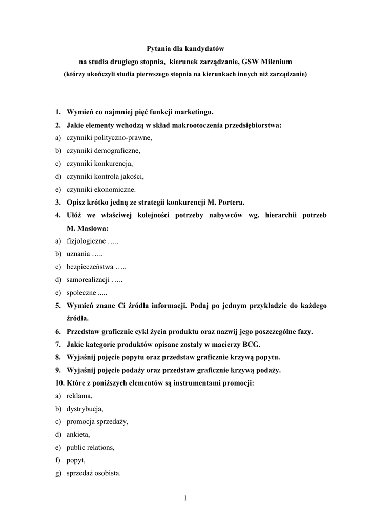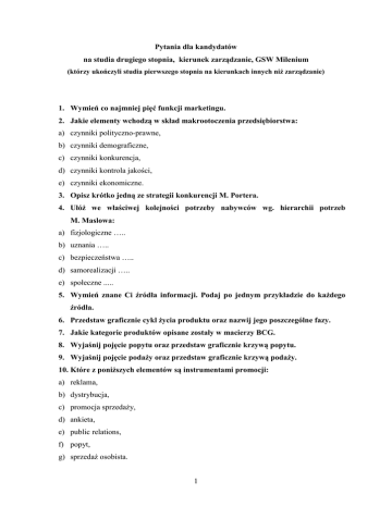Pytania dla kandydatów na studia drugiego stopnia, kierunek zarządzanie, GSW Milenium (którzy ukończyli studia pierwszego stopnia na kierunkach innych niŜ zarządzanie) 1. Wymień co najmniej pięć funkcji marketingu. 2. Jakie elementy wchodzą w skład makrootoczenia przedsiębiorstwa: a) czynniki polityczno-prawne, b) czynniki demograficzne, c) czynniki konkurencja, d) czynniki kontrola jakości, e) czynniki ekonomiczne. 3. Opisz krótko jedną ze strategii konkurencji M. Portera. 4. UłóŜ we właściwej kolejności potrzeby nabywców wg. hierarchii potrzeb M. Maslowa: a) fizjologiczne ….. b) uznania ….. c) bezpieczeństwa ….. d) samorealizacji ….. e) społeczne ..... 5. Wymień znane Ci źródła informacji. Podaj po jednym przykładzie do kaŜdego źródła. 6. Przedstaw graficznie cykl Ŝycia produktu oraz nazwij jego poszczególne fazy. 7. Jakie kategorie produktów opisane zostały w macierzy BCG. 8. Wyjaśnij pojęcie popytu oraz przedstaw graficznie krzywą popytu. 9. Wyjaśnij pojęcie podaŜy oraz przedstaw graficznie krzywą podaŜy. 10. Które z poniŜszych elementów są instrumentami promocji: a) reklama, b) dystrybucja, c) promocja sprzedaŜy, d) ankieta, e) public relations, f) popyt, g) sprzedaŜ osobista. 1 11. Zaznacz i przedstaw we właściwej kolejności etapy procesu zarządzania: a) analiza ….. b) planowanie ….. c) kontrola ….. d) organizowanie ….. e) finansowanie ….. f) rozwiązywanie konfliktów ….. g) przewodzenie ….. 12. Teoria X McGregora mówi Ŝe: a) pracownicy są twórczy, dąŜą do przyjmowania odpowiedzialności i potrafią sami kierować sobą, b) pracownicy nie lubią pracy, są leniwi, starają się unikać odpowiedzialności i trzeba ich zmuszać do wykonywania pracy, 13. Przedstaw we właściwej kolejności etapy procesu podejmowania decyzji: a) rozpoznanie problemu ….. b) wybór rozwiązania ….. c) ocena skuteczności decyzji ….. d) ustalenie kryteriów decyzyjnych ….. e) wdraŜanie rozwiązania ….. f) ocena moŜliwych rozwiązań ….. 14. Wymień zewnętrzne i wewnętrzne siły wywołujące konieczność zmian w organizacji. 15. Na czym polega kontrola prewencyjna: a) na przewidywaniu problemów zanim mogą się one pojawić, b) na bieŜącym korygowaniu zaistniałych rozbieŜności, c) na porównaniu i ocenie osiągniętych efektów z załoŜonymi celami. 16. Zaznacz prawidłową definicję nadwyŜki handlowej: a) dodatnia róŜnica między eksportem a importem, b) dodatnia róŜnica między popytem a podaŜą, c) dodatnia róŜnica między przychodem a dochodem przedsiębiorstwa, d) dodatnia róŜnica między kosztami stałymi a kosztami zmiennymi przedsiębiorstwa. 17. Pracę zespołową cechuje: a) współdziałanie, b) samodzielna praca na zlecenie szefa, 2 c) współpartnerstwo, d) udzielanie sobie pomocy. 18. Pionierami ideologii zarządzania zasobami ludzkimi byli między innymi: a) P. F. Drucker, b) K. Adamiecki, c) S. Stevin, d) J. Glenn, e) H. L. Gantt. 19. Zaznacz umiejętności skutecznych kierowników: a) umiejętności chemiczne, b) umiejętności koncepcyjne, c) umiejętności interpersonalne, d) umiejętności filozoficzne, e) umiejętności techniczne, f) umiejętności polityczne, g) umiejętności historyczne. 20. Jednym z etapów ustalania wynagrodzeń jest: a) wartościowanie pracy, b) wartościowanie płacy, c) kontrola finansowa firmy, d) Ŝadne z powyŜszych. 21. Do rekrutacji zewnętrznej zalicza się: a) ogłoszenia w radiu, prasie, TV, b) ogłoszenia w uczelniach, szkołach, c) konkursy zamknięte, d) rekomendacje pracowników, e) ogłoszenia w intranecie, biuletynie. 22. Zadania pracowników powinny być dopasowane do: a) strategii firmy, b) kompetencji pracowników, c) planu zatrudniania pracowników, d) wysokości wynagrodzenia, e) oczekiwań i wartości pracowników, f) wcześniejszych doświadczeń pracowników i organizacji w zakresie motywowania. 3 23. Bezpośrednie cele szkoleń pracowników to: a) zdobywanie i uzupełnianie wiedzy, b) poszerzanie horyzontów poznawczych pracownika, c) nabywanie i rozwijanie umiejętności zawodowych, d) kształtowanie właściwych postaw zawodowych, e) wzrost wynagrodzenia. 24. Zaznacz funkcje płac: a) informacyjna, b) bodźcowa, c) oszczędnościowa, d) wychowawcza, e) stymulacyjna. 25. Zaznacz strategie rozwiązywania konfliktów w przedsiębiorstwie: a) unikanie, b) uleganie, c) kontrolowanie, d) kompromis, e) narzucanie, f) negocjowanie, g) przemówienie, h) współpraca. 26. Zaznacz cechy charakteryzujące przywódcę transformacyjnego: a) osoba charyzmatyczna, w udany sposób posługująca się kontaktami wewnątrz i na zewnątrz organizacji w celu uzyskania innowacyjności, komunikatywności i elastyczności na wszystkich poziomach organizacji, b) osoba, która instrumentalnie traktuje strukturę organizacyjną, manipuluje nagrodami i karami w celu uzyskania poŜądanych zachowań, c) Ŝadna z powyŜszych cech przywódcy nie jest prawdziwa. 27. Czynniki wpływające na wielkość popytu to: a) preferencje i gusta konsumentów, b) technologia, c) cena, d) czynniki demograficzne, e) wszystkie wymienione. 4 28. Zaznacz właściwą definicję tzw. korzyści skali: a) korzyści płynące z produkcji towarów eksportowanych, b) korzyści płynące z produkcji masowej, charakteryzujące się malejącym kosztem produkcji, c) korzyści płynące z produkcji jednostkowej, charakteryzujące się wzrostem kosztów produkcji, d) korzyści związane z dzierŜawieniem lub najmem środków trwałych i dóbr konsumpcyjnych. 29. Zaznacz prawidłową definicje inflacji: a) zjawisko spadku ogólnego poziomu cen dóbr w pewnym okresie, b) zjawisko wzrostu ogólnego poziomu cen dóbr w pewnym okresie, c) zdolność budŜetu państwa do sfinansowania w danym okresie z uzyskanych dochodów wszystkich wydatków, d) zjawisko czasowego odroczenia zapłaty za nabywane towary. 30. Zaznacz metody ustalania cen: a) metody oparte na popycie, b) metody oparte 