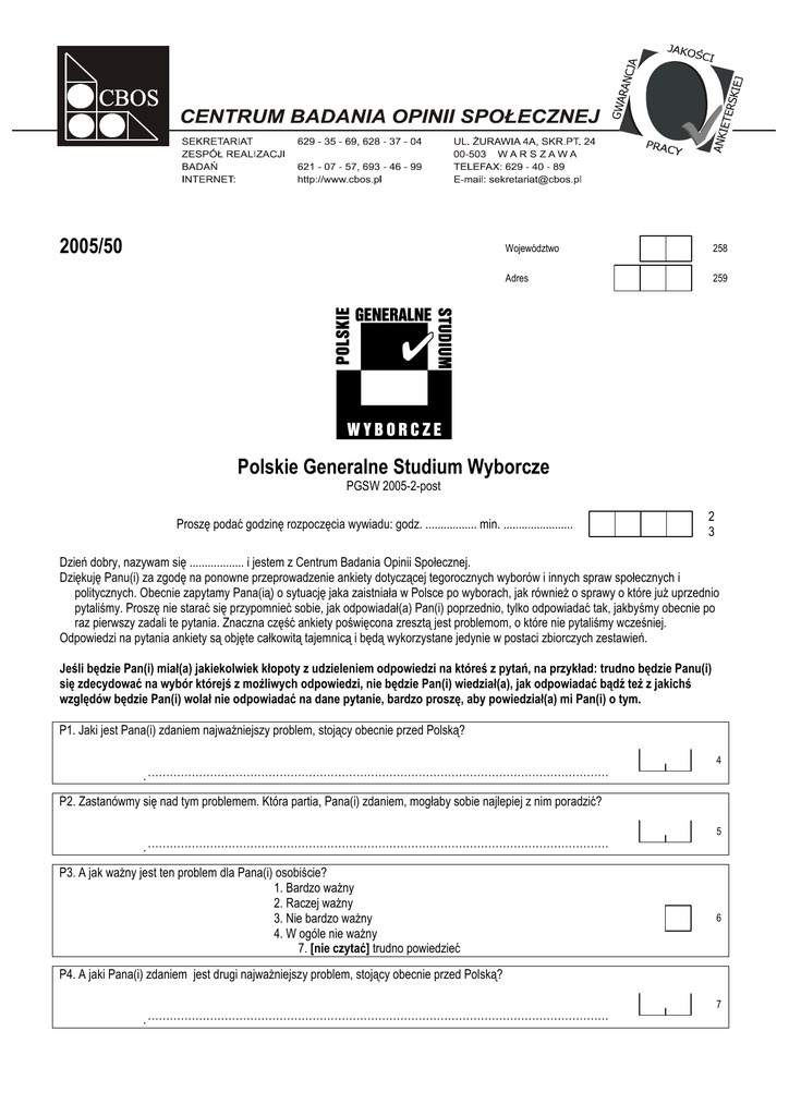 2005/50 Województwo 258 Adres 259 Polskie Generalne Studium Wyborcze PGSW 2005-2-post Proszę podać godzinę rozpoczęcia wywiadu: godz. ................. min. ....................... 2 3 Dzień dobry, nazywam się .................. i jestem z Centrum Badania Opinii Społecznej. Dziękuję Panu(i) za zgodę na ponowne przeprowadzenie ankiety dotyczącej tegorocznych wyborów i innych spraw społecznych i politycznych. Obecnie zapytamy Pana(ią) o sytuację jaka zaistniała w Polsce po wyborach, jak równieŜ o sprawy o które juŜ uprzednio pytaliśmy. Proszę nie starać się przypomnieć sobie, jak odpowiadał(a) Pan(i) poprzednio, tylko odpowiadać tak, jakbyśmy obecnie po raz pierwszy zadali te pytania. Znaczna część ankiety poświęcona zresztą jest problemom, o które nie pytaliśmy wcześniej. Odpowiedzi na pytania ankiety są objęte całkowitą tajemnicą i będą wykorzystane jedynie w postaci zbiorczych zestawień. Jeśli będzie Pan(i) miał(a) jakiekolwiek kłopoty z udzieleniem odpowiedzi na któreś z pytań, na przykład: trudno będzie Panu(i) się zdecydować na wybór którejś z moŜliwych odpowiedzi, nie będzie Pan(i) wiedział(a), jak odpowiadać bądź teŜ z jakichś względów będzie Pan(i) wolał nie odpowiadać na dane pytanie, bardzo proszę, aby powiedział(a) mi Pan(i) o tym. P1. Jaki jest Pana(i) zdaniem najwaŜniejszy problem, stojący obecnie przed Polską? 4 . P2. Zastanówmy się nad tym problemem. Która partia, Pana(i) zdaniem, mogłaby sobie najlepiej z nim poradzić? 5 . P3. A jak waŜny jest ten problem dla Pana(i) osobiście? 1. Bardzo waŜny 2. Raczej waŜny 3. Nie bardzo waŜny 4. W ogóle nie waŜny 7. [nie czytać] trudno powiedzieć 6 P4. A jaki Pana(i) zdaniem jest drugi najwaŜniejszy problem, stojący obecnie przed Polską? 7 . P5. Jak waŜny jest ten problem dla Pana(i) osobiście? 1. Bardzo waŜny 2. Raczej waŜny 3. Nie bardzo waŜny 4. W ogóle nie waŜny 7. [nie czytać] trudno powiedzieć 8 P6. Czy jest jeszcze jakiś inny waŜny problem? JeŜeli tak, to jaki? 9 . P7. Jak waŜny jest ten problem dla Pana(i) osobiście? 1. Bardzo waŜny 2. Raczej waŜny 3. Nie bardzo waŜny 4. W ogóle nie waŜny 7. [nie czytać] trudno powiedzieć 10 P8. Mówiąc ogólnie, czy jest Pan(i) zdecydowanie zadowolony(a), raczej zadowolony(a), raczej niezadowolony(a), czy zdecydowanie niezadowolony(a) z funkcjonowania demokracji w Polsce? 1. zdecydowanie zadowolony(a) 2. raczej zadowolony(a) 11 3. raczej niezadowolony(a) 4. zdecydowanie niezadowolony(a) 7. [nie czytać] trudno powiedzieć ANKIETER: wręczyć respondentowi KARTĘ 1. P9. Niektórzy mówią, Ŝe to kto rządzi ma znaczenie. Inni mówią, Ŝe to kto rządzi nie ma znaczenia. UŜywając skali na karcie, gdzie JEDEN oznacza, Ŝe to, kto rządzi ma duŜe znaczenie, a PIĘĆ, Ŝe to, kto rządzi nie ma Ŝadnego znaczenia, proszę zaznaczyć, jak określił(a)by Pan(i) swoje stanowisko. To, kto rządzi ma To, kto rządzi nie duŜe znaczenie ma Ŝadnego znaczenia 12 x------------------------x------------------------x------------------------x------------------------x 1 2 3 4 5 7). [nie czytać] trudno powiedzieć ANKIETER: odebrać od respondenta KARTĘ 1. P10. Jak ogólnie ocenia Pan(i) działalność rządów SLD w ciągu ostatnich czterech lat? 1. bardzo dobrze 2. dobrze 3. źle 4. bardzo źle 7. [nie czytać] trudno powiedzieć P11. Czy o najwaŜniejszych sprawach w Polsce, Pana(i) zdaniem, powinien decydować Sejm i wybrany przez niego rząd, czy Prezydent? 1. zdecydowanie Sejm i rząd 2. raczej Sejm i rząd 3. raczej Prezydent 4. zdecydowanie Prezydent 7. [nie czytać] trudno powiedzieć 13 14 ANKIETER: wręczyć respondentowi KARTĘ 2. P12. Czy Pana(i) zdaniem poseł w swoim działaniu w Sejmie powinien kierować się: Tylko tym, czego chcą Tylko własną wiedzą i sumieniem jego wyborcy – powinien niezaleŜnie od opinii wyborców realizować ich wolę x------------------------x------------------------x------------------------x------------------------x 1 2 3 4 5 7). [nie czytać] trudno powiedzieć ANKIETER: odebrać od respondenta KARTĘ 2.. 2 15 ANKIETER: wręczyć respondentowi KARTĘ 3. P13. Czyje interesy przede wszystkim powinien Pana(i) zdaniem reprezentować poseł? Proszę wybrać z karty pozycję, która najlepiej odzwierciedla Pana(i) pogląd w tej sprawie. 1. ogółu mieszkańców Polski 2. ogółu mieszkańców swojego regionu 3. swoich wyborców, czyli tych, którzy faktycznie na niego głosowali 16 4. komitetu wyborczego, partii lub innej organizacji, która wysunęła jego kandydaturę 5. swoje środowisko społeczno-zawodowe (np. ludzi wykonujących podobną pracę, ludzi podobnie myślący 7. trudno powiedzieć ANKIETER: odebrać od respondenta KARTĘ 3. P14. Wyobraźmy sobie, Ŝe w Pana(i) okręgu wyborczym startuje dwójka kandydatów do parlamentu reprezentujących tą samą partię - o takim samym wykształceniu, wieku, zamoŜności, pochodzeniu i programie, tak samo dobrze znanych. Jedyne co ich róŜni to płeć; jedno jest kobietą, drugie męŜczyzną. Na kogo w takiej sytuacji oddałby Pan(i) swój głos? 1. na kobietę 17 2. na męŜczyznę 7. trudno powiedzieć ANKIETER: wręczyć respondentowi KARTĘ 4. P15. Chcielibyśmy dowiedzieć się, co sądzi Pan(i) o kaŜdej z wymienionych tu partii i ugrupowań politycznych. Gdy przeczytam Panu(i) nazwę partii politycznej, proszę umieścić ją na skali od 0 do 10, gdzie 0 oznacza, Ŝe partia ta zdecydowanie się Panu(i) nie podoba, a 10, Ŝe się ona Panu(i) zdecydowanie podoba. Jeśli nie słyszał(a) Pan(i) o którejś partii lub nie wie o niej dość, by ją ocenić, proszę to powiedzieć. x------------x------------x------------x------------x------------x------------x------------x------------x------------x------------x 00 01 02 03 04 05 06 07 08 09 10 96) nie znam tej partii 97) [nie czytać] trudno powiedzieć A. Liga Polskich Rodzin (LPR) --------------------------------------------------------------