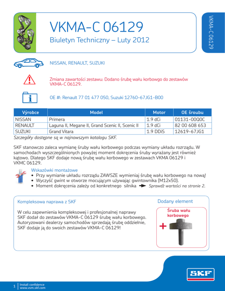 VKMA-C 06129 VKMA-C 06129 Biuletyn Techniczny – Luty 2012 NISSAN, RENAULT, SUZUKI Zmiana zawartości zestawu: Dodano śrubę wału korbowgo do zestawów VKMA-C 06129. OE #: Renault 77 01 477 050, Suzuki 12760-67JG1-B00 Výrobce Model NISSAN Primera RENAULT Laguna II, Megane II, Grand Scenic II, Scenic II SUZUKI Grand Vitara Szczegóły dostępne są w najnowszym katalogu SKF. Motor OE šroubu 1.9 dCi 1.9 dCi 1.9 DDiS 01131-00Q0C 82 00 608 653 12619-67JG1 SKF stanowczo zaleca wymianę śruby wału korbowego podczas wymiany układu rozrządu. W samochodach wyszczególnionych powyżej moment dokręcenia śruby wyrażany jest również kątowo. Dlatego SKF dodaje nową śrubę wału korbowego w zestawach VKMA 06129 i VKMC 06129. Wskazówki montażowe • Przy wymianie układu rozrządu ZAWSZE wymieniaj śrubę wału korbowego na nową! • Wyczyść gwint w otworze mocującym używając gwintownika (M12x50). • Moment dokręcenia zależy od konkretnego silnika Sprawdź wartości na stronie 2. Kompleksowa naprawa z SKF W celu zapewnienia kompleksowej i profesjonalnej naprawy SKF dodał do zestawów VKMA-C 06129 śrubę wału korbowego. Autoryzowani dealerzy samochodów sprzedają śrubę oddzielnie, SKF dodaje ją do swoich zestawów VKMA-C 06129! 1 Install confidence www.vsm.skf.com Dodany element Śruba wału korbowego + Model Model Engine code Kod silnika * Materiały OE ® SKF to zastrzeżony znak handlowy SKF Group. © SKF Group 2012 Treść niniejszej publikacji jest własnością wydawcy i nie może być reprodukowane (nawet częściowo) bez uprzedniego pisemnego pozwolenia. Zapewniono dokładność informacji zawartych w niniejszej publikacji, ale wydawca nie przyjmuje żadnej odpowiedzialności za jakiekolwiek szkody lub straty pośrednie, bezpośrednie lub wtórne wynikające z wykorzystania informacji tu zawartych. 2 Install confidence www.vsm.skf.com Momentbolt Koniec Crankshaft Start Początek End dokręcenia śruby pro- tightening produkcji torque* date date wału korbowego* dukcji