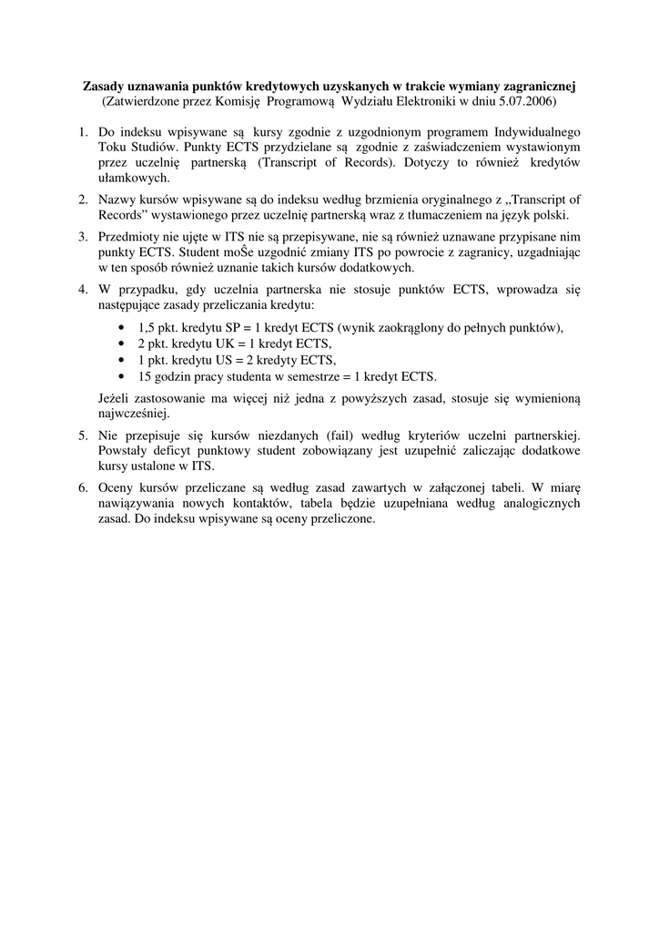 Zasady uznawania punktów kredytowych uzyskanych w trakcie wymiany zagranicznej (Zatwierdzone przez Komisję Programową Wydziału Elektroniki w dniu 5.07.2006) 1. Do indeksu wpisywane są kursy zgodnie z uzgodnionym programem Indywidualnego Toku Studiów. Punkty ECTS przydzielane są zgodnie z zaświadczeniem wystawionym przez uczelnię partnerską (Transcript of Records). Dotyczy to również kredytów ułamkowych. 2. Nazwy kursów wpisywane są do indeksu według brzmienia oryginalnego z „Transcript of Records” wystawionego przez uczelnię partnerską wraz z tłumaczeniem na język polski. 3. Przedmioty nie ujęte w ITS nie są przepisywane, nie są również uznawane przypisane nim punkty ECTS. Student moŜe uzgodnić zmiany ITS po powrocie z zagranicy, uzgadniając w ten sposób również uznanie takich kursów dodatkowych. 4. W przypadku, gdy uczelnia partnerska nie stosuje punktów ECTS, wprowadza się następujące zasady przeliczania kredytu: • • • • 1,5 pkt. kredytu SP = 1 kredyt ECTS (wynik zaokrąglony do pełnych punktów), 2 pkt. kredytu UK = 1 kredyt ECTS, 1 pkt. kredytu US = 2 kredyty ECTS, 15 godzin pracy studenta w semestrze = 1 kredyt ECTS. Jeżeli zastosowanie ma więcej niż jedna z powyższych zasad, stosuje się wymienioną najwcześniej. 5. Nie przepisuje się kursów niezdanych (fail) według kryteriów uczelni partnerskiej. Powstały deficyt punktowy student zobowiązany jest uzupełnić zaliczając dodatkowe kursy ustalone w ITS. 6. Oceny kursów przeliczane są według zasad zawartych w załączonej tabeli. W miarę nawiązywania nowych kontaktów, tabela będzie uzupełniana według analogicznych zasad. Do indeksu wpisywane są oceny przeliczone. Tabela ocen kursów ukończonych za granicą (zmodyfikowana kwiecień 2009) Oceny polskie Oceny ECTS Oceny ang./irl. Oceny niemieckie Oceny austriackie Oceny francuskie 5,5 -- ≥90 1,0 - 19-20 11,13 - 19-20 5,0 A 70-90 (1,0;1,5] 1 17-18 10 12 17-18 4,5 B 60-69 (1,5;2,0] 2 14-16 9 10 15-16 4,0 C 50-59 (2,0;3,0) 3 11-13 8 7 13-14 3,5 D 45-49 [3,0;3,5) - 9-10 7 4 11-12 3,0 E 40-44 [3,5;4,0] 4 7-8 6 02 10 2,0 F, FX <40 >4,0 >4 <7 5,3/0 0/-3 <10 Oceny portugalskie Oceny duńskie W przypadku uczelni hiszpańskich, nadrzędne znaczenie mają oceny ECTS. Przeliczenie ocen lokalnych można stosować jedynie w sytuacjach awaryjnych, braku możliwości uzyskania informacji o ocenach ECTS z uczelni zagranicznej. Oceny polskie Oceny hiszpańskie Oceny Kansas Oceny finskie 5,5 10 - - 5,0 9-9,9 A 5 4,5 8-8,9 B 4 4,0 7-7,9 C 3 3,5 6-6,9 - 2 3,0 5-5,9 D 1 2,0 <5 F 0