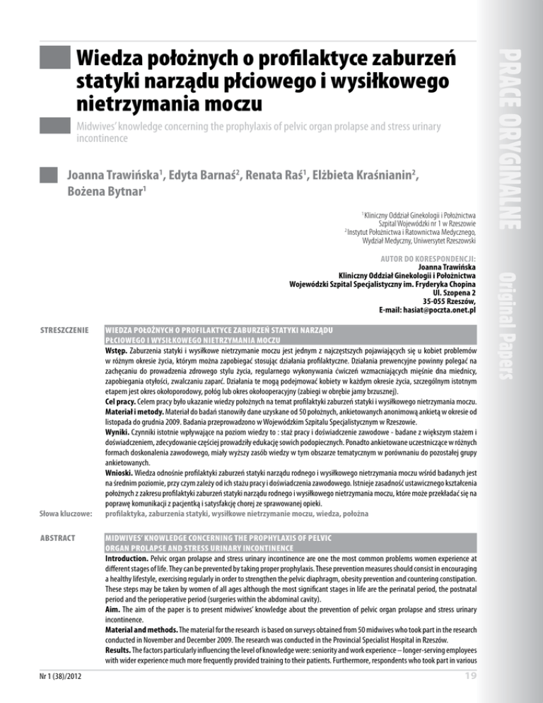 Wiedza położnych o profilaktyce zaburzeń statyki narządu płciowego i wysiłkowego nietrzymania moczu Midwives’ knowledge concerning the prophylaxis of pelvic organ prolapse and stress urinary incontinence Joanna Trawińska1, Edyta Barnaś2, Renata Raś1, Elżbieta Kraśnianin2, Bożena Bytnar1 Kliniczny Oddział Ginekologii i Położnictwa Szpital Wojewódzki nr 1 w Rzeszowie 2 Instytut Położnictwa i Ratownictwa Medycznego, Wydział Medyczny, Uniwersytet Rzeszowski 1 Autor do korespondencji: Joanna Trawińska Kliniczny Oddział Ginekologii i Położnictwa Wojewódzki Szpital Specjalistyczny im. Fryderyka Chopina Ul. Szopena 2 35-055 Rzeszów, E-mail: [email protected] Streszczenie Słowa kluczowe: Abstract Wiedza położnych o profilaktyce zaburzeń statyki narządu płciowego i wysiłkowego nietrzymania moczu Wstęp. Zaburzenia statyki i wysiłkowe nietrzymanie moczu jest jednym z najczęstszych pojawiających się u kobiet problemów w różnym okresie życia, którym można zapobiegać stosując działania profilaktyczne. Działania prewencyjne powinny polegać na zachęcaniu do prowadzenia zdrowego stylu życia, regularnego wykonywania ćwiczeń wzmacniających mięśnie dna miednicy, zapobiegania otyłości, zwalczaniu zaparć. Działania te mogą podejmować kobiety w każdym okresie życia, szczególnym istotnym etapem jest okres okołoporodowy, połóg lub okres okołooperacyjny (zabiegi w obrębie jamy brzusznej). Cel pracy. Celem pracy było ukazanie wiedzy położnych na temat profilaktyki zaburzeń statyki i wysiłkowego nietrzymania moczu. Materiał i metody. Materiał do badań stanowiły dane uzyskane od 50 położnych, ankietowanych anonimową ankietą w okresie od listopada do grudnia 2009. Badania przeprowadzono w Wojewódzkim Szpitalu Specjalistycznym w Rzeszowie. Wyniki. Czynniki istotnie wpływające na poziom wiedzy to : staż pracy i doświadczenie zawodowe - badane z większym stażem i doświadczeniem, zdecydowanie częściej prowadziły edukację sowich podopiecznych. Ponadto ankietowane uczestniczące w różnych formach doskonalenia zawodowego, miały wyższy zasób wiedzy w tym obszarze tematycznym w porównaniu do pozostałej grupy ankietowanych. Wnioski. Wiedza odnośnie profilaktyki zaburzeń statyki narządu rodnego i wysiłkowego nietrzymania moczu wśród badanych jest na średnim poziomie, przy czym zależy od ich stażu pracy i doświadczenia zawodowego. Istnieje zasadność ustawicznego kształcenia położnych z zakresu profilaktyki zaburzeń statyki narządu rodnego i wysiłkowego nietrzymania moczu, które może przekładać się na poprawę komunikacji z pacjentką i satysfakcję chorej ze sprawowanej opieki. profilaktyka, zaburzenia statyki, wysiłkowe nietrzymanie moczu, wiedza, położna Midwives’ knowledge concerning the prophylaxis of pelvic organ prolapse and stress urinary incontinence Introduction. Pelvic organ prolapse and stress urinary incontinence are one the most common problems women experience at different stages of life. They can be prevented by taking proper prophylaxis. These prevention measures should consist in encouraging a healthy lifestyle, exercising regularly in order to strengthen the pelvic diaphragm, obesity prevention and countering constipation. These steps may be taken by women of all ages although the most significant stages in life are the perinatal period, the postnatal period and the perioperative period (surgeries within the abdominal cavity). Aim. The aim of the paper is to present midwives’ knowledge about the prevention of pelvic organ prolapse and stress urinary incontinence. Material and methods. The material for the research is based on surveys obtained from 50 midwives who took part in the research conducted in November and December 2009. The research was conducted in the Provincial Specialist Hospital in Rzeszów. Results. The factors particularly influencing the level of knowledge were: seniority and work experience – longer-serving employees with wider experience much more frequently provided training to their patients. Furthermore, respondents who took part in various Nr 1 (38)/2012 19 Wiedza położnych o profilaktyce zaburzeń statyki narządu płciowego i wysiłkowego nietrzymania moczu Keywords: forms of in-service training had a broader scope of knowledge in the field than the rest of the questioned. Conclusions. The knowledge concerning pelvic organ prolapse and stress urinary incontinence among the researched nurses is on an average level and depends on their seniority and work experience. Hence, constant training in the subject of pelvic organ prolapse and stress urinary incontinence is justified and valid. It may improve communication with patients and positively affect their satisfaction with care provided. prophylaxis, pelvic organ prolapse, stress urinary incontinence, knowledge, midwife. WSTĘP Zaburzenia statyki narządu płciowego i wysiłkowe nietrzymanie moczu u kobiet to uciążliwe problemy zaburzające dobrostan bio – psycho - społeczny i duchowy osób dotkniętych tymi schorzeniami. Dolegliwości te postrzegane są przez Międzynarodową Organizacje Zdrowia (WHO) jako ważny, ogólnoświatowy problem zdrowotny XXI wieku, ze względu na stale zwiększającą się długości życia i rosnącą liczbę nowych zachorowań szacowaną nawet na 70% kobiet w wieku okołomenopauzalnym [1, 2, 3, 4, 5]. Chcąc eliminować tego typu defekty, należy zastosować szeroko rozwinięte działania prewencyjne. Stosując profilaktykę w wysiłkowym nietrzymaniu moczu należy ukierunkować swoje działania przede wszystkim na prowadzenie prawidłowego stylu życia poprzez przestrzeganie właściwej diety, zapobieganie otyłości i zwalczaniu zaparć, systematyczne opróżnianie pęcherza moczowego oraz jelit [6, 7]. Istotne znaczenie ma regularne wykonywanie ćwiczeń wzmacniających mięśnie dna miednicy oraz ograniczenie nadmiernego wysiłku fizycznego, w szczególności u kobie
