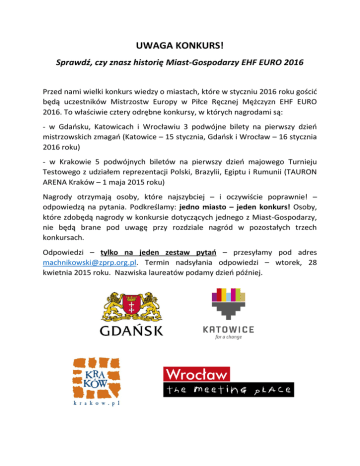 UWAGA KONKURS! Sprawdź, czy znasz historię Miast-Gospodarzy EHF EURO 2016 Przed nami wielki konkurs wiedzy o miastach, które w styczniu 2016 roku gościć będą uczestników Mistrzostw Europy w Piłce Ręcznej Mężczyzn EHF EURO 2016. To właściwie cztery odrębne konkursy, w których nagrodami są: - w Gdańsku, Katowicach i Wrocławiu 3 podwójne bilety na pierwszy dzień mistrzowskich zmagań (Katowice – 15 stycznia, Gdańsk i Wrocław – 16 stycznia 2016 roku) - w Krakowie 5 podwójnych biletów na pierwszy dzień majowego Turnieju Testowego z udziałem reprezentacji Polski, Brazylii, Egiptu i Rumunii (TAURON ARENA Kraków – 1 maja 2015 roku) Nagrody otrzymają osoby, które najszybciej – i oczywiście poprawnie! – odpowiedzą na pytania. Podkreślamy: jedno miasto – jeden konkurs! Osoby, które zdobędą nagrody w konkursie dotyczących jednego z Miast-Gospodarzy, nie będą brane pod uwagę przy rozdziale nagród w pozostałych trzech konkursach. Odpowiedzi – tylko na jeden zestaw pytań – przesyłamy pod adres [email protected]. Termin nadsyłania odpowiedzi – wtorek, 28 kwietnia 2015 roku. Nazwiska laureatów podamy dzień później. ZESTAW I 1. Niespełna dwa tygodnie temu zmarł najsłynniejszy z urodzonych w Gdańsku pisarzy, laureat Nagrody Nobla i Honorowy Obywatel Miasta Gdańska. Proszę podać jego imię i nazwisko. 2. Gdańszczanie są w większości optymistami, ale to właśnie z Gdańska pochodzi najwybitniejszy przedstawiciel pesymizmu w filozofii, którego imię jest identyczne jak imię wielokrotnego reprezentanta Polski w piłce ręcznej, autora chyba najsłynniejszego rzutu w historii polskiego szczypiorniaka. Jak nazywał się ten niemiecki filozof? 3. W XVII wieku, na redzie Gdańska, odbyła się jedna z najsłynniejszych bitew morskich w historii polskiej floty wojennej. Niedoświadczoną flotą polską dowodził admirał Arend Dickmann, który poprowadził dwie eskadry polskich okrętów do zwycięstwa nad bardziej doświadczoną eskadrą szwedzką. W tradycyjnej nazwie tej bitwy występuje nazwa jednej z gdańskich dzielnic. O którą dzielnicę chodzi? 4. Najcenniejszym obrazem znajdującym się w zbiorach Muzeum Narodowego w Gdańsku jest XV-wieczny tryptyk pewnego niderlandzkiego malarza, przedstawiający Sąd Ostateczny. Jak nazywa się autor tego tryptyku? 5. W poprzednim konkursie wiedzy o Gdańsku pytaliśmy o Spójnię Gdańsk, trzykrotnego mistrza Polski w piłce ręcznej mężczyzn. A ile tytułów mistrza kraju zdobył najbardziej utytułowany z gdańskich klubów, czyli GKS Wybrzeże? ZESTAW II 1. W latach 1953-1956 Katowice wcale nie były Katowicami. Jak nazywało się wtedy miasto? 2. W Katowicach urodził się jeden z najwybitniejszych himalaistów XX wieku, zdobywca Korony Himalajów i Karakorum (czyli wszystkich 14 szczytów o wysokości powyżej 8000 metrów), zmarły tragicznie w 1989 roku przy próbie wejścia na Lhotse drogą przez niezdobytą wcześniej południową ścianę góry. Proszę podać jego imię i nazwisko. 3. W wielkiej gali na otwarcie Hali Spodek – przez lata największego i najnowocześniejszego obiektu sportowo-widowiskowego w Polsce – wystąpili: Anna German, Ewa Decówna i Zespół Pieśni i Tańca „Śląsk”. W którym roku odbyła się ta gala? 4. W historii turniejów o mistrzostwo świata w piłce nożnej tylko jednemu zawodnikowi udało się strzelić cztery gole w jednym meczu przeciwko reprezentacji Brazylii. Dokonał tego w 1938 roku piłkarz urodzony w Katowicach. Jak się nazywał? 5. Pierwszego po II wojnie światowej mistrza Polski mężczyzn w piłce ręcznej siedmioosobowej wyłoniono dopiero w 1955 roku i został nim klub z Katowic, który zresztą w następnych latach powtarzał ten sukces czterokrotnie. Jak nazywał się ten klub? ZESTAW III 1. W Muzeum Czartoryskich w Krakowie znajduje się jedyne w Polsce dzieło największego geniusza renesansu, Leonarda da Vinci. Co przedstawia ten obraz? 2. Wahadło Foucaulta to wahadło, które może poruszać się w dowolnej płaszczyźnie pionowej. Powolna zmiana płaszczyzny ruchu tego wahadła względem Ziemi jest dowodem na to, że nasza planeta obraca się wokół własnej osi. Najdłuższe w Polsce wahadło Foucaulta mierzy sobie aż 46,5 m i znajduje się w jednym z krakowskich kościołów. W którym? 3. W 1916 znakomity matematyk, prof. Hugo Steinhaus, podczas spaceru po krakowskich Plantach, podsłuchał rozmowę dwóch młodych ludzi z zapałem dyskutujących o wyższej matematyce. Jednego z nich zaprosił na spotkanie, które stało się początkiem jednej z najbardziej oszałamiających karier naukowych w dziejach polskiej matematyki. Cztery lata później ów młody człowiek – nie mając ukończonych studiów! – uzyskał stopień doktora, a dwa lata później był już profesorem nadzwyczajnym na lwowskim Uniwersytecie Jana Kazimierza. Jak nazywał się ten geniusz matematyki? 4. Pierwszego mistrza Polski w piłce ręcznej 11-osobowej wyłoniono w 1930 roku i został nim klub z Krakowa. Który? 5. Przełom lat 70. i 80. XX wieku to wspaniałe lata krakowskiej piłki ręcznej – Hutnik Kraków trzy razy z rzędu (1979-81) zdobył wtedy mistrzostwo Polski mężczyzn. W tamtej wspaniałej drużynie, na pozycji środkowego rozgrywającego, występował jeden z najlepszych zawodników w historii polskiej piłki ręcznej, brązowy medalista olimpijski z Montrealu (1976). Jak się nazywał? ZESTAW IV 1. We Wrocławiu podziwiać można słynną Panoramę Racławicką, monumentalne dzieło namalowane przez grupę malarzy pod kierunkiem Wojciecha Kossaka i Jana Styki. Do namalowania obrazu użyto płótna o szerokości (a właściwie wysokości) 15 m i długości równej potrojonej długości boiska do piłki ręcznej. Jaka była długość tego płótna? 2. Rodowity wrocławianin, popularny pisarz Marek Krajewski, jest autorem cyklu pasjonujących kryminałów, których akcja toczy się we Wrocławiu w pierwszej połow