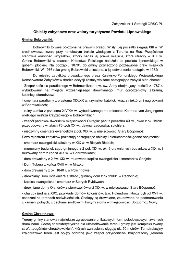 Załącznik nr 1 Strategii ORSG PL Obiekty zabytkowe oraz walory turystyczne Powiatu Lipnowskiego Gmina Bobrowniki: Bobrowniki to wieś położona na prawym brzegu Wisły. Jej początki sięgają XIII w. W średniowieczu leżała przy handlowym trakcie wiodącym z Torunia na Ruś. Przejściowo stanowiła własność Krzyżaków, którzy nadali jej prawa miejskie, które utraciły w XIX w. Gmina Bobrowniki w czasach Królestwa Polskiego należała do powiatu lipnowskiego w guberni płockiej. Na początku 1870r. do gminy przyłączono pozbawione praw miejskich Bobrowniki. W 1976 roku gminę Bobrowniki zniesiono, a jej odtworzenie nastąpiło w 1982r. Do rejestru zabytków prowadzonego przez Kujawsko-Pomorskiego Wojewódzkiego Konserwatora Zabytków w drodze decyzji zostały wpisane następujące zabytki nieruchome: - Zespół kościoła parafialnego w Bobrownikach p.w. św. Anny obejmujący: kościół z 1787 r. wybudowany na miejscu wcześniejszego drewnianego, mur ogrodzeniowy z bramą, kostnicę, starodrzew; - cmentarz parafialny z przełomu XIX/XX w. rzymsko- katolicki wraz z niektórymi nagrobkami w Bobrownikach; - ruiny zamku z przełomu XIV/XV w. wybudowanego na polecenie Konrada von Jungingena wielkiego mistrza krzyżackiego w Bobrownikach, - zespół parkowo- dworski w miejscowości Okrągła: park z początku XX w., dwór z ok. 1920r. przebudowany w latach 70-tych XX w., dawna rządcówka, spichlerz; - nieczynny cmentarz ewangelicki z poł. XIX w. w miejscowości Stary Bógpomóż; Poza rejestrem zabytków pozostają następujące obiekty i nieruchomości godne obejrzenia: - cmentarz ewangelicki założony w XIX w. w Białych Błotach; - murowany budynek sądu gminnego z 2 poł. XIX w. ok. 6 drewnianych budynków z XIX w. i murowany dom z końca XIX w. w Bobrownikach; - dom drewniany z 2 ćw. XIX w, murowana kaplica ewangelicka i cmentarz w Gnojnie; - Dom Tubera z końca XVIII w. w Miszku; - dom drewniany z ok. 1840 r. w Polichnowie; - drewniany Dom Uciekiniera z 1865r., gliniany dom z ok.1900r. w Rachcinie; - kaplica ewangelicka i cmentarz w Starych Rybitwach; - drewniane domy Olendrów z pierwszej ćwierci XIX w. w miejscowości Stary Bógpomóż; - chałupy (jedna z XIX), przykłady domów kolonistów, tzw. Holendrów, którzy byli od XVII w. osadzani na terenach nadwiślańskich. Chałupy są drewniane, zbudowane na podmurowaniu z kamieni polnych, z dachami siodłowymi krytymi słomą w miejscowości Bógpomóż Nowy; Gmina Chrostkowo: Tereny gminy stanowią największe zgrupowanie unikatowych form polodowcowych zwanych drumlinami. Cechą charakterystyczną dla ukształtowania terenu gminy jest kompleks zwany strefa „pagórków chrostkowskich”, których wzniesienia sięgają ok. 50 metrów. Ten atrakcyjny krajobrazowo teren jest objęty ochroną jako zespół przyrodniczo- krajobrazowy „Morena Chrostkowska”. Przez gminę Chrostkowo przepływa rzeka Ruziec. Jest to lewobrzeżny dopływ Drwęcy. Bierze początek w jeziorze Kopiec w miejscowości Żałe i ma 43 km długości. W średniowieczu rzeka była graniczną dla kasztelani Kikolskiej i Dobrzyńskiej. Przez teren gminy przechodzi tzw. „Trakt napoleoński” łączący Chrostkowo z ziemią płocką. W roku 1865 na terenie gminy toczyły się walki powstańcze z siłami carskimi. Największa z nich odbyła się w Nietrzebie, gdzie obecnie znajduje się pomnik upamiętniający te wydarzenia oraz śmierć 12 młodych powstańców. Lata okupacji hitlerowskiej i martyrologii upamiętniają zbiorowe mogiły na cmentarzu parafialnym w Chrostkowie. Do rejestru zabytków prowadzonego przez Kujawsko-Pomorskiego Wojewódzkiego Konserwatora Zabytków w drodze decyzji zostały wpisane następujące zabytki nieruchome: - Kościół parafialny drewniany p.w. św. Barbary z ok. 1654 r. w Chrostkowie. Obecnie znajdują się w nim polichromie wykonane przez znanego artystę Mikołaja Konczalskiego, który pochodzi z ziemi chrostkowskiej; - Młyn wodny z 1850 r. w Nietrzebie; Poza rejestrem zabytków pozostają następujące obiekty i nieruchomości godne obejrzenia: - spichlerz podworski murowany z II poł. XIX w. w Nowej Wsi; - spichlerz murowany z 1900r. w Głęboczku; - kaplica murowana z I poł. XIX i wiatrak paltrak z 1885 r. w Janiszewie; - murowana plebania z 1920-25r. w Chrostkowie; - cmentarz rzymskokatolicki z I poł. XIX w. w Chrostkowie. Gmina Dobrzyń n. Wisłą Początki Dobrzynia jako grodu sięgają XI w., została tam założona kasztelnia. W 1228r. Konrad Mazowiecki osadził w Dobrzyniu zakon rycerski Braci Dobrzyńców mających stanowić obronę przed Prusami. W XVI i XVII w. miasto przeżywa rozkwit, który kończy zniszczenie w czasie potopu szwedzkiego w 1656 i 1659r. Miasto nie odzyskało już swojej świetności i w XVIII i XIX w. następował jego dalszy upadek. Miasto posiadało aż osiem kościołów, z których przetrwał tylko kościół pofranciszkański. Do rejestru zabytków prowadzonego przez Kujawsko-Pomorskiego Wojewódzkiego Konserwatora Zabytków w drodze decyzji zostały wpisane następujące zabytki nieruchome: - zespół dworski z drugiej połowy XIX w. obejmujący drewniany dwór z lat 1866-1868 i park w Bachorzewie; - Zespół dworski w Chalinie z pierwszej połowy XIX w.: dwór, park, kuźnia, wozownia i rządcówka wraz z terenem w granicach wyznaczonych w dokumentacji parkowej; - Kościół klasztorny o.o. Franciszkanów pochodzący z XV w., wielokrotnie przebudowywany, obecnie kościół parafialny p.w. Wniebowzięcia NMP w Dobrzyniu n.W - cmentarz parafialny rzymsko-katolicki w Dobrzyniu n. W z pierwszej połowy XIX w.; - zespół dworski z pierwszej połowy XIX w. w Dyblinie obejmujący dwór, park, spichlerz i czworaki; - drewniany kościół parafialny p.w. Podwyższenia Krzyża Św. W Grochowalsku; - zespół dworski z końca XIX w. w Grochowalsku obejmujący dwór, park i gorzelnię; - park dworski z drugiej połowy XVIII w. w Kamienicy; - zespół dworski w Krojczynie obejmując
