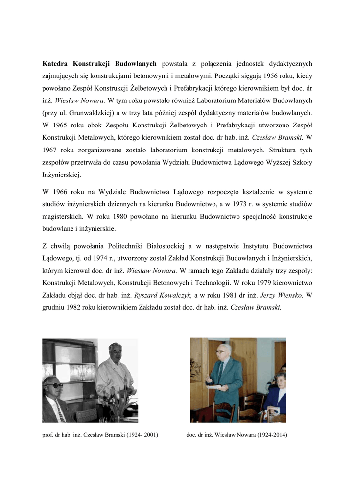 Katedra Konstrukcji Budowlanych powstała z połączenia jednostek dydaktycznych zajmujących się konstrukcjami betonowymi i metalowymi. Początki sięgają 1956 roku, kiedy powołano Zespół Konstrukcji Żelbetowych i Prefabrykacji którego kierownikiem był doc. dr inż. Wiesław Nowara. W tym roku powstało również Laboratorium Materiałów Budowlanych (przy ul. Grunwaldzkiej) a w trzy lata później zespół dydaktyczny materiałów budowlanych. W 1965 roku obok Zespołu Konstrukcji Żelbetowych i Prefabrykacji utworzono Zespół Konstrukcji Metalowych, którego kierownikiem został doc. dr hab. inż. Czesław Bramski. W 1967 roku zorganizowane zostało laboratorium konstrukcji metalowych. Struktura tych zespołów przetrwała do czasu powołania Wydziału Budownictwa Lądowego Wyższej Szkoły Inżynierskiej. W 1966 roku na Wydziale Budownictwa Lądowego rozpoczęto kształcenie w systemie studiów inżynierskich dziennych na kierunku Budownictwo, a w 1973 r. w systemie studiów magisterskich. W roku 1980 powołano na kierunku Budownictwo specjalność konstrukcje budowlane i inżynierskie. Z chwilą powołania Politechniki Białostockiej a w następstwie Instytutu Budownictwa Lądowego, tj. od 1974 r., utworzony został Zakład Konstrukcji Budowlanych i Inżynierskich, którym kierował doc. dr inż. Wiesław Nowara. W ramach tego Zakładu działały trzy zespoły: Konstrukcji Metalowych, Konstrukcji Betonowych i Technologii. W roku 1979 kierownictwo Zakładu objął doc. dr hab. inż. Ryszard Kowalczyk, a w roku 1981 dr inż. Jerzy Wiensko. W grudniu 1982 roku kierownikiem Zakładu został doc. dr hab. inż. Czesław Bramski. prof. dr hab. inż. Czesław Bramski (1924- 2001) doc. dr inż. Wiesław Nowara (1924-2014) Interesujące mogą być tytuły pierwszych prac doktorskich: -Wiesław Nowara: Studium wpływu wilgotności na wytrzymałość betonów (pierwszy doktorat w Wieczorowej Szkole Inżynierskiej na Wydziale Budownictwa), -Wanda Nazarko: Nośność graniczna niektórych typów belek hybrydowych, -Czesław Miedziałowski, Stanisław W. Piotrowski: Zagęszczanie pewnych mieszanek betonowych przez wibrosztychowanie i wibroubijanie z zastosowaniem pulsatora pneumatyczno-hydraulicznego, -Mikołaj Syczewski: Zakotwienie prętów stalowych w elemencie betonowym w złożonym stanie naprężeń, -Jerzy Wiensko: Pneumatyczne wibrowanie betonu. Oraz pierwsza obroniona praca habilitacyjna: Czesław Bramski: Obrotowo-symetryczne zbiorniki kroplokształtne. Kadra dydaktyczna tego okresu to: dr inż. Mikołaj Syczewski, dr inż. Wiesław Nowara, dr inż. Andrzej Łapko, dr inż. Wanda Nazarko, dr inż. Michał Bołtryk, dr inż. Czesław Miedziałowski, dr inż. Stanisław Tkaczyk, mgr inż. Borzuchowski, mgr inż. Andrzej Tanajewski, mgr inż. Piotr Szulga, mgr inż. Danuta Tomaszewska, dr inż. Stanisław Piotrowski (zmarł wkrótce po uzyskaniu doktoratu), Kazimierz Zubrycki, Igor Grycuk, Remigiusz Wiktorski. Najdłużej pracujący pracownicy techniczni to: inż. Jerzy Sobolewski, inż. Stefan Danecki, inż. Czesław Kietliński, inż. Jan Kapturek, inż. Leontyna Siwik, Wiaczesław Puczyński, Teodor Sokołowski, Mieczysław Michalczuk, Aleksander Sarajew, Leonidas Koniuch, Zygmunt Konopacki, później mgr inż. Wojciech Konopacki, mgr inż. Mirosław Tołkacz, sekretariat - Anna Żarnowska. Zebranie Zakładu Konstrukcji Metalowych (1995 r.),od lewej: dr inż. Agnieszka Jabłońska-Krysiewicz, dr inż. Ireneusz Ligocki, prof. dr inż. Jan Bródka, prof. dr hab. inż. Czesław Bramski Od lewej: mgr inż. Mirosław Tołkacz, Wiaczesław Puczyński, dr inż. Mariusz Gnatowski, prof. dr hab. inż. Andrzej Łapko Na początku lat 80-tych pracowaliśmy na II piętrze budynku przy Sosnowej, w piwnicy budynku głównego i przybudówkach było laboratorium, którego wiodącym tematem badawczym były zagadnienia związane z wiórobetonem. Jesienią roku 1981 zaczynają się strajki studenckie, popierane przez część nauczycieli. To trudny czas - wydaje się, że wszyscy chcą dobrze – widzą tylko różne drogi. Po ogłoszeniu stanu wojennego trzeba pilnować budynku na Sosnowej, co prawda nie wiadomo przed kim. Dyżury były nawet całodobowe. W katedrze zatrudnia się mgr inż. Aleksander Wawrusiewicz, rok później zasila ją też dr inż. Jerzy Szlendak. Katedra zostaje przeniesiona i ulokowana na parterze budynku przy ul. Krakowskiej, przy czym laboratorium w pomieszczeniach piwnicznych. W 1985 roku z Białostockiego Przedsiębiorstwa Budownictwa Przemysłowego przechodzi do Katedry mgr inż. Ireneusz Ligocki oraz zatrudnieni zostają: mgr inż. Waldemar Cwalina i mgr inż. Jarosław Bujnowski. Dr inż. Jerzy Szlendak przenosi z COBPKM „Mostostal” Warszawa ideę badań połączeń węzłów konstrukcji stalowych z rur prostokątnych oraz inicjuje budowę stendu badawczego umożliwiającego ich realizację. pomieszczeniach piwnicznych Stend wykonany zostaje w budynku przez zespół: dr inż. Jerzy Szlendak, mgr inż. Ireneusz Ligocki oraz inż. Czesław Kietliński wraz z Pracownikami Laboratorium. Habilitacje uzyskują Czesław Bramski i Michał Bołtryk. Pierwszy przejmuje kierownictwo katedry, drugi tworzy nową katedrę o bardziej technologicznym profilu. Czesław Miedziałowski przenosi się do Katedry Mechaniki Budowli. Kadra profesorska katedry zostaje zasilona przez prof. Mieczysława Rybaka – wieloletniego dyrektora Instytutu Badawczego Dróg i Mostów w Warszawie, współpracę z katedrą kontynuują takie znakomite autorytety jak prof. Wiesław Stachurski – filar polskiego żelbetu i prof. Ryszard Kowalczyk – światowy autorytet w dziedzinie budynków wysokich. W laboratorium Katedry na nowo wybudowanym stendzie prowadzone są badania węzłów podatnych (mgr. inż. I. Ligocki, mgr inż. Jarosław Bujnowski, dr inż. Jerzy Szlendak – kierownik tematu) oraz belek z otworami (mgr inż. Waldemar Cwalina, dr inż. Wanda Nazarko). W dwu przypadkach kończą one si
