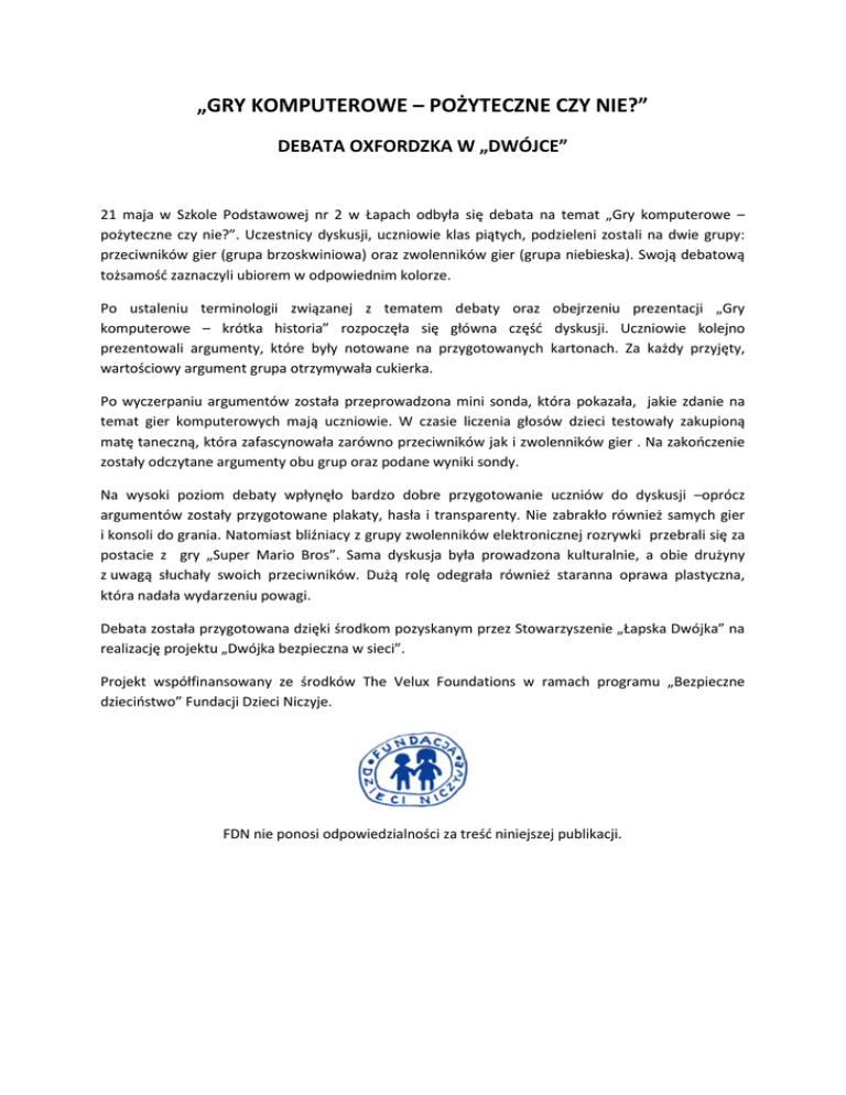 „GRY KOMPUTEROWE – POŻYTECZNE CZY NIE?” DEBATA OXFORDZKA W „DWÓJCE” 21 maja w Szkole Podstawowej nr 2 w Łapach odbyła się debata na temat „Gry komputerowe – pożyteczne czy nie?”. Uczestnicy dyskusji, uczniowie klas piątych, podzieleni zostali na dwie grupy: przeciwników gier (grupa brzoskwiniowa) oraz zwolenników gier (grupa niebieska). Swoją debatową tożsamość zaznaczyli ubiorem w odpowiednim kolorze. Po ustaleniu terminologii związanej z tematem debaty oraz obejrzeniu prezentacji „Gry komputerowe – krótka historia” rozpoczęła się główna część dyskusji. Uczniowie kolejno prezentowali argumenty, które były notowane na przygotowanych kartonach. Za każdy przyjęty, wartościowy argument grupa otrzymywała cukierka. Po wyczerpaniu argumentów została przeprowadzona mini sonda, która pokazała, jakie zdanie na temat gier komputerowych mają uczniowie. W czasie liczenia głosów dzieci testowały zakupioną matę taneczną, która zafascynowała zarówno przeciwników jak i zwolenników gier . Na zakończenie zostały odczytane argumenty obu grup oraz podane wyniki sondy. Na wysoki poziom debaty wpłynęło bardzo dobre przygotowanie uczniów do dyskusji –oprócz argumentów zostały przygotowane plakaty, hasła i transparenty. Nie zabrakło również samych gier i konsoli do grania. Natomiast bliźniacy z grupy zwolenników elektronicznej rozrywki przebrali się za postacie z gry „Super Mario Bros”. Sama dyskusja była prowadzona kulturalnie, a obie drużyny z uwagą słuchały swoich przeciwników. Dużą rolę odegrała również staranna oprawa plastyczna, która nadała wydarzeniu powagi. Debata została przygotowana dzięki środkom pozyskanym przez Stowarzyszenie „Łapska Dwójka” na realizację projektu „Dwójka bezpieczna w sieci”. Projekt współfinansowany ze środków The Velux Foundations w ramach programu „Bezpieczne dzieciństwo” Fundacji Dzieci Niczyje. FDN nie ponosi odpowiedzialności za treść niniejszej publikacji.