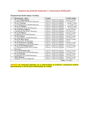 Proponowane praktyki studenckie w restauracjach McDonald’s Proponowana liczba miejsc i terminy Lp Restauracja - adres Termin Liczba miejsc 1 W-wa 12 Radzymińska ul. Radzymińska 249, 03-643 Warszawa W-wa 1 Centrum ul. Świętokrzyska 35. 00-049 Warszawa W-wa 17 Wilanów ul. Wiertnicza 35, 02-952 Warszawa W-wa 20 Stara Miłosna Trakt Brzeski 99a, 05-077 Warszawa W-wa 22 Pułkowa ul. Pułkowa 60, 01-969 Warszawa W-Wa 25 Bazar ul. Łopuszańska 2, 02-200 Warszawa W-wa 41 Złote Tarasy ul. Złota 59, 00-120 Warszawa W-wa 46 Dworzec Centralny al. Jerozolimskie 54, 00-495 Warszawa W-wa 47 Wał Miedzeszyński ul. Wał Miedzeszyński 249 A, 04-866 Warszawa W-wa 49 Świętokrzyska ul. Świętokrzyska 3, 00-360 Warszawa W-wa 51 Radość ul. Patriotów 197, 04-858 Warszawa MOP Małopole Małopole 1A, 05-252 Dąbrówka 18.07.16 -14.08.16 (5 tygodni) 22.08.16 - 25.09.16 (5 tygodni) 18.07.16 -14.08.16 (5 tygodni) 22.08.16 - 25.09.16 (5 tygodni) 18.07.16 -14.08.16 (5 tygodni) 22.08.16 - 25.09.16 (5 tygodni) 18.07.16 -14.08.16 (5 tygodni) 22.08.16 - 25.09.16 (5 tygodni) 18.07.16 -14.08.16 (5 tygodni) 22.08.16 - 25.09.16 (5 tygodni) 18.07.16 -14.08.16 (5 tygodni) 22.08.16 - 25.09.16 (5 tygodni) 18.07.16 -14.08.16 (5 tygodni) 22.08.16 - 25.09.16 (5 tygodni) 18.07.16 -14.08.16 (5 tygodni) 22.08.16 - 25.09.16 (5 tygodni) 18.07.16 -14.08.16 (5 tygodni) 22.08.16 - 25.09.16 (5 tygodni) łącznie 3 osoby (1+2 lub 2+1) łącznie 3 osoby (1+2 lub 2+1) łącznie 3 osoby (1+2 lub 2+1) łącznie 3 osoby (1+2 lub 2+1) łącznie 3 osoby (1+2 lub 2+1) łącznie 3 osoby (1+2 lub 2+1) łącznie 3 osoby (2+2) łącznie 3 osoby (1+2 lub 2+1) łącznie 3 osoby (1+2 lub 2+1) 18.07.16 -14.08.16 (5 tygodni) 22.08.16 - 25.09.16 (5 tygodni) 18.07.16 -14.08.16 (5 tygodni) 22.08.16 - 25.09.16 (5 tygodni) 18.07.16 -14.08.16 (5 tygodni) 22.08.16 - 25.09.16 (5 tygodni) Suma łącznie 3 osoby (1+2 lub 2+1) łącznie 3 osoby (1+2 lub 2+1) łącznie 3 osoby (1+2 lub 2+1) 36 miejsc 2 3 4 5 6 7 8 9 10 11 12 UWAGA: do restauracji zgłaszamy się ze skierowaniem na praktykę i programem praktyk potwierdzonym w SGGW przez Pełnomocnika ds. Praktyk