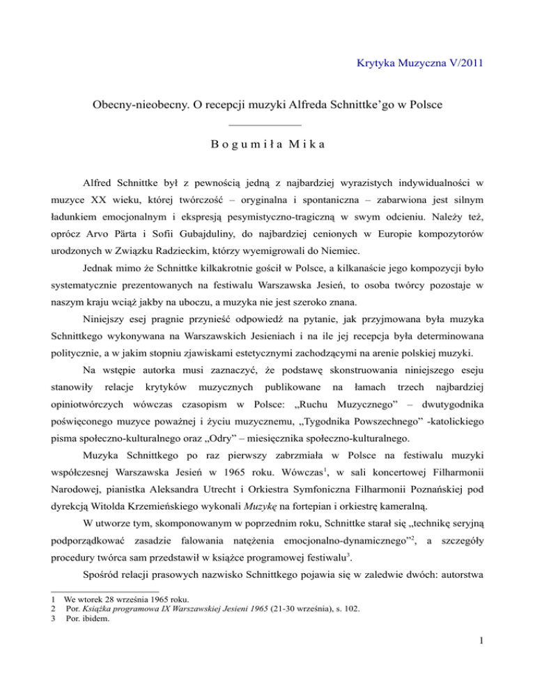 Krytyka Muzyczna V/2011 Obecny-nieobecny. O recepcji muzyki Alfreda Schnittke’go w Polsce Bogumiła Mika Alfred Schnittke był z pewnością jedną z najbardziej wyrazistych indywidualności w muzyce XX wieku, której twórczość – oryginalna i spontaniczna – zabarwiona jest silnym ładunkiem emocjonalnym i ekspresją pesymistyczno-tragiczną w swym odcieniu. Należy też, oprócz Arvo Pärta i Sofii Gubajduliny, do najbardziej cenionych w Europie kompozytorów urodzonych w Związku Radzieckim, którzy wyemigrowali do Niemiec. Jednak mimo że Schnittke kilkakrotnie gościł w Polsce, a kilkanaście jego kompozycji było systematycznie prezentowanych na festiwalu Warszawska Jesień, to osoba twórcy pozostaje w naszym kraju wciąż jakby na uboczu, a muzyka nie jest szeroko znana. Niniejszy esej pragnie przynieść odpowiedź na pytanie, jak przyjmowana była muzyka Schnittkego wykonywana na Warszawskich Jesieniach i na ile jej recepcja była determinowana politycznie, a w jakim stopniu zjawiskami estetycznymi zachodzącymi na arenie polskiej muzyki. Na wstępie autorka musi zaznaczyć, że podstawę skonstruowania niniejszego eseju stanowiły relacje krytyków muzycznych publikowane na łamach trzech najbardziej opiniotwórczych wówczas czasopism w Polsce: „Ruchu Muzycznego” – dwutygodnika poświęconego muzyce poważnej i życiu muzycznemu, „Tygodnika Powszechnego” -katolickiego pisma społeczno-kulturalnego oraz „Odry” – miesięcznika społeczno-kulturalnego. Muzyka Schnittkego po raz pierwszy zabrzmiała w Polsce na festiwalu muzyki współczesnej Warszawska Jesień w 1965 roku. Wówczas 1, w sali koncertowej Filharmonii Narodowej, pianistka Aleksandra Utrecht i Orkiestra Symfoniczna Filharmonii Poznańskiej pod dyrekcją Witolda Krzemieńskiego wykonali Muzykę na fortepian i orkiestrę kameralną. W utworze tym, skomponowanym w poprzednim roku, Schnittke starał się „technikę seryjną podporządkować zasadzie falowania natężenia emocjonalno-dynamicznego”2, a szczegóły procedury twórca sam przedstawił w książce programowej festiwalu3. Spośród relacji prasowych nazwisko Schnittkego pojawia się w zaledwie dwóch: autorstwa 1 We wtorek 28 września 1965 roku. 2 Por. Książka programowa IX Warszawskiej Jesieni 1965 (21-30 września), s. 102. 3 Por. ibidem. 1 Krytyka Muzyczna V/2011 Zygmunta Mycielskiego i Stefana Kisielewskiego. Mycielski w liście Do przyjaciół4 opublikowanym na łamach „Ruchu Muzycznego”, komentując IX Międzynarodowy Festiwal Muzyki Współczesnej „Warszawska Jesień”, a zwłaszcza krytycznie odnosząc się do ówczesnej awangardy, jedynie wymienia wykonanie Muzyki na fortepian Schnittkego, umieszczając je w niepochlebnym kontekście zdania: „Jest jasne, że nie można już dziś powielać na nowo tradycyjnego języka (…)”5. Kisielewski, wręcz przeciwnie, również przy okazji dywagacji na temat awangardy prezentowanej podczas Warszawskiej Jesieni na łamach „Tygodnika Powszechnego” o utworze Schnittkego pisze entuzjastycznie: „Niejednokrotnie pisałem o festiwalu, że to jest arka przymierza, spotkanie Wschód-Zachód i tak dalej. I oto słowo stało się ciałem: Rosjanie, Czesi, Rumuni obok klasyki jak Prokofiew czy Szostakowicz przywieźli tym razem na Festiwal swoją awangardę. (…). Rewelacją stała się (…) Muzyka na fortepian i orkiestrę kameralną Alfreda Schnittke (Moskwa). Utwór utrzymany w technice dodekafonicznej nawiązuje jednocześnie do tradycji romantycznoekspresjonistycznych, do Skrabina i Schönberga, daje syntezę wymagań nowej techniki z działającym asocjacyjnie emocjonalizmem i znajomą pełnią brzmienia oraz ze znakomitą wirtuozerią fortepianową. Prawdziwy to utwór-pomost, utwór synteza, utwór-spotkanie”6. Te dwie ambiwalentne wypowiedzi, płynące z ust najbardziej wpływowych ówczesnych polskich krytyków muzyki, dają się zrozumieć jedynie w świetle szerszej znajomości ich estetycznych preferencji. Kisielewski był miłośnikiem radzieckiej awangardy, a Schnittkego cenił, co kilkakrotnie potwierdzają zapiski w jego Dziennikach7. Mycielski, przeciwnie, nie podzielał zachwytu dla Schnittkego, jego muzykę oceniał jako wtórną, mało inspirującą. W swym Dzienniku 1960-1969, wspominając własną wizytę w Moskwie w 1964 roku, Mycielski dzieli się refleksjami na temat wysłuchanej przez radio muzyki Schnittkego – oratorium Nagasaki na chór i orkiestrę, bynajmniej nie kryjąc swego znużenia utworem: „(…) pisze pod Szostakowicza. Podobne linie melodyjne, nawet wyraziste. Wolałbym już coś gorszego niż taką wtórność, niż ten twórczy bezruch”8. Zapytany o muzykę Schnittkego podczas tej samej wizyty w 1964 w ZSRR Mycielski miał odpowiedzieć: „(…) jak na 28 lat za mało dla mnie 4 5 Por. Zygmunt Mycielski, Do przyjaciół, „Ruch Muzyczny” nr 21, 1-16 listopada 1965, s. 12-13. Ibidem, s. 13. Dodajmy, że w innej relacji zamieszczonej na łamach „Ruchu Muzycznego” nazwisko Schnittkego nie pada w ogóle. Por. Jan Weber „Ewenementy” IX Międzynarodowego Festiwalu Muzyki Współczesnej „Warszawska Jesień”, „Ruch Muzyczny” 15-30 listopada 1965, nr 22, s. 20-21 6 Stefan Kisielewski, O jesieni najrozmaiciej, „Tygodnik Powszechny” 1965, 17 października 1965, nr 42, rok XIX, s. 4. 7 S. Kisielewski, Dzienniki, Warszawa 1996, Wydawnictwo „Iskry”. 8 Z. Mycielski, Dziennik 1960-1969, Warszawa 2001, Wydawnictwo „Iskry”, s. 290. 2 Krytyka Muzyczna V/2011 osobiste (…), zbyt szkolne, choć zdolny i z pewnością muzyk”9. I wydaje się, że Mycielski nigdy nie zmienił swego stanowiska w stosunku do muzyki Schnittkego, w jego relacjach z Warszawskich Jesieni bowiem osoba rosyjskiego twórcy będzie systematycznie pomijana. Rok 1967, w którym przypadła kolejna warszawskojesienna prezentacja muzyki Schnittkego, upłynął w Polsce – kraju należącym do Bloku Wschodniego – pod hasłem świętowania 50. r