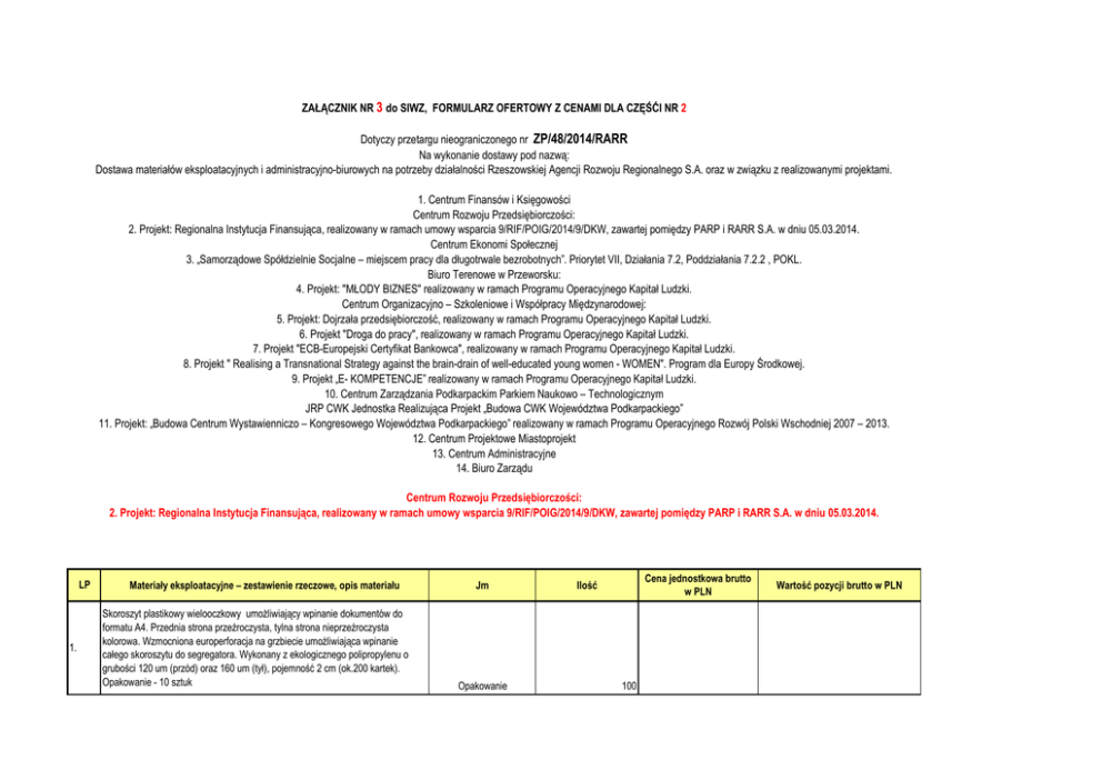 ZAŁĄCZNIK NR 3 do SIWZ, FORMULARZ OFERTOWY Z CENAMI DLA CZĘŚĆI NR 2 Dotyczy przetargu nieograniczonego nr ZP/48/2014/RARR Na wykonanie dostawy pod nazwą: Dostawa materiałów eksploatacyjnych i administracyjno-biurowych na potrzeby działalności Rzeszowskiej Agencji Rozwoju Regionalnego S.A. oraz w związku z realizowanymi projektami. 1. Centrum Finansów i Księgowości Centrum Rozwoju Przedsiębiorczości: 2. Projekt: Regionalna Instytucja Finansująca, realizowany w ramach umowy wsparcia 9/RIF/POIG/2014/9/DKW, zawartej pomiędzy PARP i RARR S.A. w dniu 05.03.2014. Centrum Ekonomi Społecznej 3. „Samorządowe Spółdzielnie Socjalne – miejscem pracy dla długotrwale bezrobotnych”. Priorytet VII, Działania 7.2, Poddziałania 7.2.2 , POKL. Biuro Terenowe w Przeworsku: 4. Projekt: "MŁODY BIZNES" realizowany w ramach Programu Operacyjnego Kapitał Ludzki. Centrum Organizacyjno – Szkoleniowe i Współpracy Międzynarodowej: 5. Projekt: Dojrzała przedsiębiorczość, realizowany w ramach Programu Operacyjnego Kapitał Ludzki. 6. Projekt "Droga do pracy", realizowany w ramach Programu Operacyjnego Kapitał Ludzki. 7. Projekt "ECB-Europejski Certyfikat Bankowca", realizowany w ramach Programu Operacyjnego Kapitał Ludzki. 8. Projekt " Realising a Transnational Strategy against the brain-drain of well-educated young women - WOMEN". Program dla Europy Środkowej. 9. Projekt „E- KOMPETENCJE” realizowany w ramach Programu Operacyjnego Kapitał Ludzki. 10. Centrum Zarządzania Podkarpackim Parkiem Naukowo – Technologicznym JRP CWK Jednostka Realizująca Projekt „Budowa CWK Województwa Podkarpackiego” 11. Projekt: „Budowa Centrum Wystawienniczo – Kongresowego Województwa Podkarpackiego” realizowany w ramach Programu Operacyjnego Rozwój Polski Wschodniej 2007 – 2013. 12. Centrum Projektowe Miastoprojekt 13. Centrum Administracyjne 14. Biuro Zarządu Centrum Rozwoju Przedsiębiorczości: 2. Projekt: Regionalna Instytucja Finansująca, realizowany w ramach umowy wsparcia 9/RIF/POIG/2014/9/DKW, zawartej pomiędzy PARP i RARR S.A. w dniu 05.03.2014. LP 1. Materiały eksploatacyjne – zestawienie rzeczowe, opis materiału Skoroszyt plastikowy wielooczkowy umożliwiający wpinanie dokumentów do formatu A4. Przednia strona przeźroczysta, tylna strona nieprzeźroczysta kolorowa. Wzmocniona europerforacja na grzbiecie umożliwiająca wpinanie całego skoroszytu do segregatora. Wykonany z ekologicznego polipropylenu o grubości 120 um (przód) oraz 160 um (tył), pojemność 2 cm (ok.200 kartek). Opakowanie - 10 sztuk Jm Opakowanie Cena jednostkowa brutto w PLN Ilość 100 Wartość pozycji brutto w PLN 2. 3. 4. 5. 6. 7. 8. 9. 10. 11. 12. 13. 14. 15. 16. 17. 18. Papier biurowy typu POLlux 80. Format A 4. Gramatura 80 ±2 g/m2, Wilgotność 4,0 ±0,5 %, Grubość 108 ±3 μm, Białość CIE 161 ±2, Białość D65 109,5 ±2, Nieprzezroczystość 93 +2/-1, Gładkość (szorstkość wg Bendtsen) 180±50 cm3/min. Pakowany w ryzy Ofertówki transparentne A4 0,15mm, otwierane u góry i z prawej strony. Opakowanie 25 szt. w folii Lexmark bęben 0C930X73G C/M/Y kpl oryginał Lexmark maintenance kit 600K X945e Lexmark toner 0X945X2KG (black) Lexmark toner 0X945X2CG (cyan) Lexmark toner 0X945X2MG (magenta) Lexmark toner 0X945X2YG (yellow) Lexmark bęben 0C930X72G czarny oryginał Xerox toner 106R01410 (black) oryginał Lexmark bęben 0E260X22G (black) oryginał Lexmark toner 0E360H21E (black) 9k oryginał Canon toner FX-3 (Black) 2.7k zamiennik Toner czarny HP C4096A 6k zamiennik Toner czarny Samsung CLP-K660B 5.5k orginał Xerox bęben 113R00755 (black) orginał Toner Cyan OKI 42127407 5k orginał Ryza 200 Opakowanie sztuka sztuka sztuka sztuka sztuka sztuka sztuka sztuka sztuka sztuka sztuka sztuka sztuka sztuka sztuka 20 3 1 4 3 2 2 4 6 2 2 2 3 2 1 1 RAZEM Data ………………………………… Podpis/ podpisy Data …………………………… Sporządził ………………………………………… 0,00
