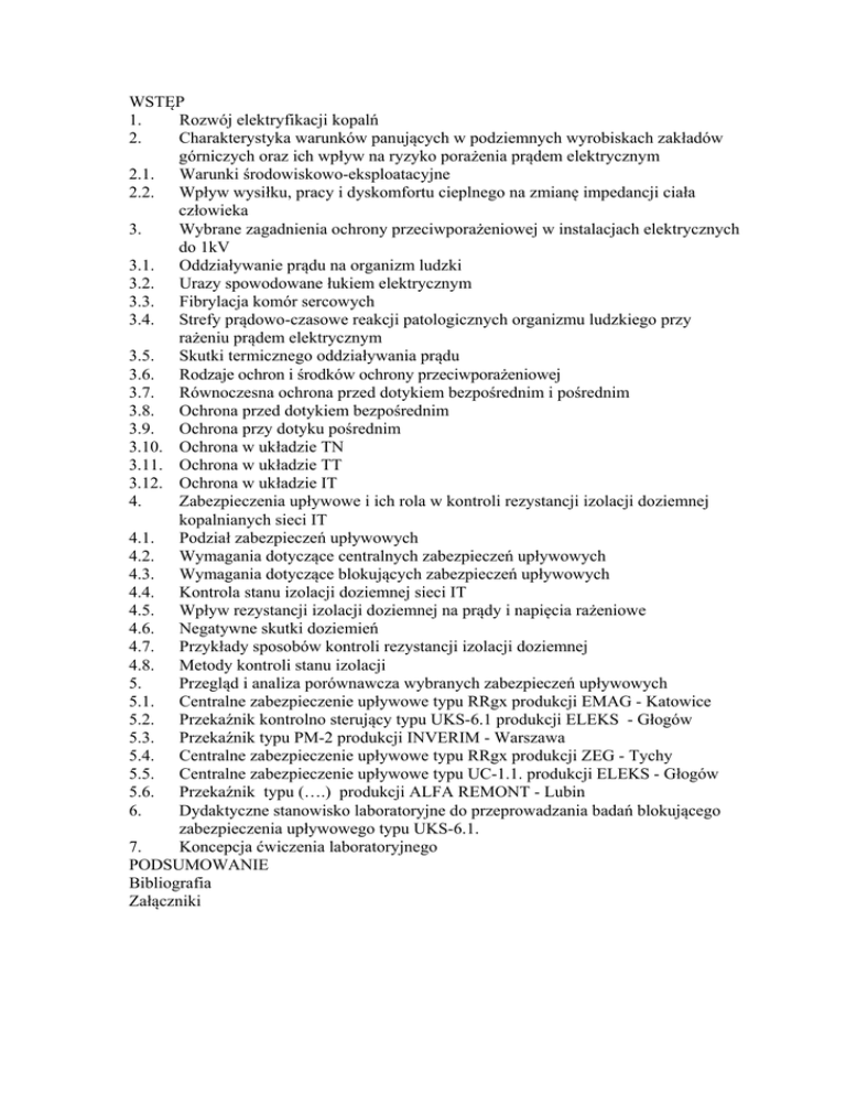 WSTĘP 1. Rozwój elektryfikacji kopalń 2. Charakterystyka warunków panujących w podziemnych wyrobiskach zakładów górniczych oraz ich wpływ na ryzyko porażenia prądem elektrycznym 2.1. Warunki środowiskowo-eksploatacyjne 2.2. Wpływ wysiłku, pracy i dyskomfortu cieplnego na zmianę impedancji ciała człowieka 3. Wybrane zagadnienia ochrony przeciwporażeniowej w instalacjach elektrycznych do 1kV 3.1. Oddziaływanie prądu na organizm ludzki 3.2. Urazy spowodowane łukiem elektrycznym 3.3. Fibrylacja komór sercowych 3.4. Strefy prądowo-czasowe reakcji patologicznych organizmu ludzkiego przy rażeniu prądem elektrycznym 3.5. Skutki termicznego oddziaływania prądu 3.6. Rodzaje ochron i środków ochrony przeciwporażeniowej 3.7. Równoczesna ochrona przed dotykiem bezpośrednim i pośrednim 3.8. Ochrona przed dotykiem bezpośrednim 3.9. Ochrona przy dotyku pośrednim 3.10. Ochrona w układzie TN 3.11. Ochrona w układzie TT 3.12. Ochrona w układzie IT 4. Zabezpieczenia upływowe i ich rola w kontroli rezystancji izolacji doziemnej kopalnianych sieci IT 4.1. Podział zabezpieczeń upływowych 4.2. Wymagania dotyczące centralnych zabezpieczeń upływowych 4.3. Wymagania dotyczące blokujących zabezpieczeń upływowych 4.4. Kontrola stanu izolacji doziemnej sieci IT 4.5. Wpływ rezystancji izolacji doziemnej na prądy i napięcia rażeniowe 4.6. Negatywne skutki doziemień 4.7. Przykłady sposobów kontroli rezystancji izolacji doziemnej 4.8. Metody kontroli stanu izolacji 5. Przegląd i analiza porównawcza wybranych zabezpieczeń upływowych 5.1. Centralne zabezpieczenie upływowe typu RRgx produkcji EMAG - Katowice 5.2. Przekaźnik kontrolno sterujący typu UKS-6.1 produkcji ELEKS - Głogów 5.3. Przekaźnik typu PM-2 produkcji INVERIM - Warszawa 5.4. Centralne zabezpieczenie upływowe typu RRgx produkcji ZEG - Tychy 5.5. Centralne zabezpieczenie upływowe typu UC-1.1. produkcji ELEKS - Głogów 5.6. Przekaźnik typu (….) produkcji ALFA REMONT - Lubin 6. Dydaktyczne stanowisko laboratoryjne do przeprowadzania badań blokującego zabezpieczenia upływowego typu UKS-6.1. 7. Koncepcja ćwiczenia laboratoryjnego PODSUMOWANIE Bibliografia Załączniki WSTĘP Celem niniejszej pracy jest dokonanie analizy, jak ważną rolę pełnią zabezpieczenia upływowe w kopalnianych sieciach IT oraz opracowanie i wykonanie dydaktycznego stanowiska laboratoryjnego do przeprowadzania badań wybranego blokującego zabezpieczenia upływowego. Oprócz części praktycznej praca zawiera część teoretyczną, która swoim zakresem obejmuje szereg zagadnień związanych z rolą i znaczeniem w przemyśle wydobywczym nowoczesnych zabezpieczeń upływowych, problematykę ochrony przeciwporażeniowej związanej z niesymetrycznymi zwarciami doziemnymi będącymi skutkami obniżonej rezystancji izolacji przewodów fazowych, stałego monitoringu stanu izolacji w sieciach kopalnianych, charakterystykę warunków środowiskowo-eksploatacyjnych występujących w podziemnych wyrobiskach zakładów górniczych i ich wpływ na stan rezystancji izolacji oraz zagrożenie porażeniem prądem elektrycznym a także przegląd i analizę porównawczą wybranych współczesnych zabezpieczeń upływowych. Praca podzielona jest na siedem rozdziałów stanowiących odrębne bloki tematyczne, których wspólnym mianownikiem jest ochrona przeciwporażeniowa w izolowanych sieciach IT poprzez kontrolę stanu izolacji realizowaną przez zabezpieczenia upływowe. Rozdział 1 - „Rozwój elektryfikacji kopalń” zawiera opis przemian w polskim górnictwie jakie następowały w ostatnim stuleciu, związanych z postępem technicznym i technologicznym, których konsekwencją jest trwający do czasów współczesnych intensywny proces elektryfikacji i automatyzacji, niosący ze sobą oprócz wymiernych korzyści także zagrożenia związane z porażeniem prądem elektrycznym. Rozdział 2 - „Charakterystyka warunków panujących w podziemnych wyrobiskach zakładów górniczych oraz ich wpływ na ryzyko porażenia prądem elektrycznym” przedstawia warunki środowiskowe panujące w podziemiach kopalń, a w szczególności podwyższoną temperaturę otoczenia, wilgotność powietrza, zjawisko rosienia, silną mineralizację wód kopalnianych, zawartość innych substancji mineralnych oraz płynów kopalnianych w atmosferze, obecność mikroorganizmów a także zagrożenia związane z tąpaniami, wyrzutami metanu i innych gazów oraz oberwaniami brył skalnych. W rozdziale 3 - „Wybrane zagadnienia ochrony przeciwporażeniowej w instalacjach elektrycznych do 1kV” obejmuje swoim zakresem szereg aspektów związanych z oddziaływaniem prądu elektrycznego na organizm ludzki, między innymi urazami 2 spowodowanymi łukiem elektrycznym, fibrylacją komór sercowych oraz skutkami termicznego oddziaływania prądu. W rozdziale sklasyfikowane są rodzaje ochron i środków ochrony przeciwporażeniowej, ochrona przed dotykiem bezpośrednim i pośrednim zarówno w sieciach z uziemionym punktem neutralnym transformatora oraz w układach sieci izolowanych. W rozdziale 4 - „Zabezpieczenia upływowe i ich rola w kontroli rezystancji izolacji doziemnej kopalnianych upływowych, wymagania sieci IT” dotyczące przedstawiony centralnych i jest podział zabezpieczeń blokujących zabezpieczeń upływowych, zagadnienia związane z kontrolą stanu izolacji doziemnej sieci IT oraz wpływem rezystancji izolacji doziemnej na prądy i napięcia rażeniowe i związane z tym negatywne skutki doziemień, wybrane przykłady sposobów kontroli rezystancji izolacji doziemnej a także metody kontroli stanu izolacji. W rozdziale 5 - „Przegląd i analiza porównawcza wybranych zabezpieczeń upływowych” zawarta jest charakterystyka techniczna kilku wybranych zabezpieczeń upływowych, z których każde posiada indywidualne cechy wyróżniające je spośród pozostałych. W rozdziale tym najwięcej miejsca poświęcono przekaźnikowi kontrolnosteruj