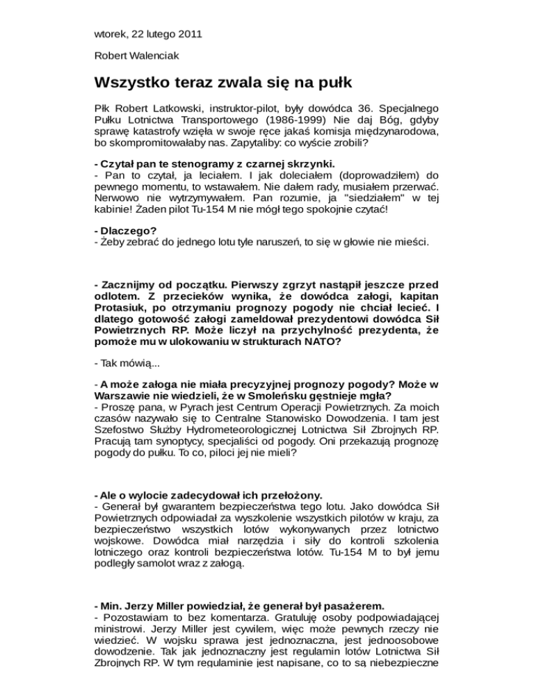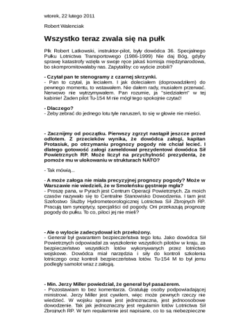 wtorek, 22 lutego 2011 Robert Walenciak Wszystko teraz zwala się na pułk Płk Robert Latkowski, instruktor-pilot, były dowódca 36. Specjalnego Pułku Lotnictwa Transportowego (1986-1999) Nie daj Bóg, gdyby sprawę katastrofy wzięła w swoje ręce jakaś komisja międzynarodowa, bo skompromitowałaby nas. Zapytaliby: co wyście zrobili? - Czytał pan te stenogramy z czarnej skrzynki. - Pan to czytał, ja leciałem. I jak doleciałem (doprowadziłem) do pewnego momentu, to wstawałem. Nie dałem rady, musiałem przerwać. Nerwowo nie wytrzymywałem. Pan rozumie, ja "siedziałem" w tej kabinie! Żaden pilot Tu-154 M nie mógł tego spokojnie czytać! - Dlaczego? - Żeby zebrać do jednego lotu tyle naruszeń, to się w głowie nie mieści. - Zacznijmy od początku. Pierwszy zgrzyt nastąpił jeszcze przed odlotem. Z przecieków wynika, że dowódca załogi, kapitan Protasiuk, po otrzymaniu prognozy pogody nie chciał lecieć. I dlatego gotowość załogi zameldował prezydentowi dowódca Sił Powietrznych RP. Może liczył na przychylność prezydenta, że pomoże mu w ulokowaniu w strukturach NATO? - Tak mówią... - A może załoga nie miała precyzyjnej prognozy pogody? Może w Warszawie nie wiedzieli, że w Smoleńsku gęstnieje mgła? - Proszę pana, w Pyrach jest Centrum Operacji Powietrznych. Za moich czasów nazywało się to Centralne Stanowisko Dowodzenia. I tam jest Szefostwo Służby Hydrometeorologicznej Lotnictwa Sił Zbrojnych RP. Pracują tam synoptycy, specjaliści od pogody. Oni przekazują prognozę pogody do pułku. To co, piloci jej nie mieli? - Ale o wylocie zadecydował ich przełożony. - Generał był gwarantem bezpieczeństwa tego lotu. Jako dowódca Sił Powietrznych odpowiadał za wyszkolenie wszystkich pilotów w kraju, za bezpieczeństwo wszystkich lotów wykonywanych przez lotnictwo wojskowe. Dowódca miał narzędzia i siły do kontroli szkolenia lotniczego oraz kontroli bezpieczeństwa lotów. Tu-154 M to był jemu podległy samolot wraz z załogą. - Min. Jerzy Miller powiedział, że generał był pasażerem. - Pozostawiam to bez komentarza. Gratuluję osoby podpowiadającej ministrowi. Jerzy Miller jest cywilem, więc może pewnych rzeczy nie wiedzieć. W wojsku sprawa jest jednoznaczna, jest jednoosobowe dowodzenie. Tak jak jednoznaczny jest regulamin lotów Lotnictwa Sił Zbrojnych RP. W tym regulaminie jest napisane, co to są niebezpieczne Zbrojnych RP. W tym regulaminie jest napisane, co to są niebezpieczne zjawiska. Co to jest mgła. Napisane jest, że w tych warunkach nie wykonuje się lotu. I dowódca Sił Powietrznych o tym nie wiedział? Nie znał regulaminu czy świadomie go łamał? Pułk - Gdy odbywał się lot VIP-ów, za pańskich czasów, mieliście przygotowane lotnisko zapasowe? - To było zawsze uzgodnione. To nie było tak, że wiedziałem, jakie mam lotniska zapasowe, a kancelaria nie widziała. Że na pokładzie trwały dyskusje. Podam panu przykład: leciałem z prezydentem Kwaśniewskim, który zakończył wizytę w Mołdawii, w Kiszyniowie, i mieliśmy lecieć do Sofii. A tu kontrola bułgarska podała mi informację, że w Sofii pogoda na granicy minimum z tendencją do pogarszania. Niczego więc nie próbowałem, tylko od razu na lotnisko zapasowe. Do Płowdiw. - A z Kwaśniewskim pan nie rozmawiał: lądować, nie lądować? - Nie. Powiedziałem tylko stewardesie: poinformuj, że lądujemy w Płowdiw. Prezydent Kwaśniewski nigdy nie ingerował. Wylądowaliśmy, dwie godziny prezydent czekał, aż samochody przyjadą. No trudno. Następnego dnia pogoda się poprawiła, poleciałem do Sofii i prezydenta stamtąd odebrałem. I co się stało? - Jeśli gdzieś się wylatuje, wszystko dokładnie się wie. Tu wyglądało to na improwizację. - Odnoszę wrażenie, że dowódcę pułku wsadzono na minę. Dlaczego? Ja miałem komfort - gdy zostałem zastępcą dowódcy pułku, już byłem 18 lat w jednostce. Odliczając akademię - 15. Wiedziałem, jak to wszystko się organizuje. Później, kiedy zostałem dowódcą, byłem dwadzieścia parę lat w tym pułku, więc to umiałem, 25 lat nauki było za mną. A co było teraz? Przyszedł chłopak z dowództwa, zrobili go zastępcą, dowódca odszedł i zrobili go dowódcą. To była decyzja jego przełożonych. Poza tym nigdy nie było tak, żeby dowódca pułku nie latał na flagowym samolocie. A on nie latał. Będąc zastępcą, nie przeszkolił się i będąc dowódcą dwa lata, też się nie przeszkolił. Jego zastępca również nie. Kto więc kontrolował lotników? Kto ich szkolił? Kto oceniał ich umiejętności, podejście do pracy w powietrzu? - Pułk źle działał? - Wszystko teraz zwala się na pułk. Ale pułk ma przełożonych. To nie jest samotna wyspa na Oceanie Indyjskim. Powtarzam więc: kto tych lotników szkolił? Nie było instruktorów, zerwana została więź pokoleniowa, do Rosji na szkolenie ich nie wysyłano, nie wysyłano również na symulatory. Gdzie było Dowództwo Sił Powietrznych? Gdzie jakikolwiek nadzór? Kto to kontrolował? Kto dopuścił do takiego stanu? Mgła - Panie pułkowniku, jak powinien wyglądać lot prezydenckiego Tu154? - Prawidłowo, gdy samolot minął granicę polsko-białoruską i kontrola powietrzna Białorusi, w Mińsku, powiedziała, że nie ma pogody w Smoleńsku, nie powinien w ogóle się zniżać. Pilot do razu powinien zadecydować, czy wracają do Warszawy, czy lecą na zapasowe lotnisko. I to wszystko. - Tak jest w regulaminie lotnictwa wojskowego? - Tak się wykonuje loty. Ja tak je wykonywałem i podlegli mi piloci. Nie próbuje się, gdy jest mgła, lądować z prezydentem. Na zasadzie: zabije się czy się nie zabije? Tego się nie robi. - Ale samoloty lądują w takiej mgle. - W takiej - nie. Jeśli lądują - ja też lądowałem - to wtedy, gdy podstawa chmur wynosi 60 m, a widoczność 800 m. I działa system precyzyjnego podejścia do lądowania ILS, który pokazuje prawidłową ścieżkę zniżania i kurso