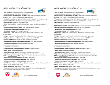 GDZIE MOŻNA CZERPAĆ KORZYŚCI GDZIE MOŻNA CZERPAĆ KORZYŚCI * Golf Harrachov: 10% zniżkę na opłatę za całodzienną grę * Hotel Harrachovka: 20% rabat na usługi wellness * Centrum linowe Proud Harrachov "na Mýtě" : 20% zniżkę na program „Wyzwania i przygody” (min. 6 osób) – rezerwacja z 24h wyprzedzeniem * Przejażdżka na unikalnych rowerach elektrycznych: zniżką 10% dla 4-osobowej grupy * Ekspozycja Šindelka: 60Kč / bilet rodzinny (2 dorosłych i max. 3 dzieci) * Minigolf Tondr : 10% zniżkę dla dorosłych osób * OREA Vital Hotel Sklář: zniżkę 50CZK/godzinę od ceny za wynajęcie tenisowej hali i kortu * Wypożyczalnia terenowych kładów : 20% zniżkę dla dzieci i dorosłych * Wypożyczenie elektrorowera Krkonoše – 10% zniżki * Restauracja Blue Cafe : 50% zniżkę na naleśniki * Restauracja Z : 30% zniżkę na danie główne: „Polędwiczka wieprzowa w sosie brusznicowym” * Kolejka – Sportovní areál Harrachov : 20% zniżkę na bilet tam i z powrotem * Sklep z pamiątkami Eva: 5% znizkę przy zakupach za ponad 1000CZK * Vertical Park Harrachov : zniżkę 50CZK na gigantyczną huśtawkę * Pociąg wycieczkowy do Mumlavskiego wodospadu : 10% zniżki dla rodziny * Wellness Hotel Svornost: 20% rabat na usługi fryzjerskie * Golf Harrachov: 10% zniżkę na opłatę za całodzienną grę * Hotel Harrachovka: 20% rabat na usługi wellness * Centrum linowe Proud Harrachov "na Mýtě" : 20% zniżkę na program „Wyzwania i przygody” (min. 6 osób) – rezerwacja z 24h wyprzedzeniem * Przejażdżka na unikalnych rowerach elektrycznych: zniżką 10% dla 4-osobowej grupy * Ekspozycja Šindelka: 60Kč / bilet rodzinny (2 dorosłych i max. 3 dzieci) * Minigolf Tondr : 10% zniżkę dla dorosłych osób W OKOLICACH HARRACHOVA: W OKOLICACH HARRACHOVA: * Zjeżdżalnia Alpine Coaster w Szklarskiej Porębie : 6 zjazdów w cenie 5 * Basen Liberec : 1 godzina extra gratis * Bozkov Dolomitowe jaskinie: 10% rabat na wstęp dla osób dorosłych * Café Restaurant Radnice w Jilemnici: 20% rabatu na zamówienia w restaurantu * Zjeżdżalnia Alpine Coaster w Szklarskiej Porębie : 6 zjazdów w cenie 5 * Basen Liberec : 1 godzina extra gratis * Bozkov Dolomitowe jaskinie: 10% rabat na wstęp dla osób dorosłych * Café Restaurant Radnice w Jilemnici: 20% rabatu na zamówienia w restaurantu * Eshop: www.topnarty.p l : 20% zniżkę od cen detalicznych nart i butów narciarskich * Muzeum szkła i biżuterii w Jablonci nad Nisou : 20% zniżkę * Muzeum Karkonoskich Rzemiosł w Poniklé: sleva 10% zniżkę * Muzeum mineralogie w Szklarskiej Porębie : 20% zniżkę * PALACE Made in Jablonec nad Nisou: 15% zniżkę na zakupy w sklepie z biżuteria i perłami * Basen i sauna Jilemnice: 25% zniżkę * Basen Jablonec nad Nisou : zniżkę - 10Kč / osoba * Turystyczny resort Pěnčín: 10% zniżkę na zwiedzanie fabryki szklanych paciorków oraz na wycieczkę po koziej farmie z przewodnikiem * Eshop: www.topnarty.p l : 20% zniżkę od cen detalicznych nart i butów narciarskich * Muzeum szkła i biżuterii w Jablonci nad Nisou : 20% zniżkę * Muzeum Karkonoskich Rzemiosł w Poniklé: sleva 10% zniżkę * Muzeum mineralogie w Szklarskiej Porębie : 20% zniżkę * PALACE Made in Jablonec nad Nisou: 15% zniżkę na zakupy w sklepie z biżuteria i perłami * Basen i sauna Jilemnice: 25% zniżkę * Basen Jablonec nad Nisou : zniżkę - 10Kč / osoba * Turystyczny resort Pěnčín: 10% zniżkę na zwiedzanie fabryki szklanych paciorków oraz na wycieczkę po koziej farmie z przewodnikiem www.harrachovcard.cz * OREA Vital Hotel Sklář: zniżkę 50CZK/godzinę od ceny za wynajęcie tenisowej hali i kortu * Wypożyczalnia terenowych kładów : 20% zniżkę dla dzieci i dorosłych * Wypożyczenie elektrorowera Krkonoše – 10% zniżki * Restauracja Blue Cafe : 50% zniżkę na naleśniki * Restauracja Z : 30% zniżkę na danie główne: „Polędwiczka wieprzowa w sosie brusznicowym” * Kolejka – Sportovní areál Harrachov : 20% zniżkę na bilet tam i z powrotem * Sklep z pamiątkami Eva: 5% znizkę przy zakupach za ponad 1000CZK * Vertical Park Harrachov : zniżkę 50CZK na gigantyczną huśtawkę * Pociąg wycieczkowy do Mumlavskiego wodospadu : 10% zniżki dla rodziny * Wellness Hotel Svornost: 20% rabat na usługi fryzjerskie www.harrachovcard.cz