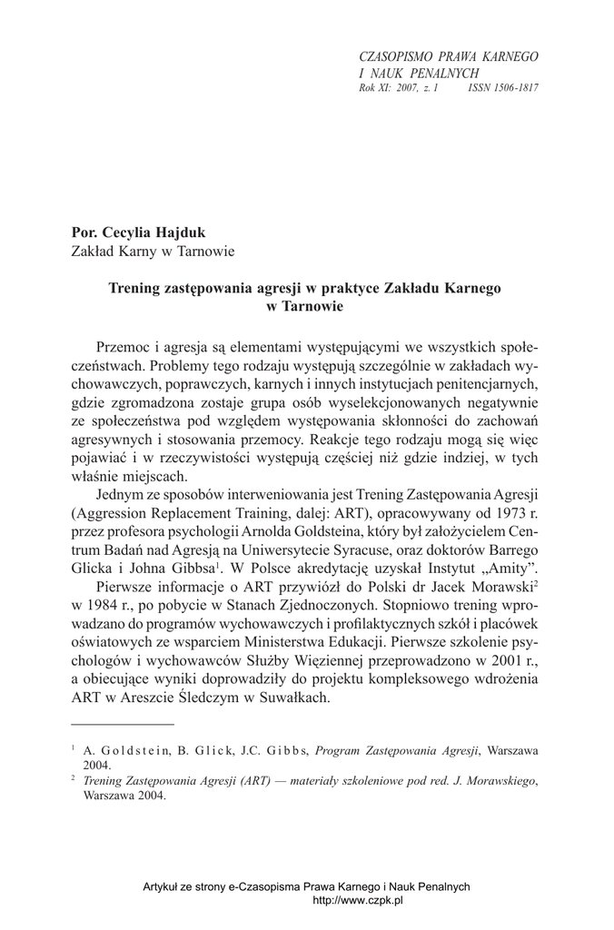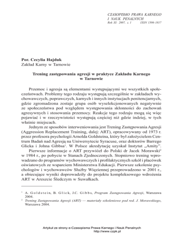 237 PRAWA KARNEGO I NAUK PENALNYCH Trening zastępowania agresji w praktyce Zakładu Karnego w Tarnowie CZASOPISMO Rok XI: 2007, z. 1 ISSN 1506-1817 Por. Cecylia Hajduk Zakład Karny w Tarnowie Trening zastępowania agresji w praktyce Zakładu Karnego w Tarnowie Przemoc i agresja są elementami występującymi we wszystkich społeczeństwach. Problemy tego rodzaju występują szczególnie w zakładach wychowawczych, poprawczych, karnych i innych instytucjach penitencjarnych, gdzie zgromadzona zostaje grupa osób wyselekcjonowanych negatywnie ze społeczeństwa pod względem występowania skłonności do zachowań agresywnych i stosowania przemocy. Reakcje tego rodzaju mogą się więc pojawiać i w rzeczywistości występują częściej niż gdzie indziej, w tych właśnie miejscach. Jednym ze sposobów interweniowania jest Trening Zastępowania Agresji (Aggression Replacement Training, dalej: ART), opracowywany od 1973 r. przez profesora psychologii Arnolda Goldsteina, który był założycielem Centrum Badań nad Agresją na Uniwersytecie Syracuse, oraz doktorów Barrego Glicka i Johna Gibbsa1. W Polsce akredytację uzyskał Instytut „Amity”. Pierwsze informacje o ART przywiózł do Polski dr Jacek Morawski2 w 1984 r., po pobycie w Stanach Zjednoczonych. Stopniowo trening wprowadzano do programów wychowawczych i profilaktycznych szkół i placówek oświatowych ze wsparciem Ministerstwa Edukacji. Pierwsze szkolenie psychologów i wychowawców Służby Więziennej przeprowadzono w 2001 r., a obiecujące wyniki doprowadziły do projektu kompleksowego wdrożenia ART w Areszcie Śledczym w Suwałkach. 1 2 A. G o l d s t e i n, B. G l i c k, J.C. G i b b s, Program Zastępowania Agresji, Warszawa 2004. Trening Zastępowania Agresji (ART) — materiały szkoleniowe pod red. J. Morawskiego, Warszawa 2004. Artykuł ze strony e-Czasopisma Prawa Karnego i Nauk Penalnych http://www.czpk.pl 238 Cecylia Hajduk Jako ciekawostkę warto pamiętać, iż w trakcie wizyty w Polsce autora ART Arnolda Goldsteina, który przybył tu na zaproszenie Ministerstwa Sprawiedliwości, on i towarzyszące mu osoby zostali na Dworcu Głównym w Warszawie obrabowani i pobici przez zorganizowaną grupę napastników. Autor metody mógł więc doświadczyć agresji praktycznie, po latach obcowania z nią w literaturze. Z dłuższej perspektywy ocenił to doświadczenie jako bezcenne dla pracy naukowej i napisał o tym w swojej książce Sprawcy, ofiary i miejsca. ART może być realizowany na wszystkich poziomach prewencji: jako metoda zapobiegania agresywnej przestępczości, jako program resocjalizacji sprawców przestępstw i jako sposób zapobiegania recydywie. Jest programem wszechstronnej interwencji na poziomie poznawczo-behawioralnym. Opiera się na złożeniu wynikającym m.in. z badań A. Badury z 1969 i 1973 r., że agresja jest zachowaniem wyuczonym przez obserwację, naśladowanie, bezpośrednie doświadczenie i powtarzanie. Metoda składa się z trzech komponentów, nakierowanych na trzy główne źródła przestępczości agresywnej: 1) Trening umiejętności społecznych — odpowiada na pytanie „CO ROBIĆ?” — wyniki badań wskazują, że sprawcy agresji nie potrafią zachowywać się właściwie w wielu sytuacjach z powodu braku odpowiednich wzorców społecznego postępowania i brak tych umiejętności zastępują agresją. Trening uczy, jak się zachowywać w sposób przyjęty w społeczeństwie i dający wysokie prawdopodobieństwo osiągnięcia celu bez użycia siły (w tym module występuje ćwiczenie umiejętności, tj. proszenie o pomoc, reagowanie na krytykę, radzenie sobie z oskarżeniem, radzenie sobie z presją, ujawnianie uczuć, unikanie bójek i in.). 2) Trening kontroli złości — wskazuje „CZEGO NIE ROBIĆ” — opiera się na założeniu, że część agresywnych zachowań ma źródło w gwałtownych, niekontrolowanych reakcjach. Trening kontroli złości uczy, jak unikać takich nagłych i impulsywnych reakcji. 3) Trening wnioskowania moralnego — obrazuje „DLACZEGO COŚ ROBIĆ, A CZEGOŚ NIE ROBIĆ?” — ma na celu naukę podejmowania wyborów w sytuacjach będących dylematami moralnymi. Trenujący uczą się dostrzegania motywów kierujących podejmowanymi w życiu decyzjami oraz rozumienia stanów emocjonalnych innych ludzi. Metoda akcentuje, że agresja jest podobna do uzależnienia — są to zachowania powtarzalne, często występujące w długich okresach czasu (podobnie jak ciągi opilcze), dające krótkotrwałe zadowolenie wraz z długotrwałymi negatywnymi następstwami, trudne do kontrolowania w chwili odczucia Artykuł ze strony e-Czasopisma Prawa Karnego i Nauk Penalnych http://www.czpk.pl Trening zastępowania agresji w praktyce Zakładu Karnego w Tarnowie 239 impulsu do agresywnego zachowania się, związane z utratą zdrowia i innych cennych wartości, takich jak np. wolność, zdrowie. Podobnie jak człowiek uzależniony uczy się zachowań abstynenckich, tak osoba agresywna może nauczyć się innego niż agresywny sposobu reagowania w odpowiedzi na prowokujące ją w otoczeniu bodźce. ART jest uważany za metodę z wyboru w resocjalizacji przestępców, co oznacza, że zostaje przedstawiony jako pewna oferta resocjalizacyjna. Skazani mówią przecież często, że: „wy w więzieniu nic z nami nie robicie, abyśmy byli lepsi po wyjściu na wolność”. Wówczas, w odpowiedzi na takie zarzuty, zapraszamy chętnych do udziału w treningu. Efektywność metody jest uzależniona ściśle od postawy zainteresowanych i ich zaangażowania w ćwiczenia, a także od znajomości metody w środowisku. Im więcej osób wie, na czym polega trening i rozumie potrzebę ćwiczenia umiejętności także po zakończeniu zajęć, tym większa jest szansa na trwałą zmianę postawy skazanego. Dlatego, jak wspomniano wcześniej, w zakładzie karnym w Suwałkach treningiem objęto znaczną część kadry penitencjarno-ochronnej w celu przygotowania jej do wspó